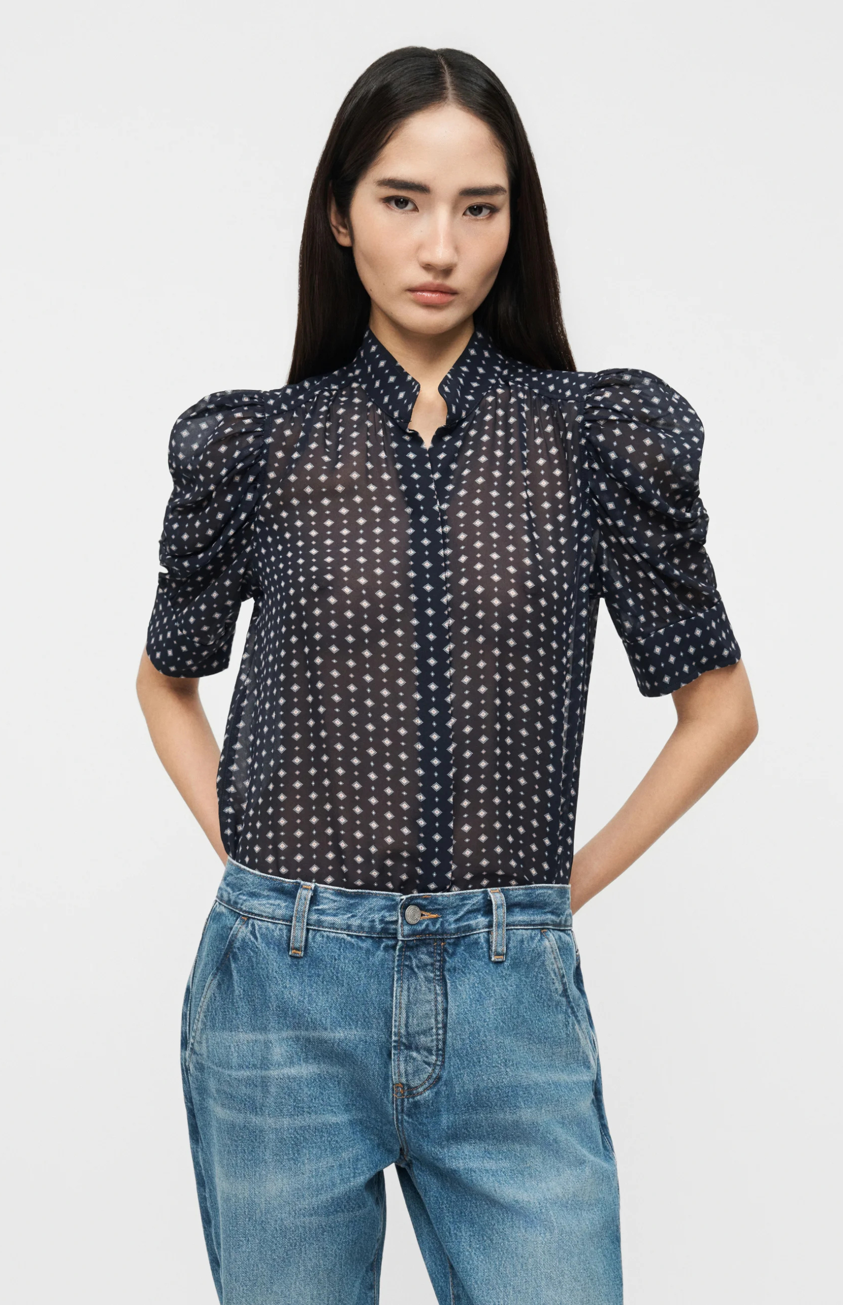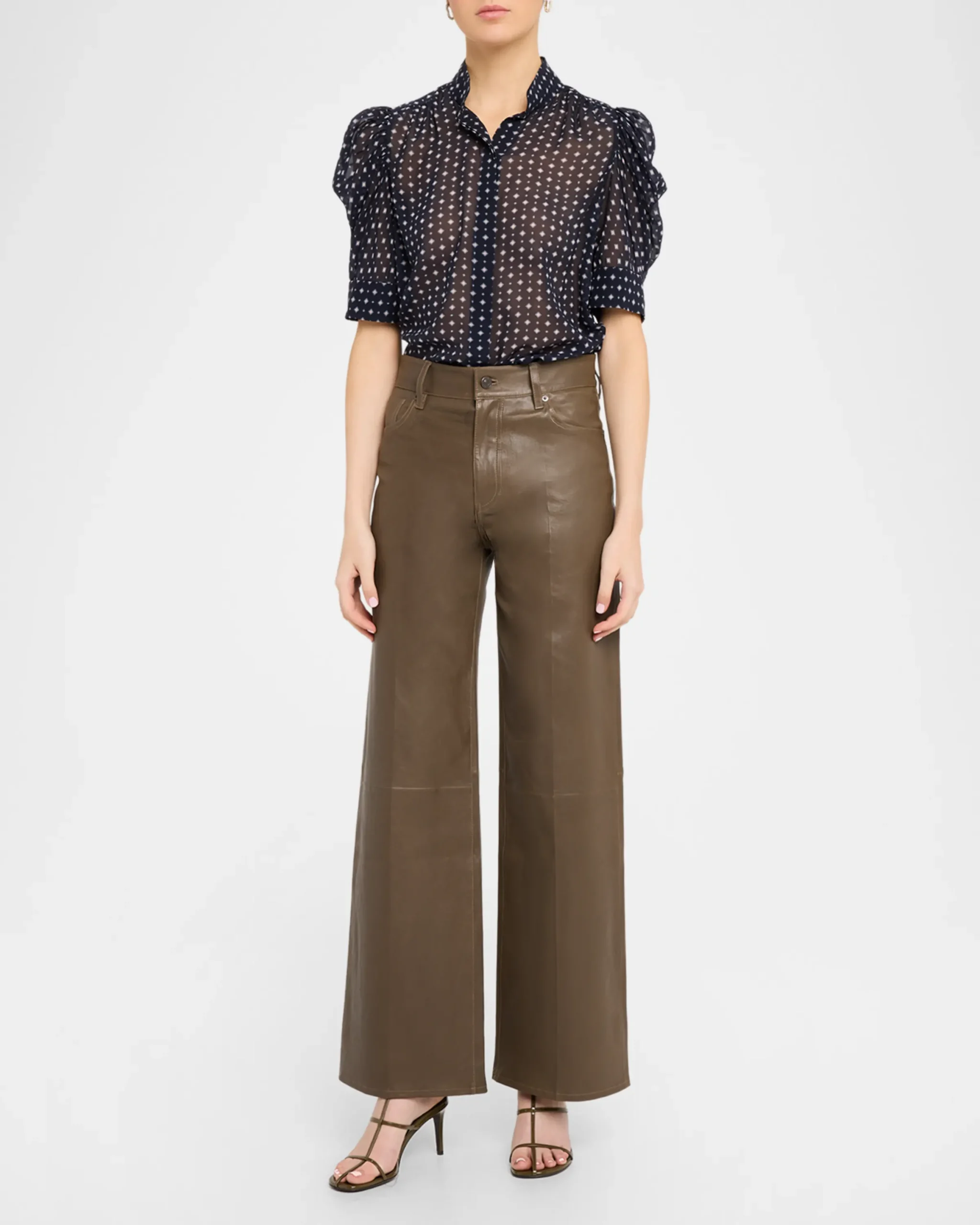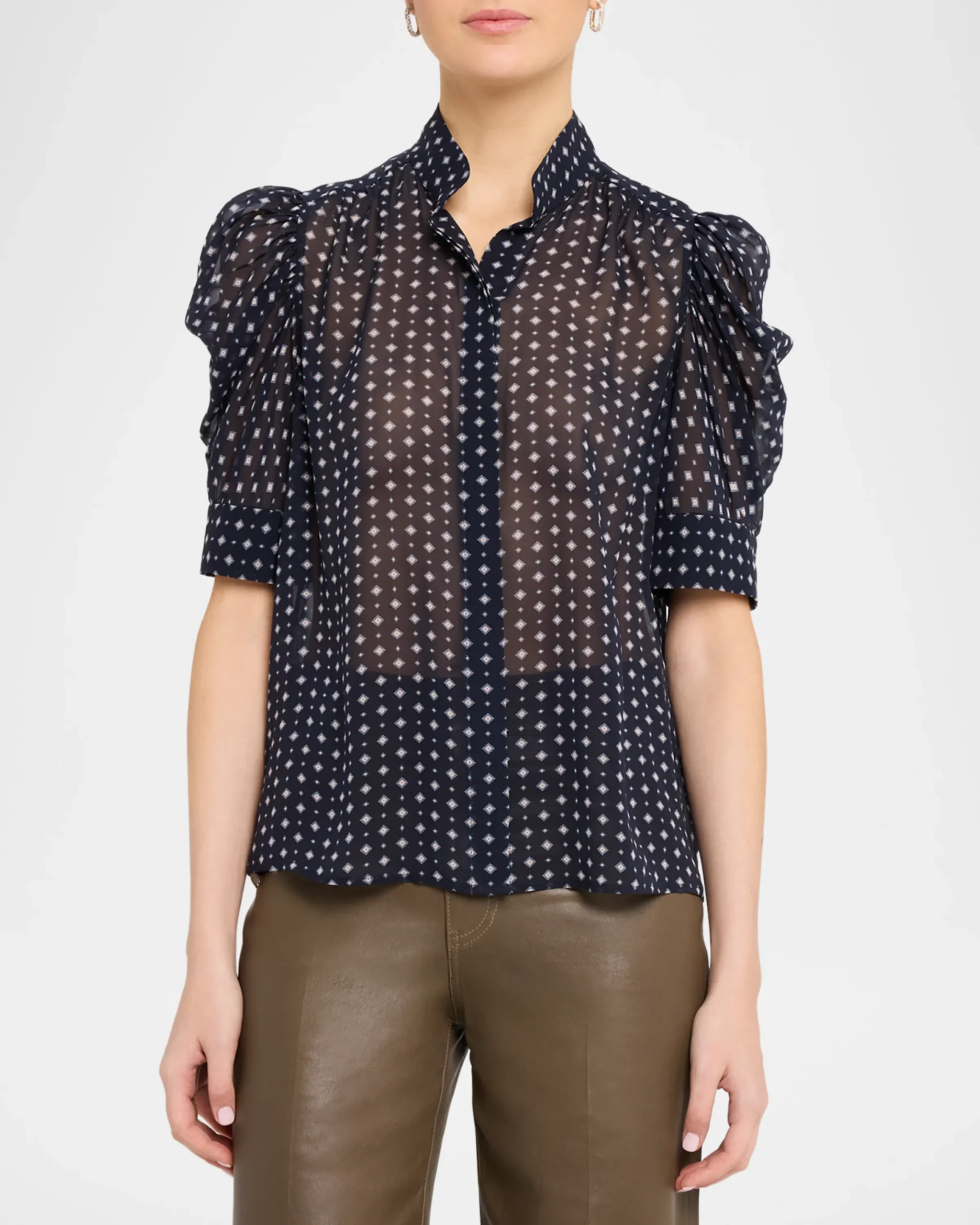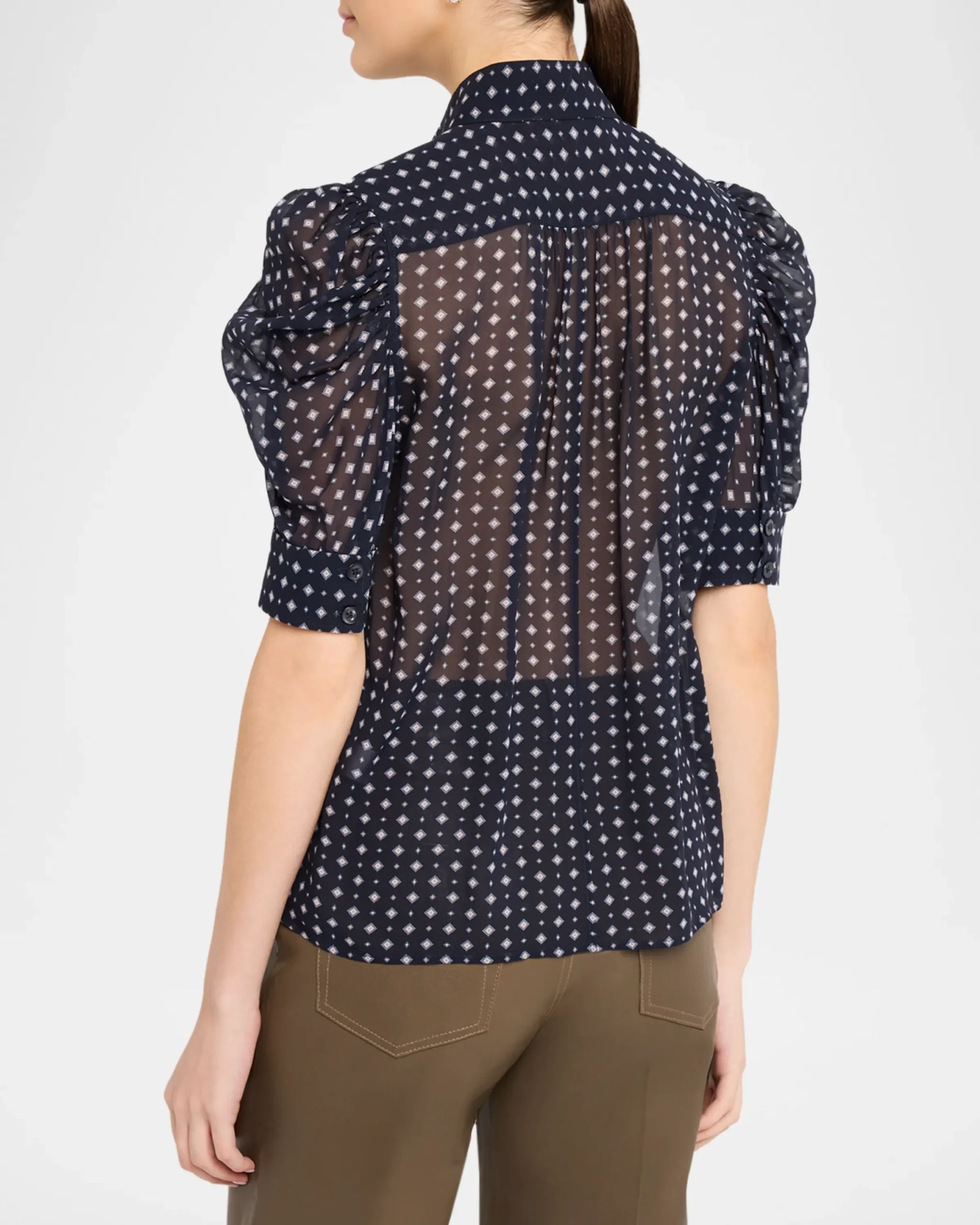 Adorned with a tie-inspired print, the “Gillian” blouse is crafted from luxurious silk and showcases ruched sleeves for a modern, feminine silhouette.