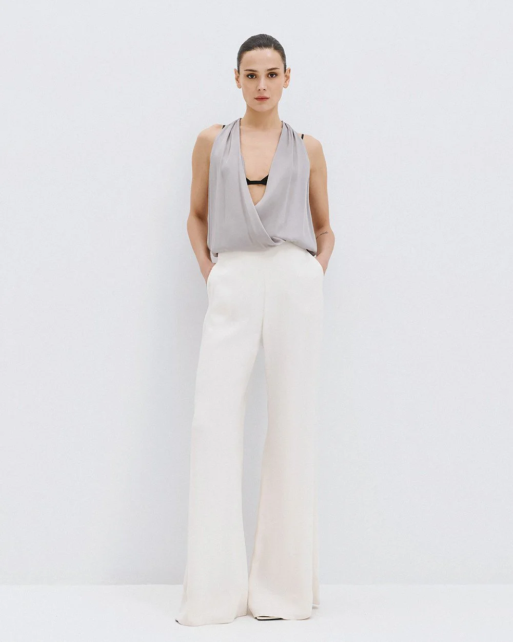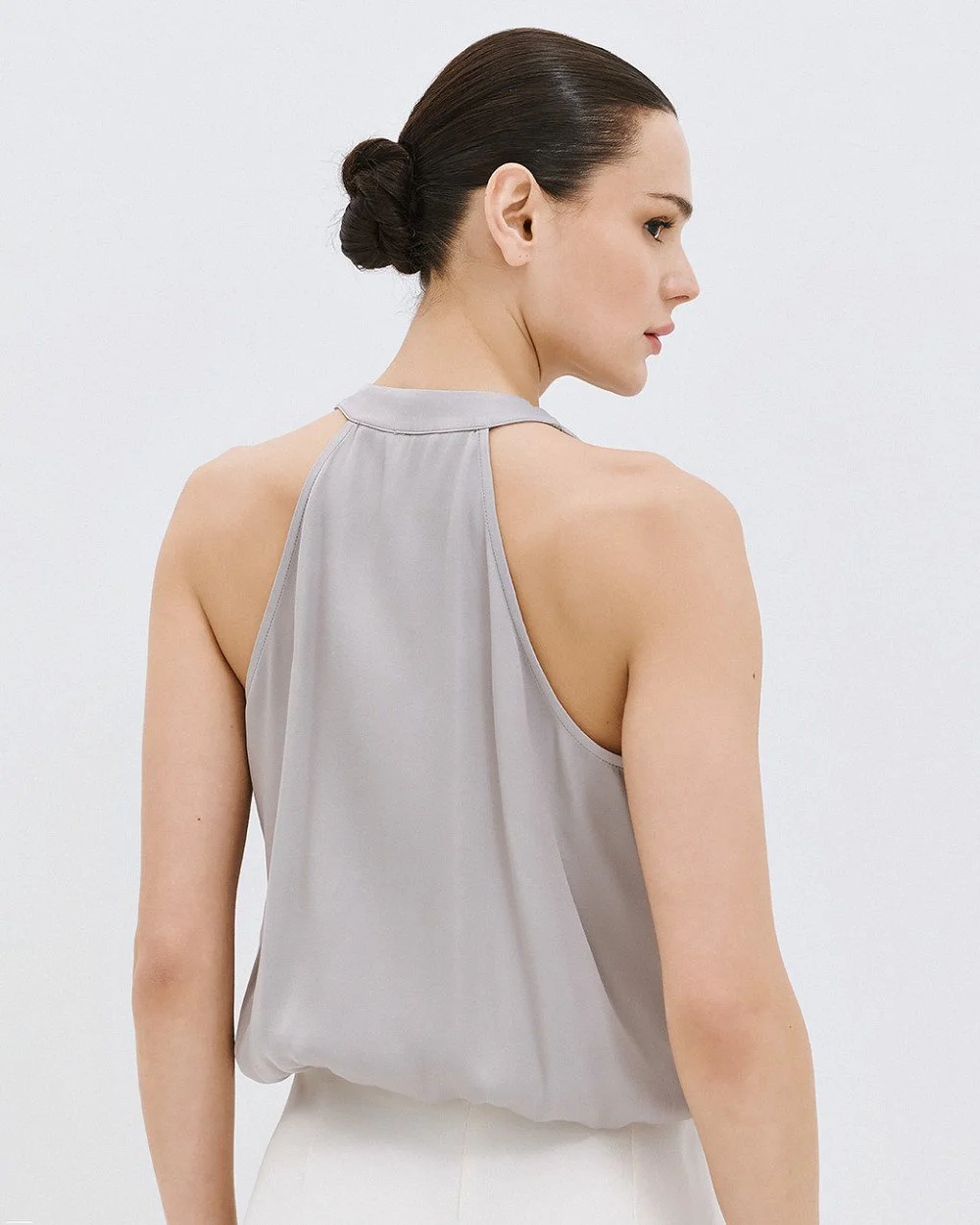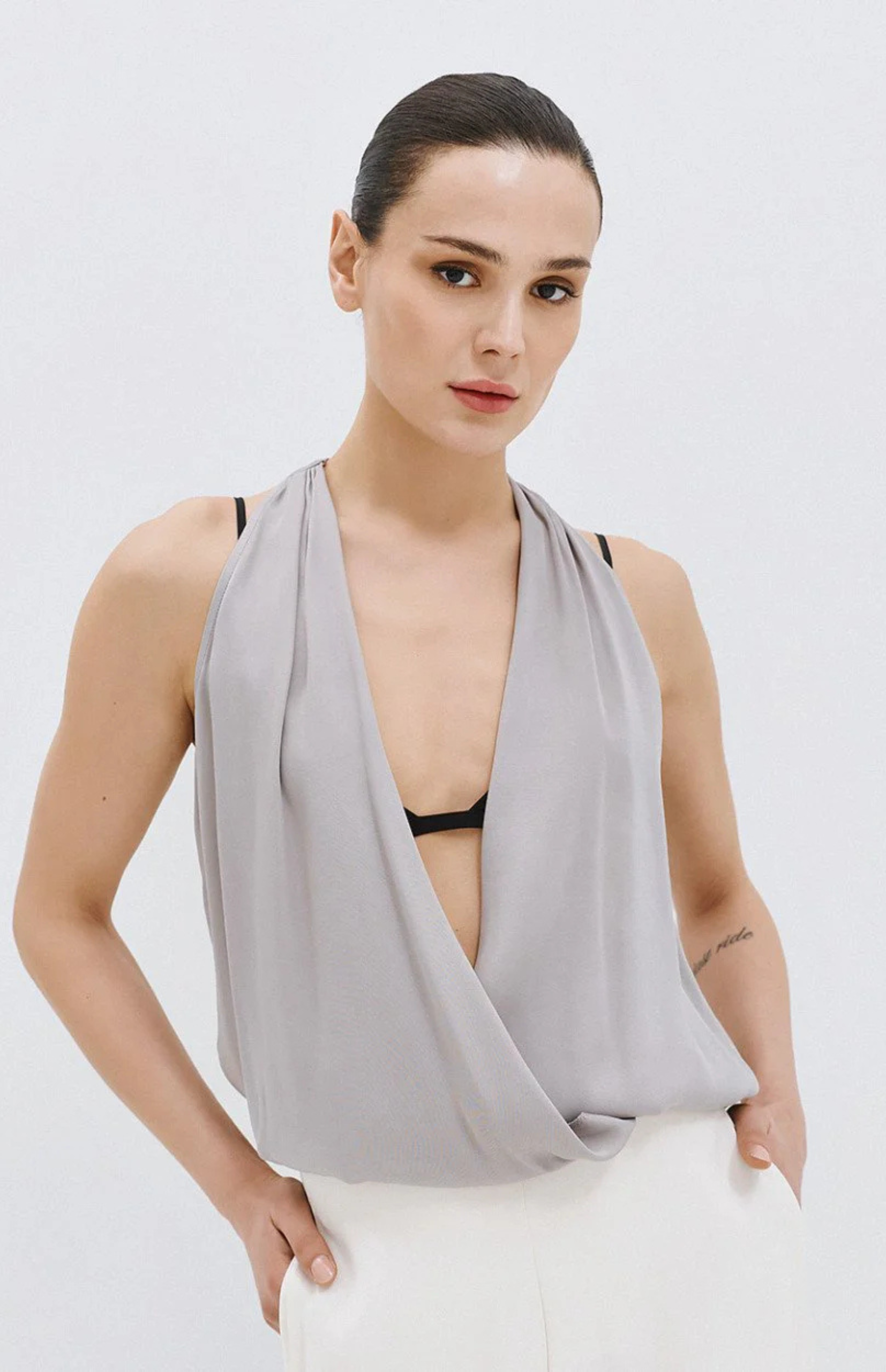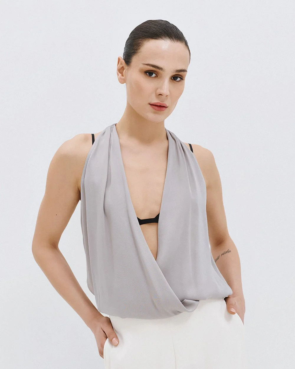 Halter wrap blouse with a satin finish and elasticated hem.