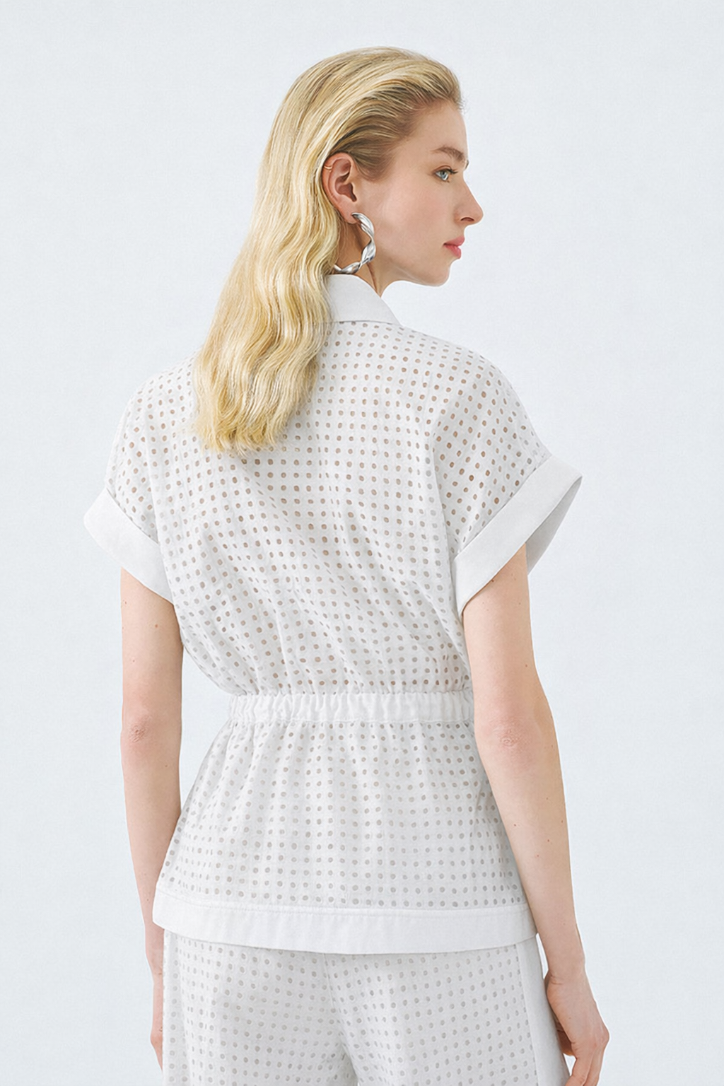 Effortlessly refined, the Hannah Top is crafted from breathable 100% cotton in a beautifully textured eyelet finish. Designed with a modern utility-inspired silhouette, it features a structured collar, button-down front, and oversized chest pockets for a polished yet relaxed feel. The soft cinched waist with adjustable drawstring creates a flattering shape, while the cap sleeves add an easy, contemporary touch. Lightweight and airy, this piece transitions seamlessly from day to evening, offering both comfort and elevated style.
