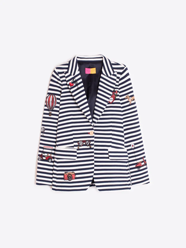 Navy and white striped sailor jacket with positioned illustrations. Features a classic lapel, single-button closure, and front pockets. The model is 1.78m tall and wears a size 4.