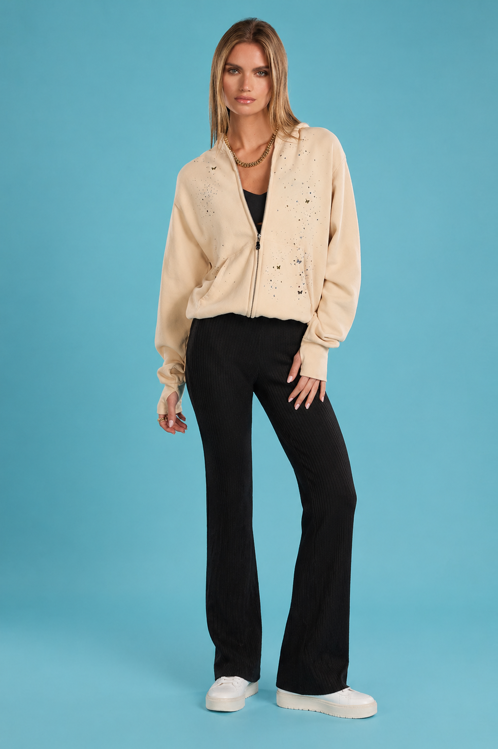 Effortlessly relaxed with a touch of sparkle, this zip-up cardigan is designed for both comfort and style. Crafted in a soft, lightweight fabric, it features a slightly oversized silhouette with a casual drape that flatters the body. The front zip closure allows for versatile styling—wear it open or closed for different looks.