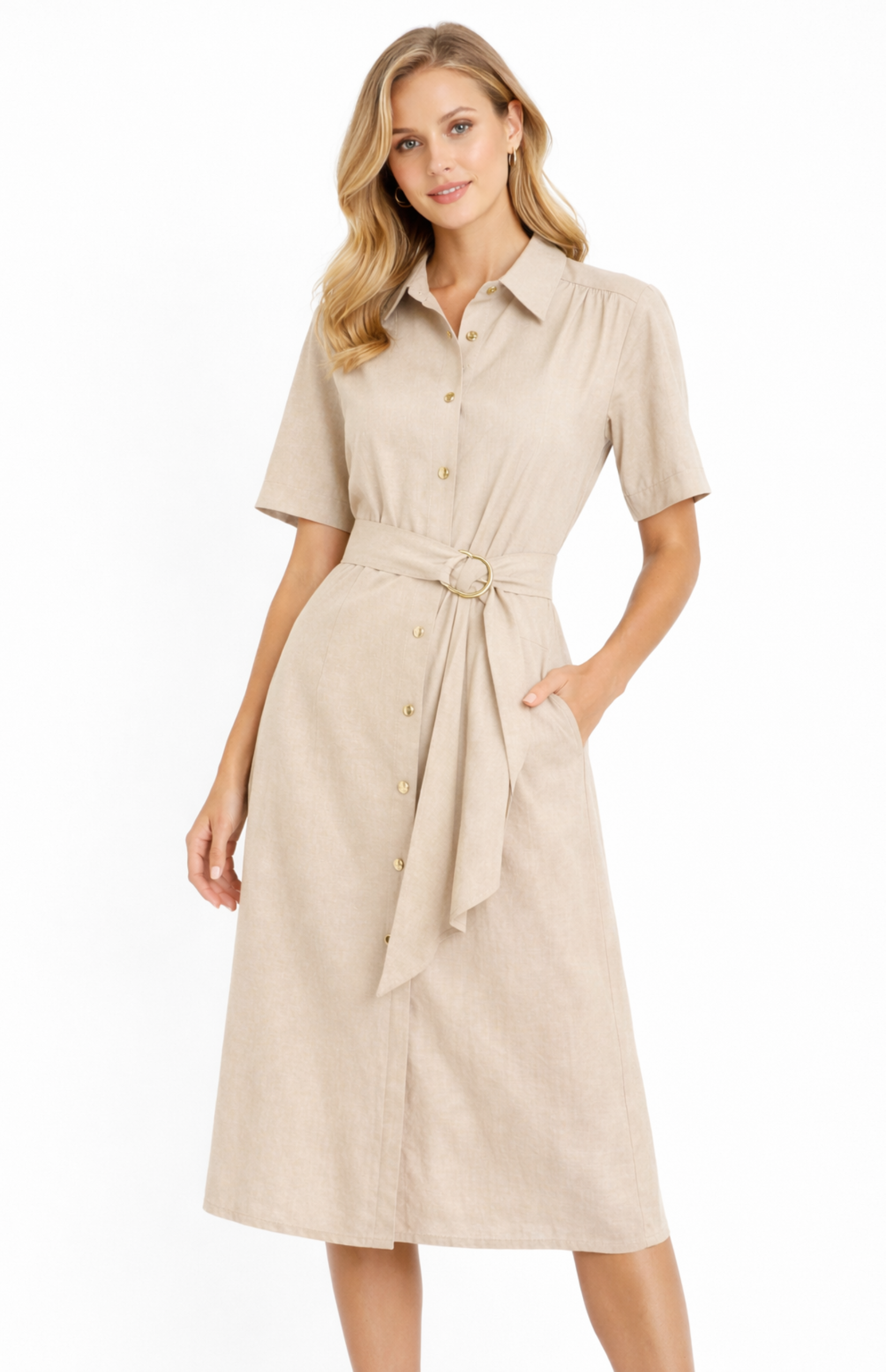 Crafted in a lightweight fabric with a subtle natural texture, the silhouette is tailored through the bodice and softly drapes through the skirt for a flattering, easy fit. A classic shirt collar and full button front add structure, while the self-tie belt with gold hardware defines the waist with an elevated finish.
