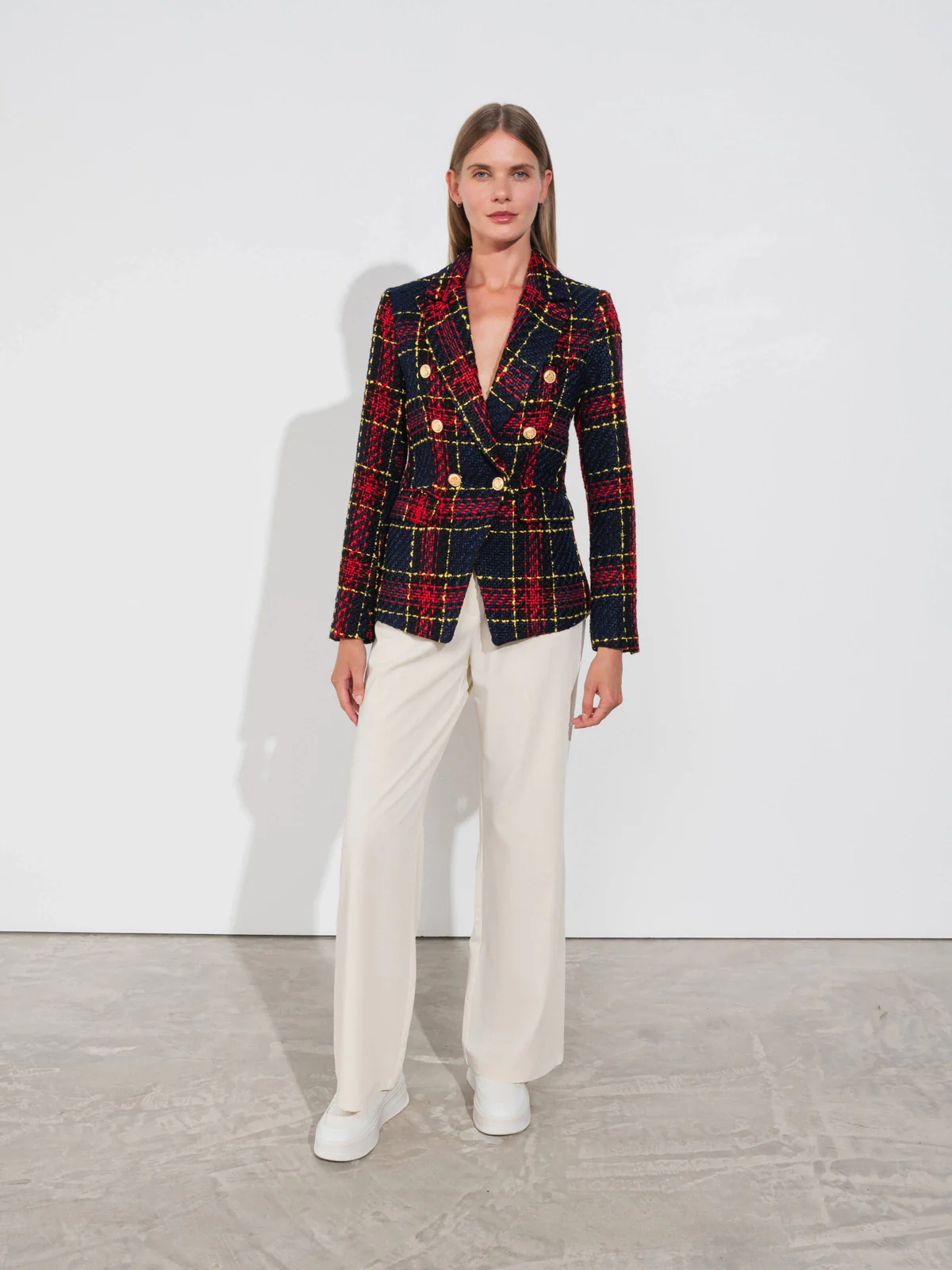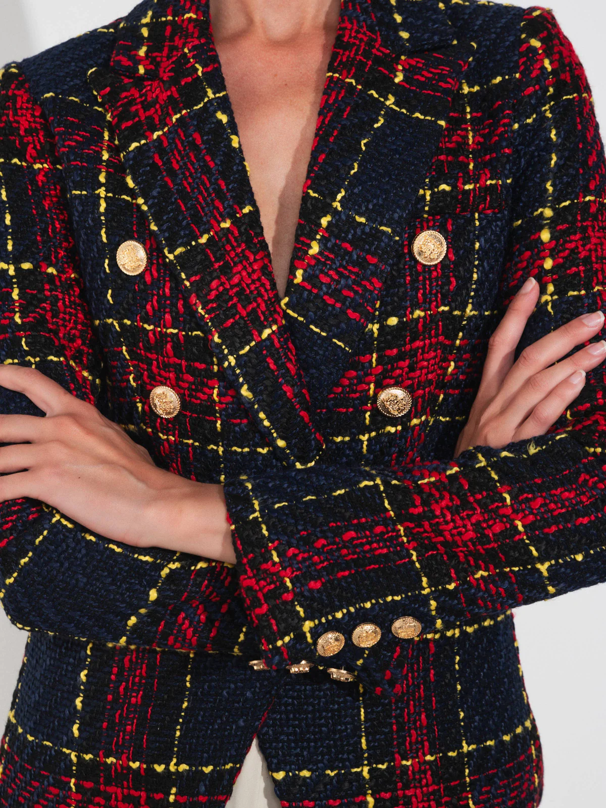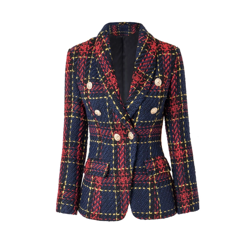 This autumn-ready retro plaid tweed suit showcases timeless elegance with a modern slim-fit cut. The double-breasted jacket is tailored with precision, highlighting a flattering silhouette that balances classic style and contemporary edge. Crafted from textured tweed, the fabric offers both warmth and sophistication, making it ideal for seasonal layering. Subtle detailing and structured lines enhance its versatility, whether styled for office wear, city outings, or evening gatherings. A perfect piece for those who appreciate retro charm, tailored craftsmanship, and chic transitional fashion.