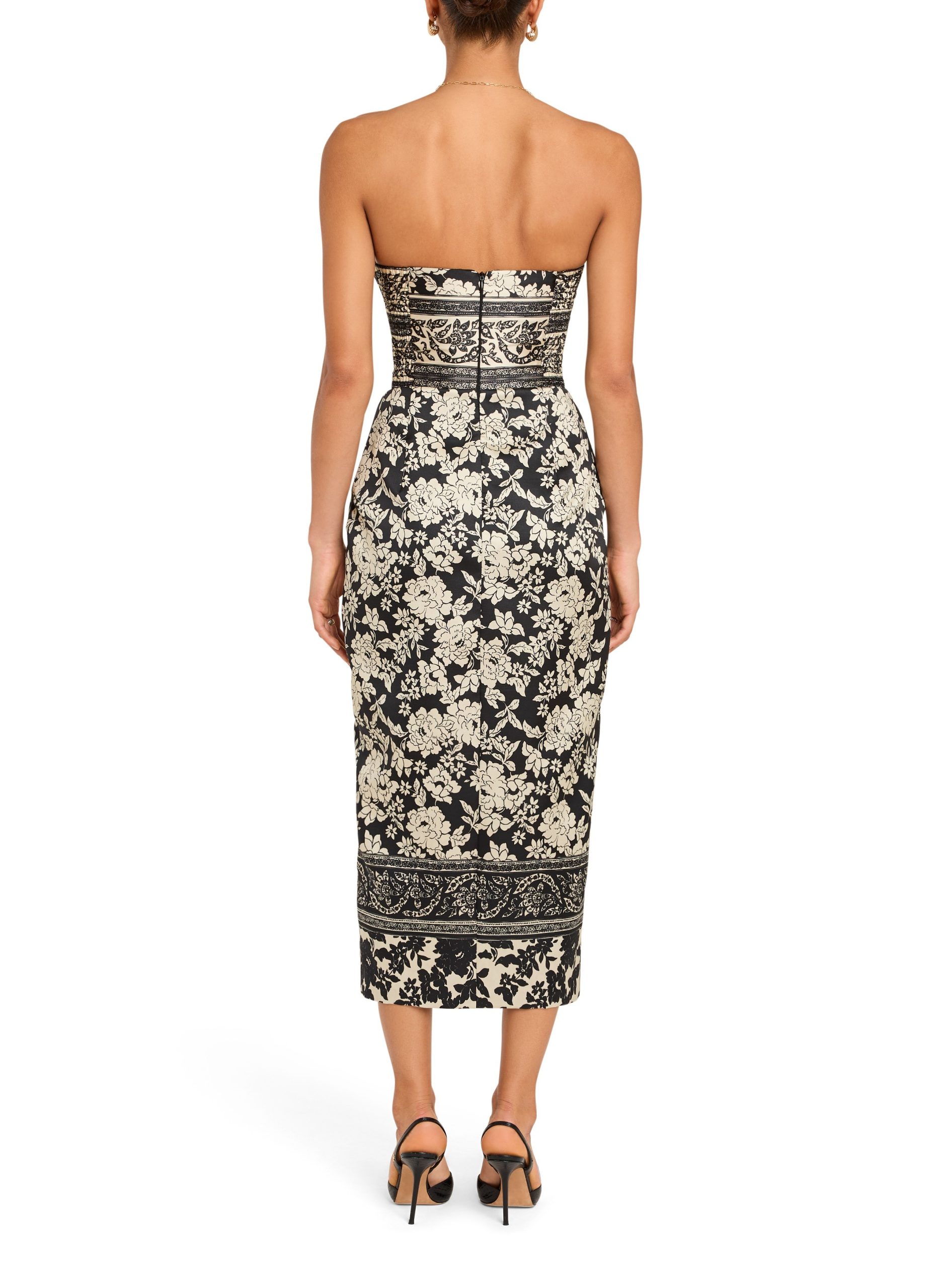 Sophisticated and striking, the Ivy Dress is designed for modern elegance with a timeless edge. Crafted in a black and ivory floral jacquard, this strapless silhouette highlights the neckline while the fitted bodice and defined waist create a flattering, feminine shape. A front slit adds movement and allure, balancing classic refinement with contemporary appeal.