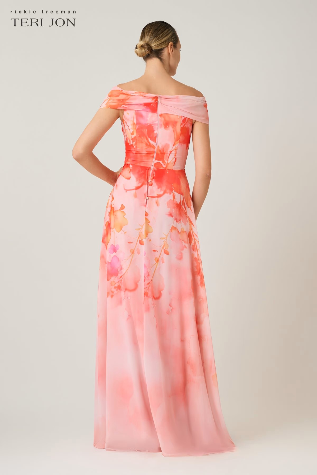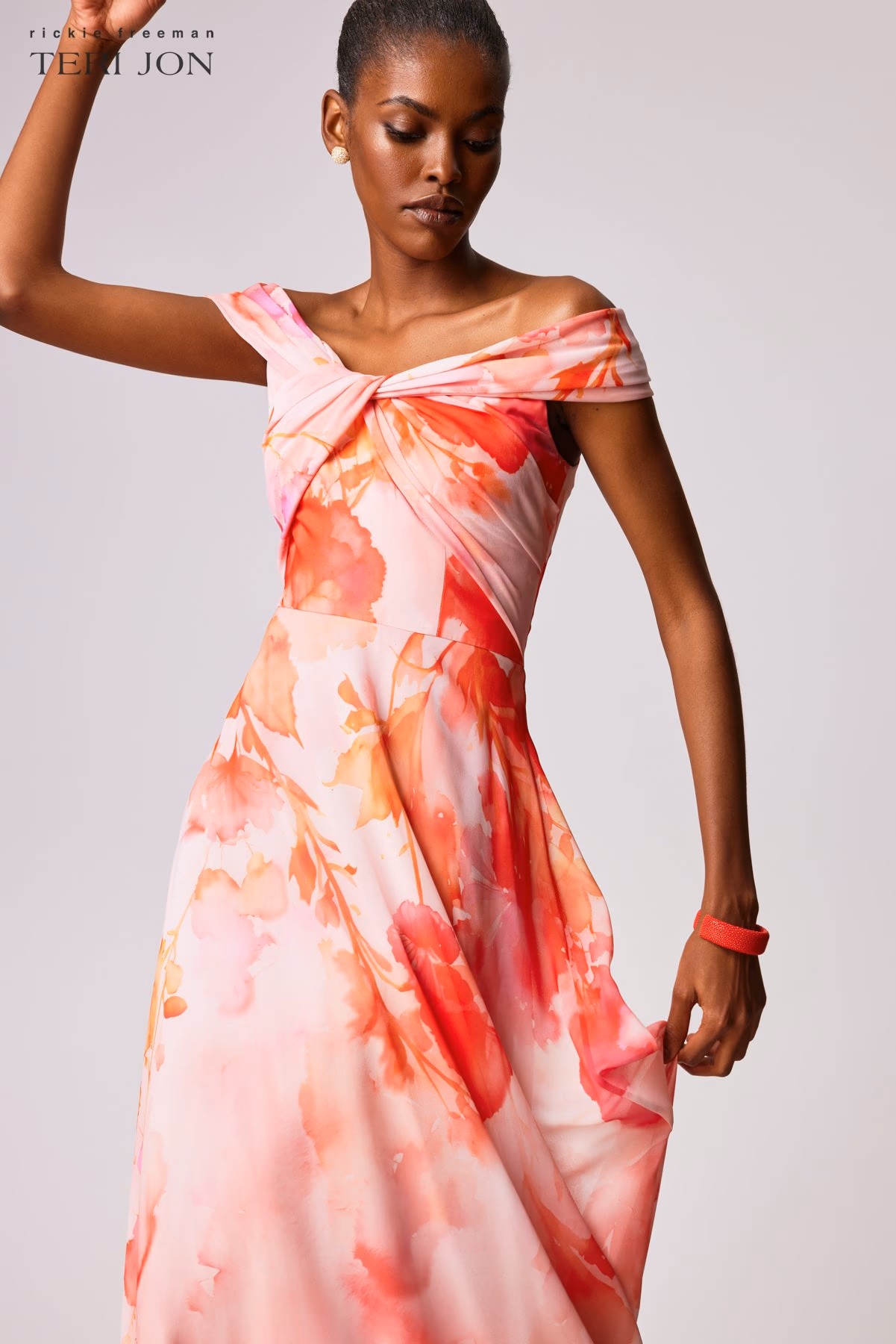 Make a romantic statement in this chiffon off the shoulder twist gown, designed in a soft coral floral print that feels light and fluid. The twisted bodice and gently draped neckline create an elegant focal point, complemented by delicate cap sleeves that frame the shoulders beautifully. Flowing to a floor length A line silhouette, this gown moves effortlessly with every step while offering a flattering, feminine shape. Ideal for formal weddings, garden galas, and evening celebrations that call for graceful sophistication.