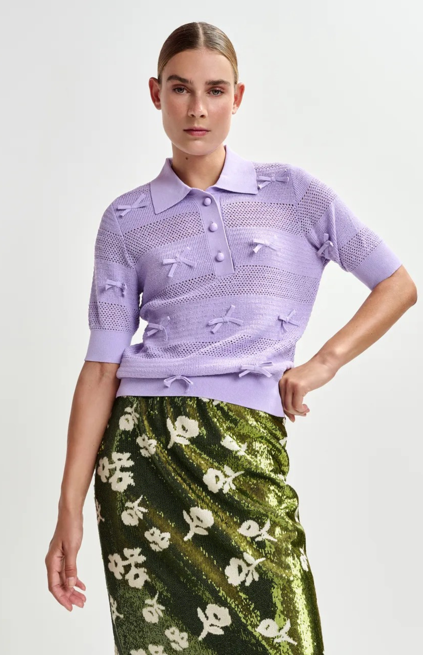 Charming knit polo top is crafted from fine recycled polyester. It features a relaxed fit, tonal button fastening, and ribbed trims for a polished look. The 3/4 sleeves and delicate bow embellishments add a feminine detail, making it perfect for layering or wearing on its own.