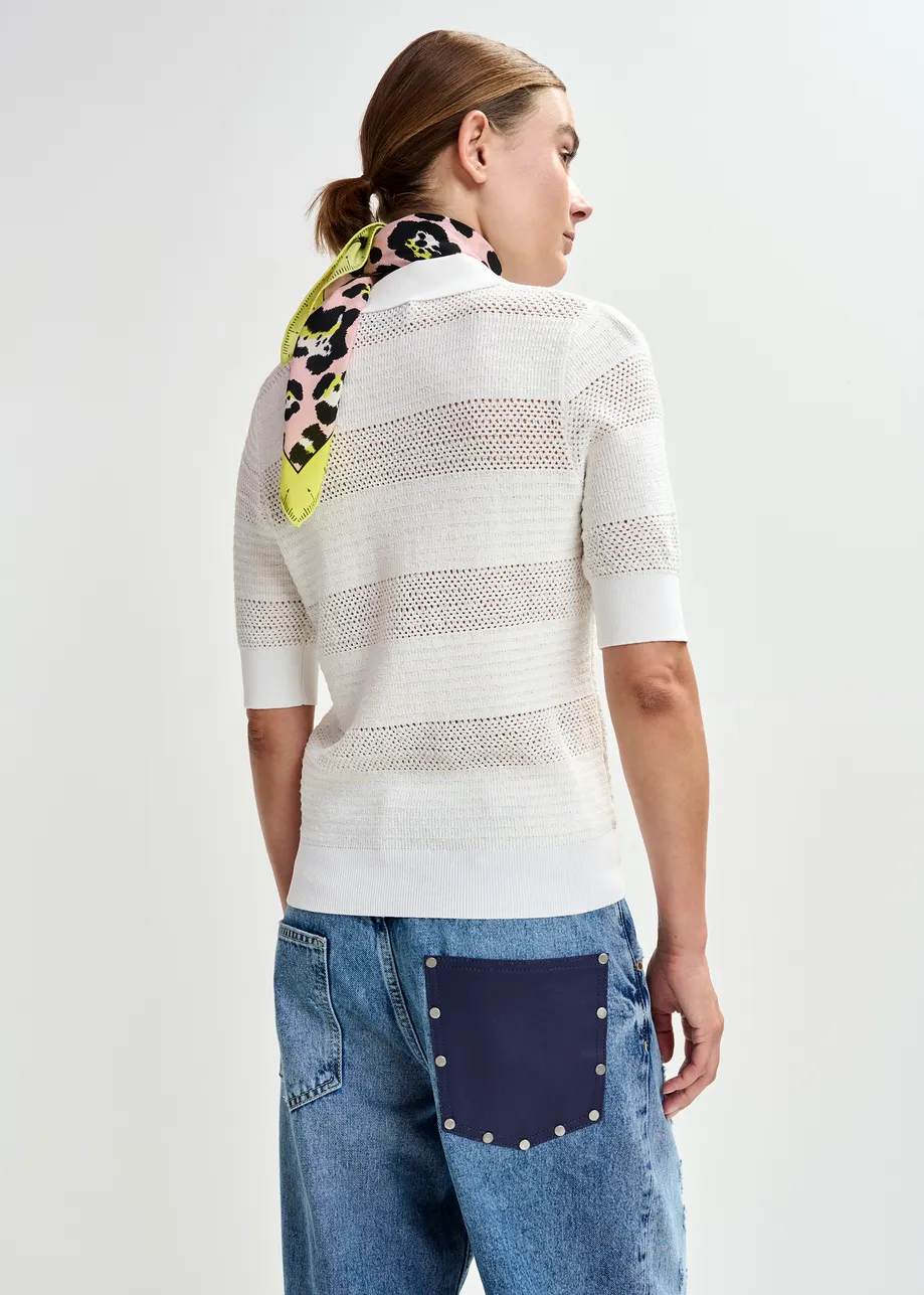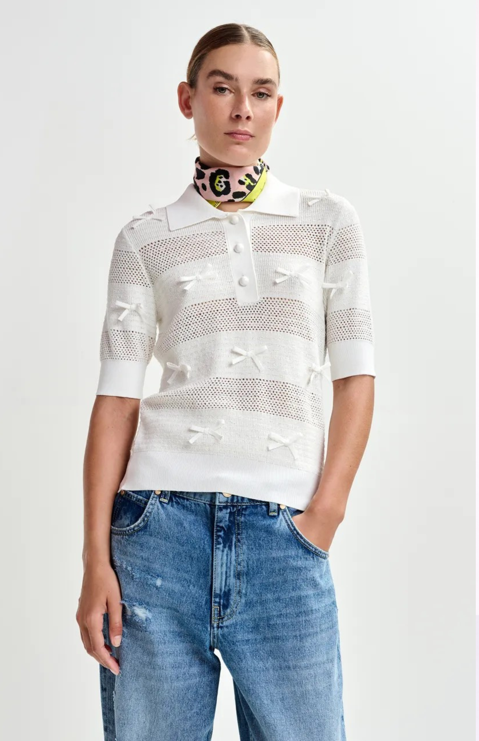 Charming knit polo top is crafted from fine recycled polyester. It features a relaxed fit, tonal button fastening, and ribbed trims for a polished look. The 3/4 sleeves and delicate bow embellishments add a feminine detail, making it perfect for layering or wearing on its own.