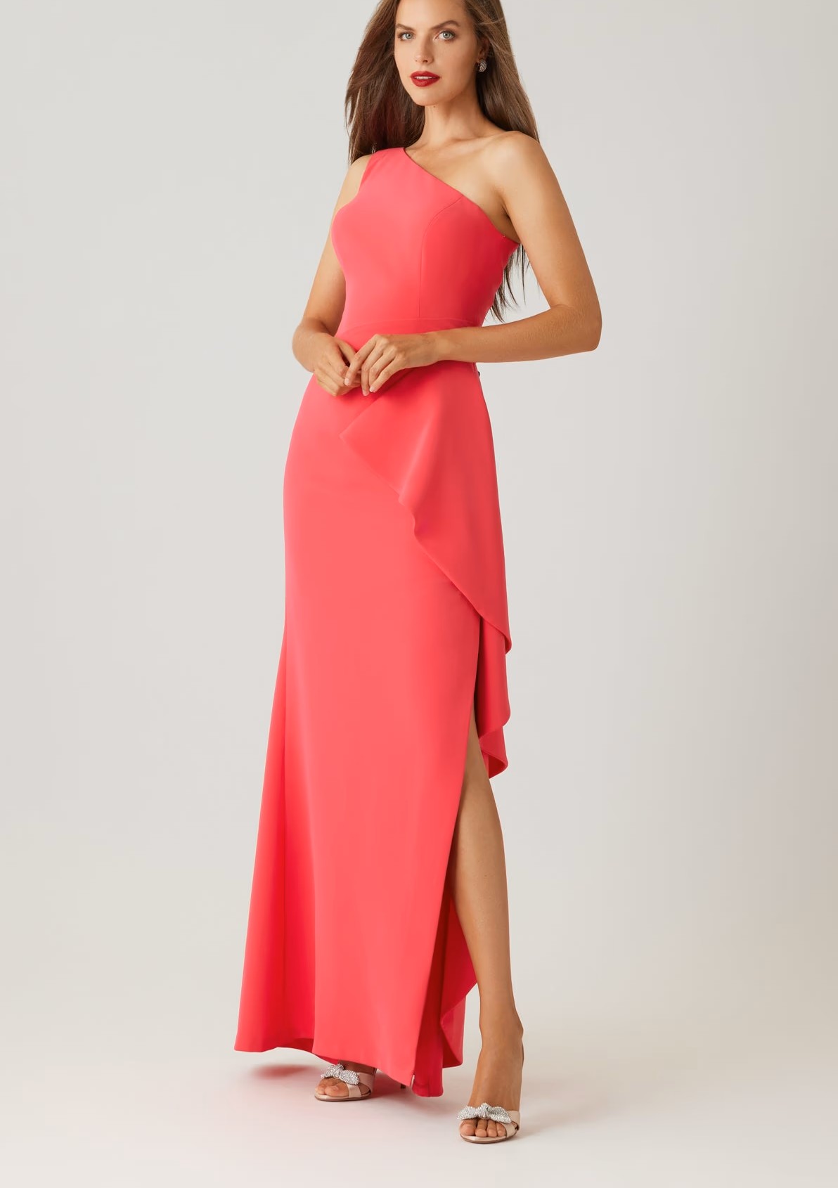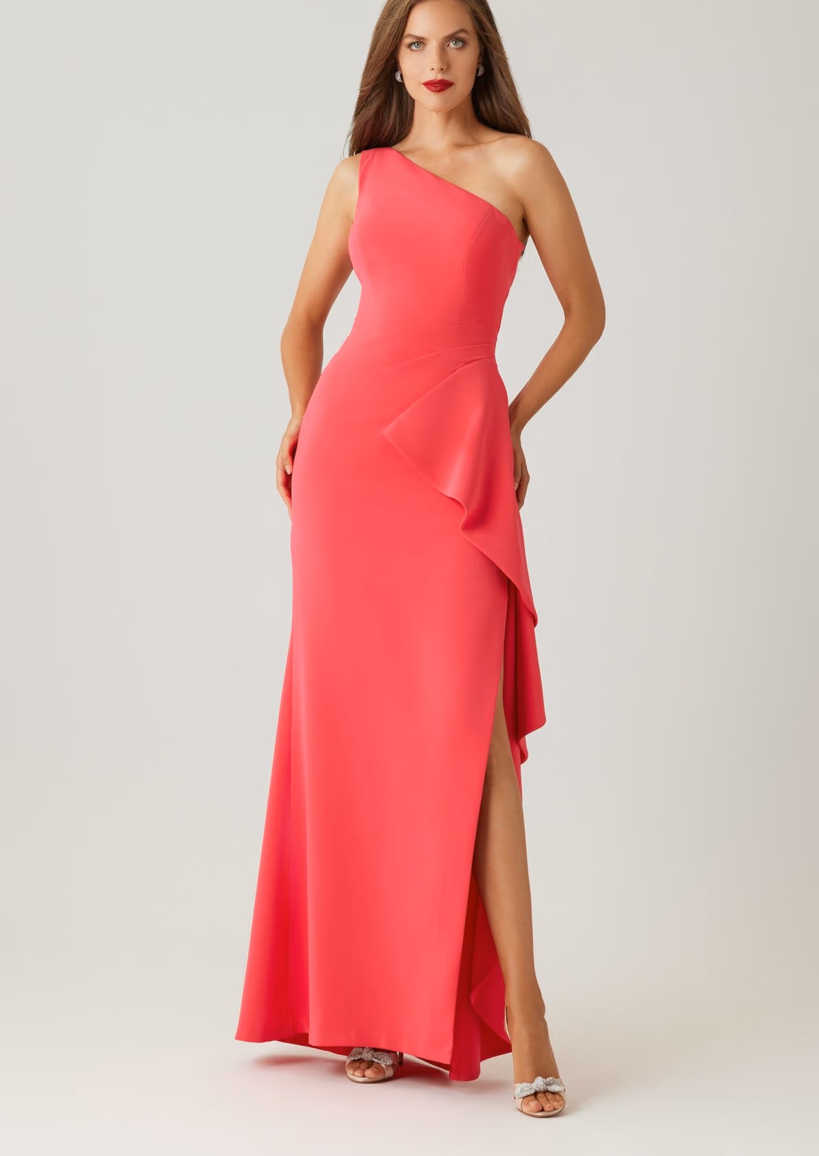 Make an elegant entrance in this refined crepe gown, crafted in a smooth, fluid fabric that drapes beautifully with a polished finish. The asymmetrical one shoulder neckline creates a modern, streamlined look, while the cascading side ruffle adds soft movement and flattering dimension at the waist. Designed in a sleek floor length silhouette with a subtle front slit, this style elongates the figure with effortless sophistication. Perfect for formal weddings, evening galas, and black tie celebrations where understated drama makes a lasting impression.
