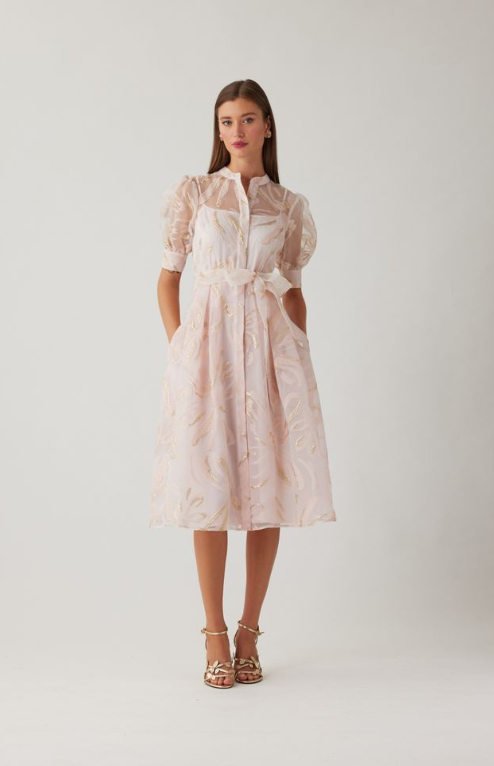 Softly luminous and effortlessly elegant, this blush gold dress is crafted in sheer metallic organza for a refined, airy finish. The mandarin collar and illusion neckline lend a polished, modern touch, while short puff sleeves add subtle volume and femininity. A removable sash defines the waist, flowing into a tea length A line skirt that moves gracefully with every step. Perfect for daytime weddings, garden celebrations, and elevated special occasions.