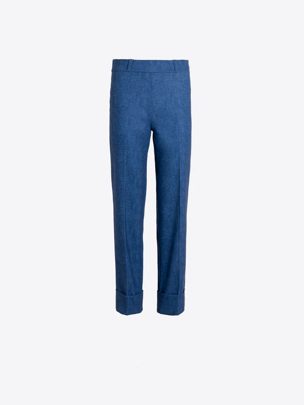 Women’s trousers made from textured blue knit fabric. Waistband with belt loops. Matching jacket with botanical embroidery.