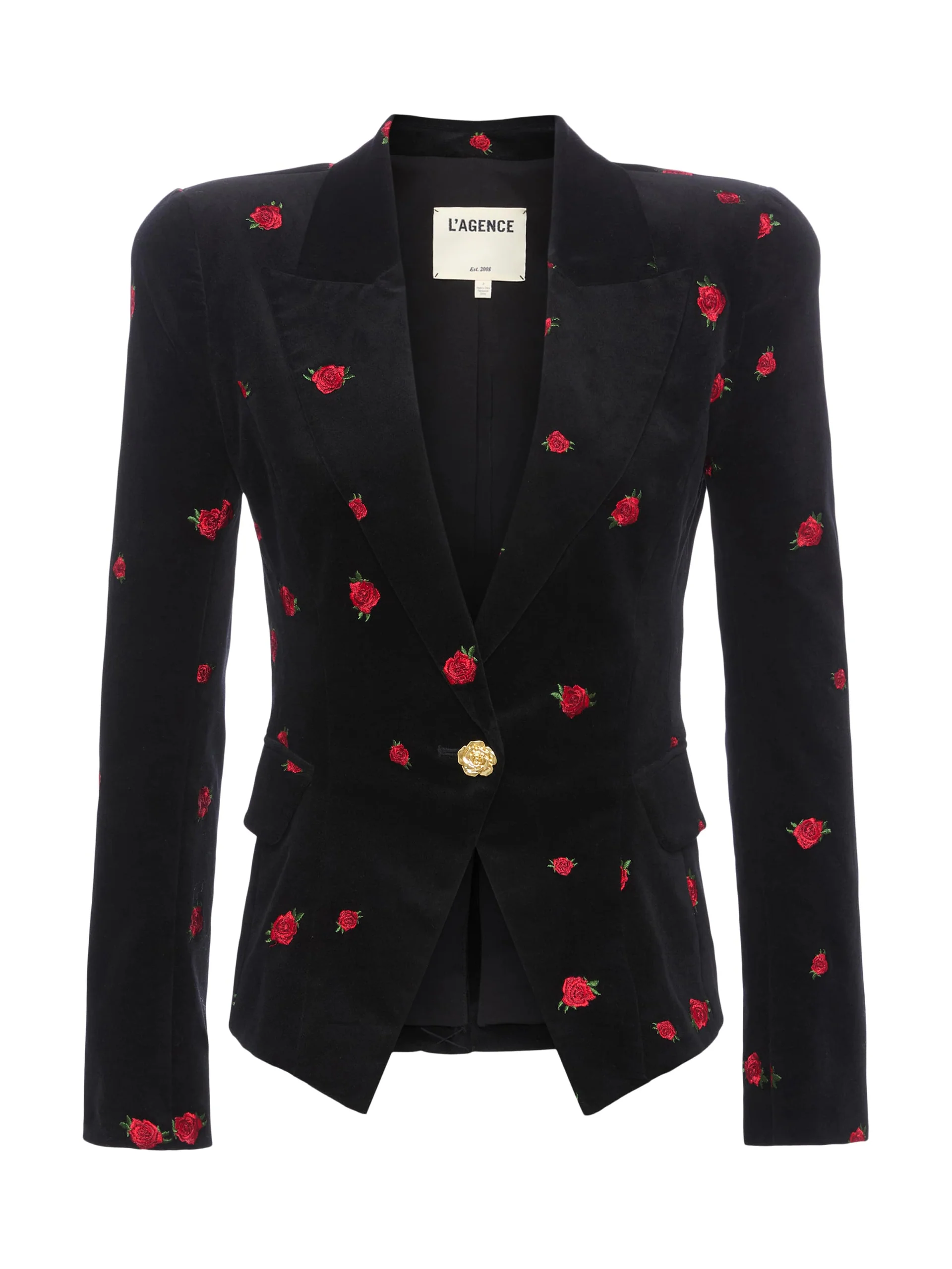 The Kaisley gets a romantic twist in this luxe black velvet edition, embroidered all over with delicate red roses. The sleek, tailored cut keeps the silhouette sharp and feminine, while the gold floral button adds a touch of elegance. Bold yet refined, it’s the perfect statement layer for nights out.