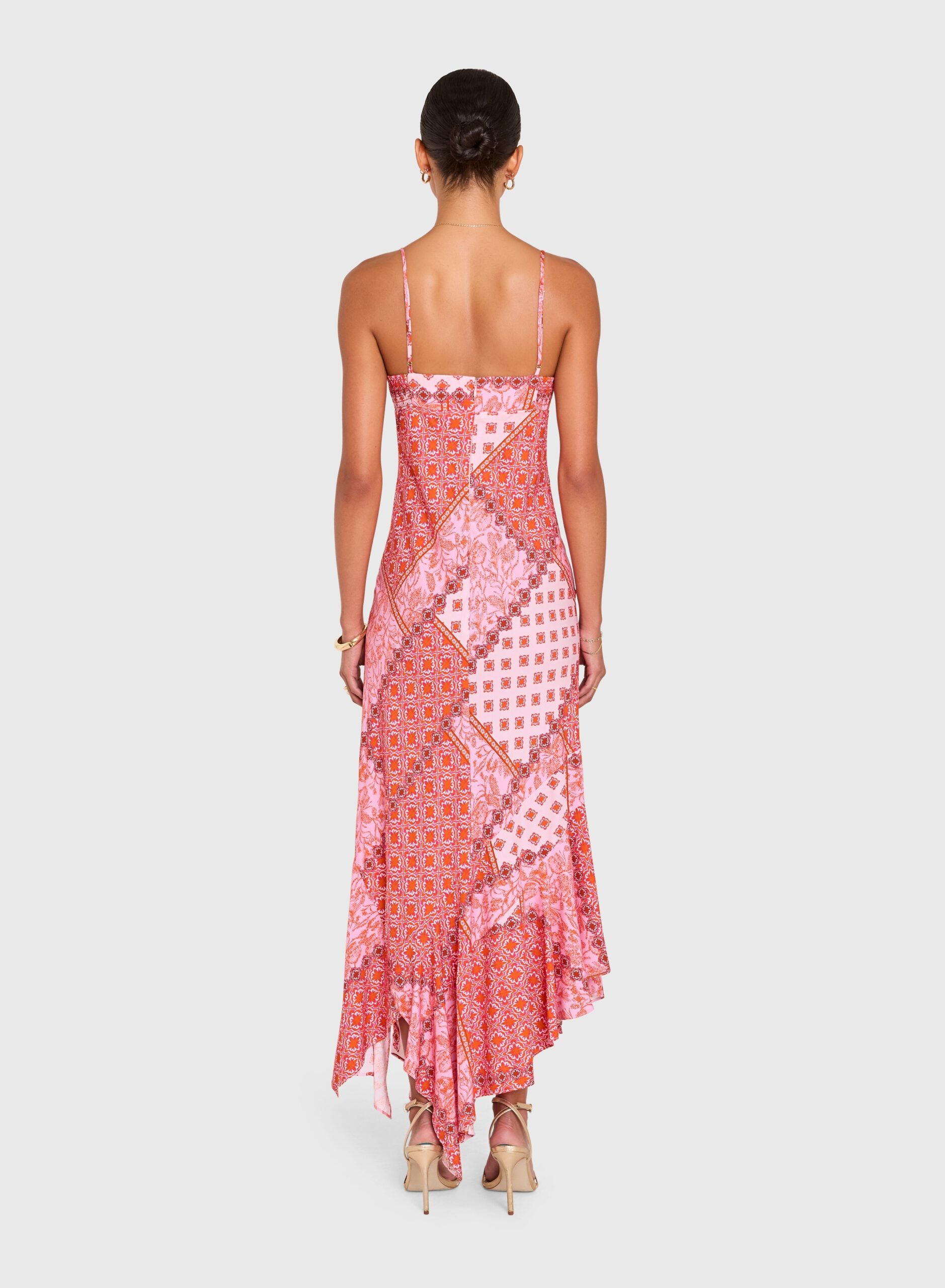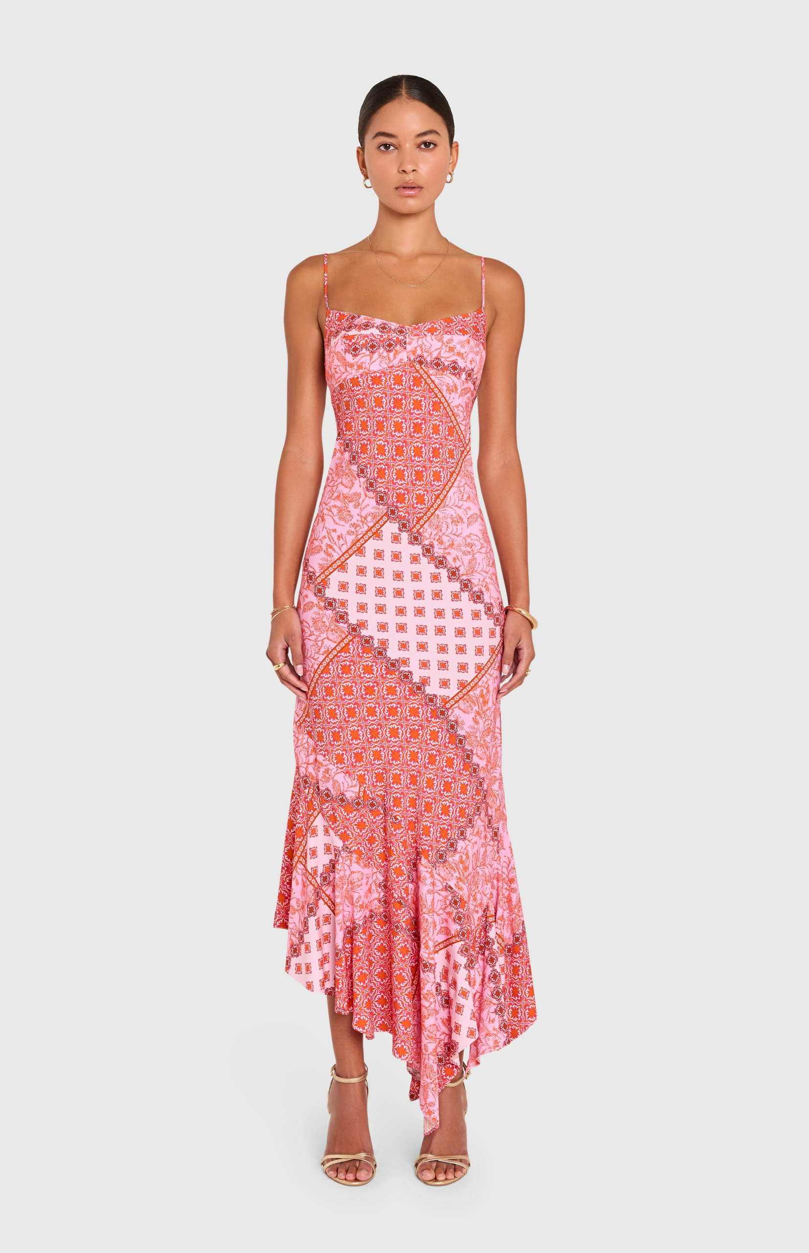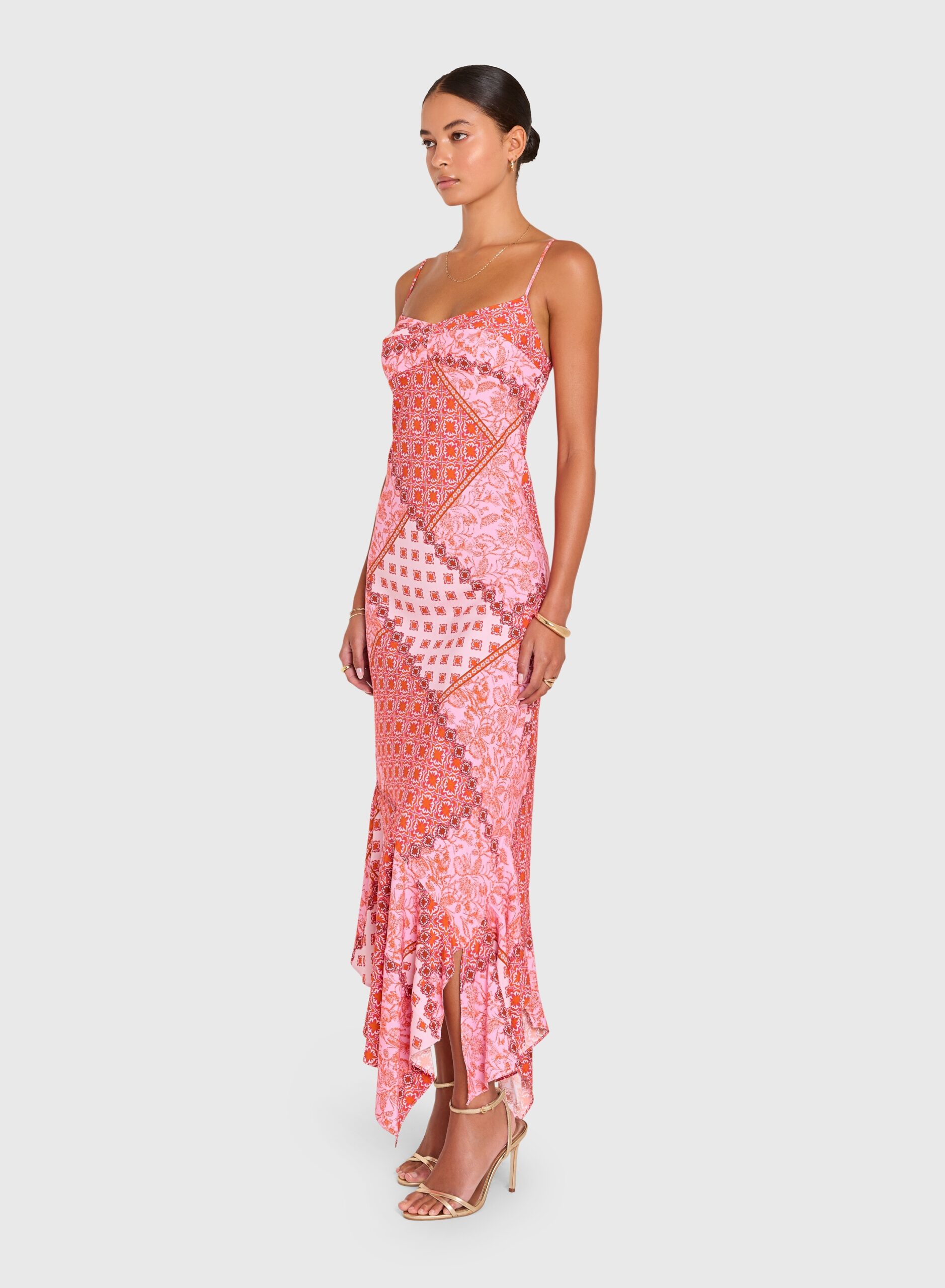 Sleeveless fitted slip dress in a full-length silhouette w/ asymmetric hanky hem