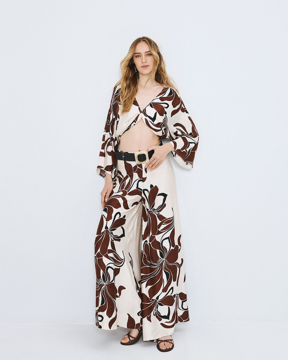 Bold and effortlessly chic, this twist front crop blouse makes a statement with its striking abstract floral print. Designed in a soft cream base with rich brown and black detailing, it features a flattering deep V-neckline and a front twist knot that enhances the silhouette. The cropped length pairs perfectly with high-waisted bottoms for a balanced, modern look.