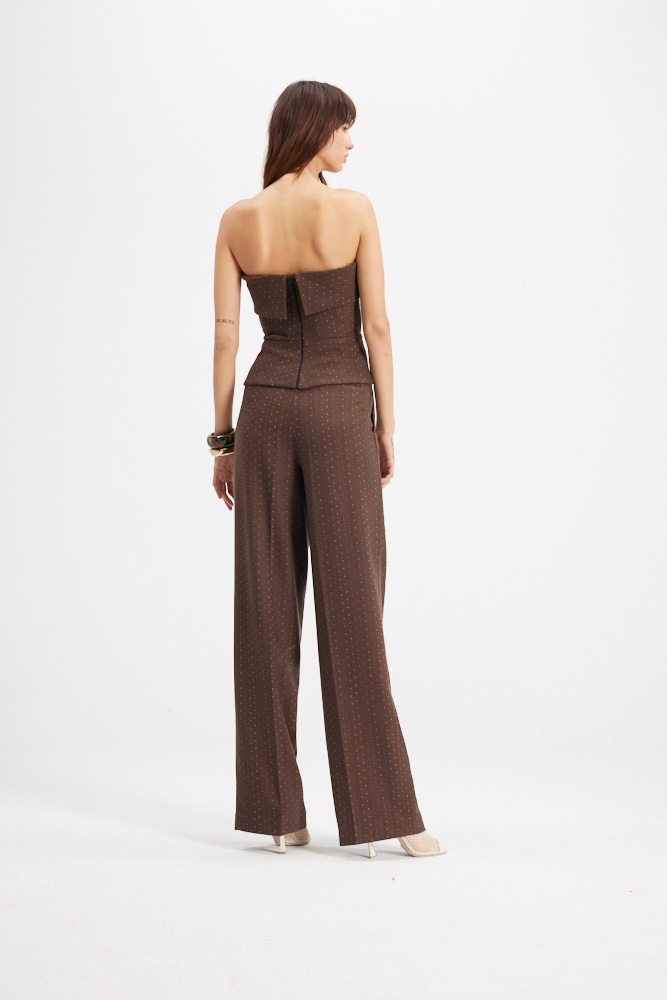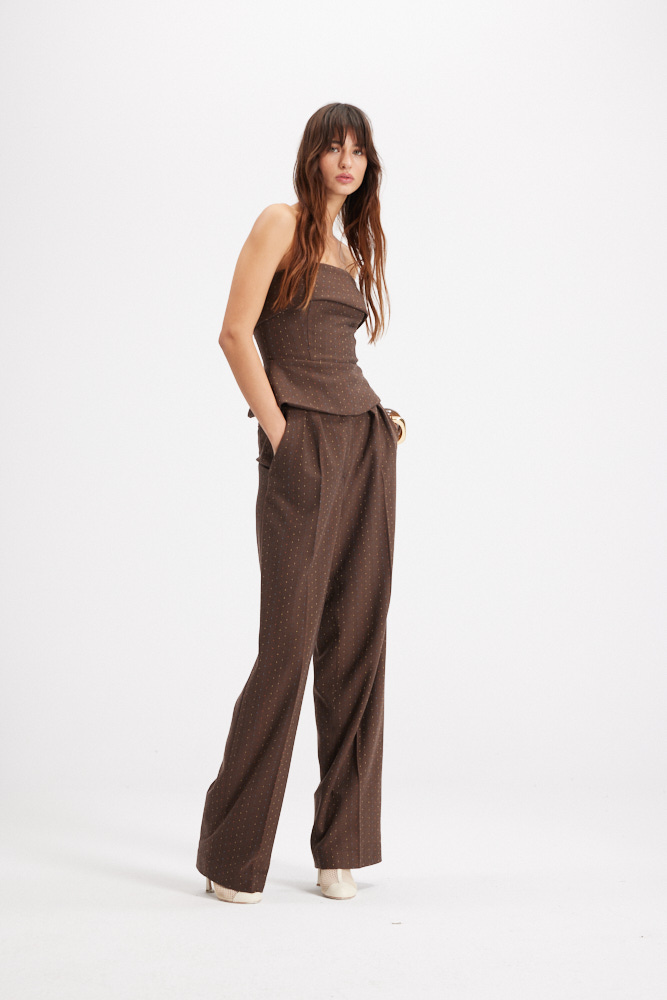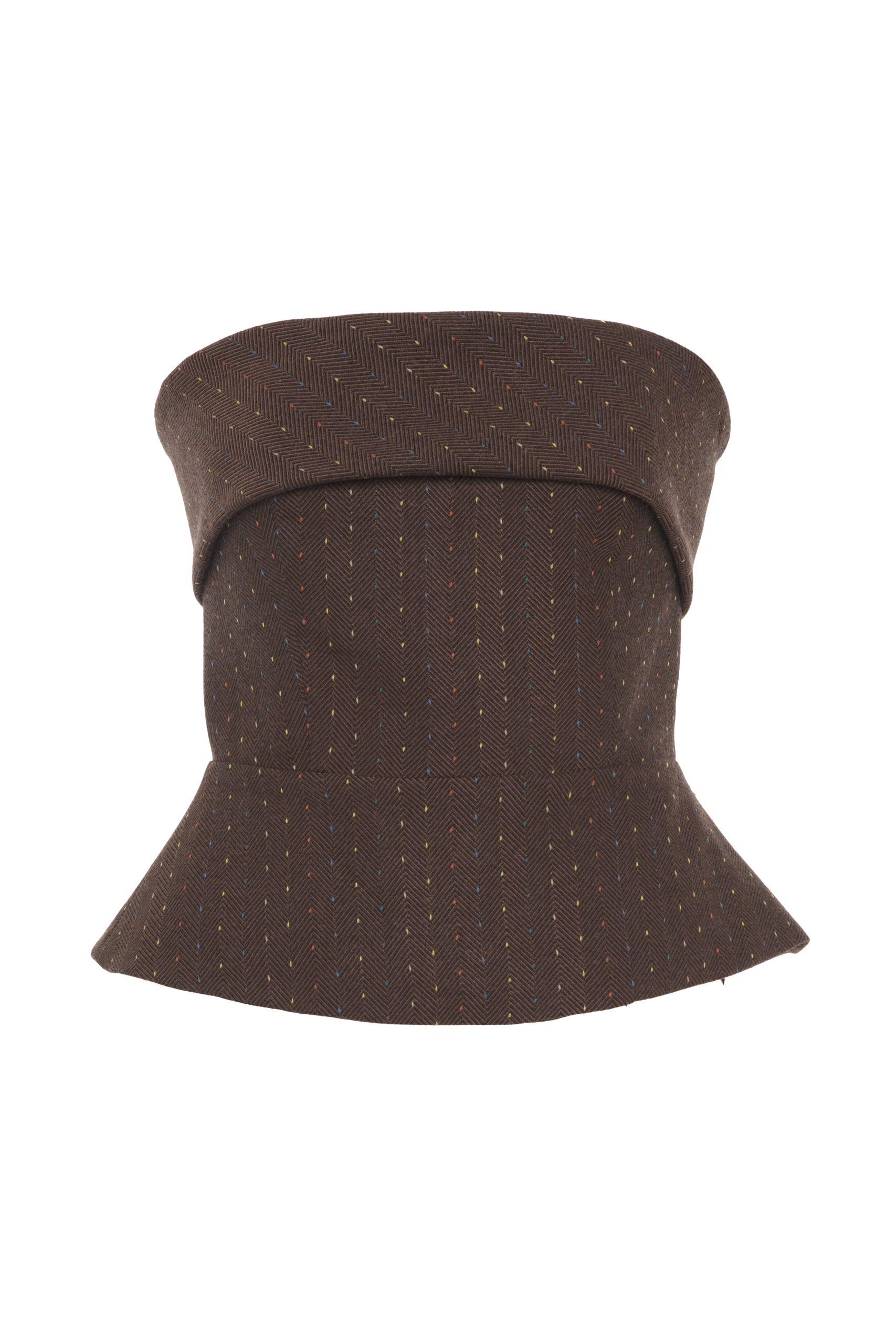 Chic and effortlessly modern, the Strapless bustier Top is designed to make a subtle yet striking statement. Crafted from a rich brown fabric with delicate multicolored dot detailing, this top combines structured tailoring with playful texture. The strapless neckline highlights the shoulders, while the fitted bodice flares into a soft peplum hem that flatters the waistline.