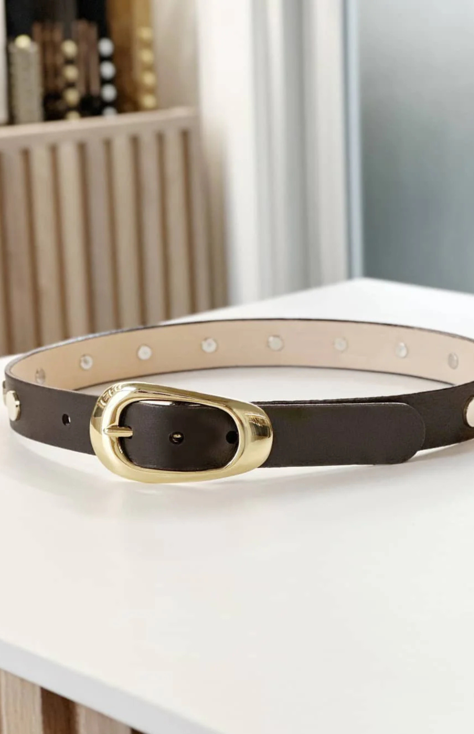 Handmade in our Toronto workshop, Koy is handcrafted from pebbled nappa leather. Adorned with metal studs and finished with a bold polished buckle, this bold accent piece is sure to turn heads. Style this beautiful waist belt with high rise denim and trousers.