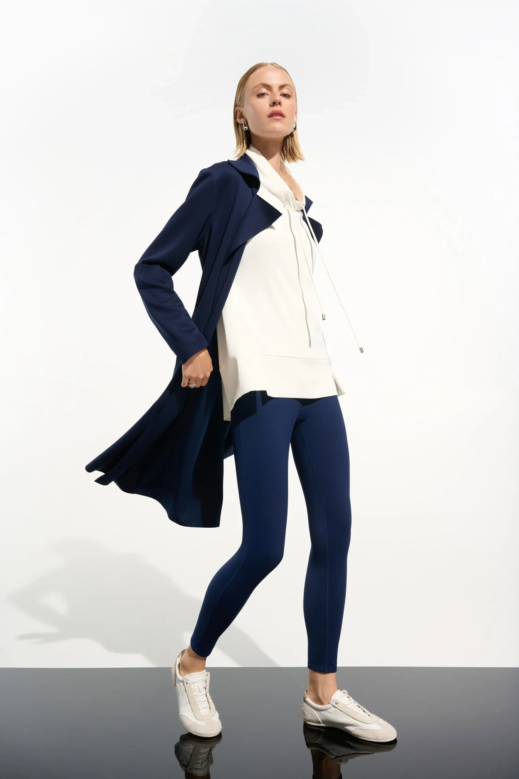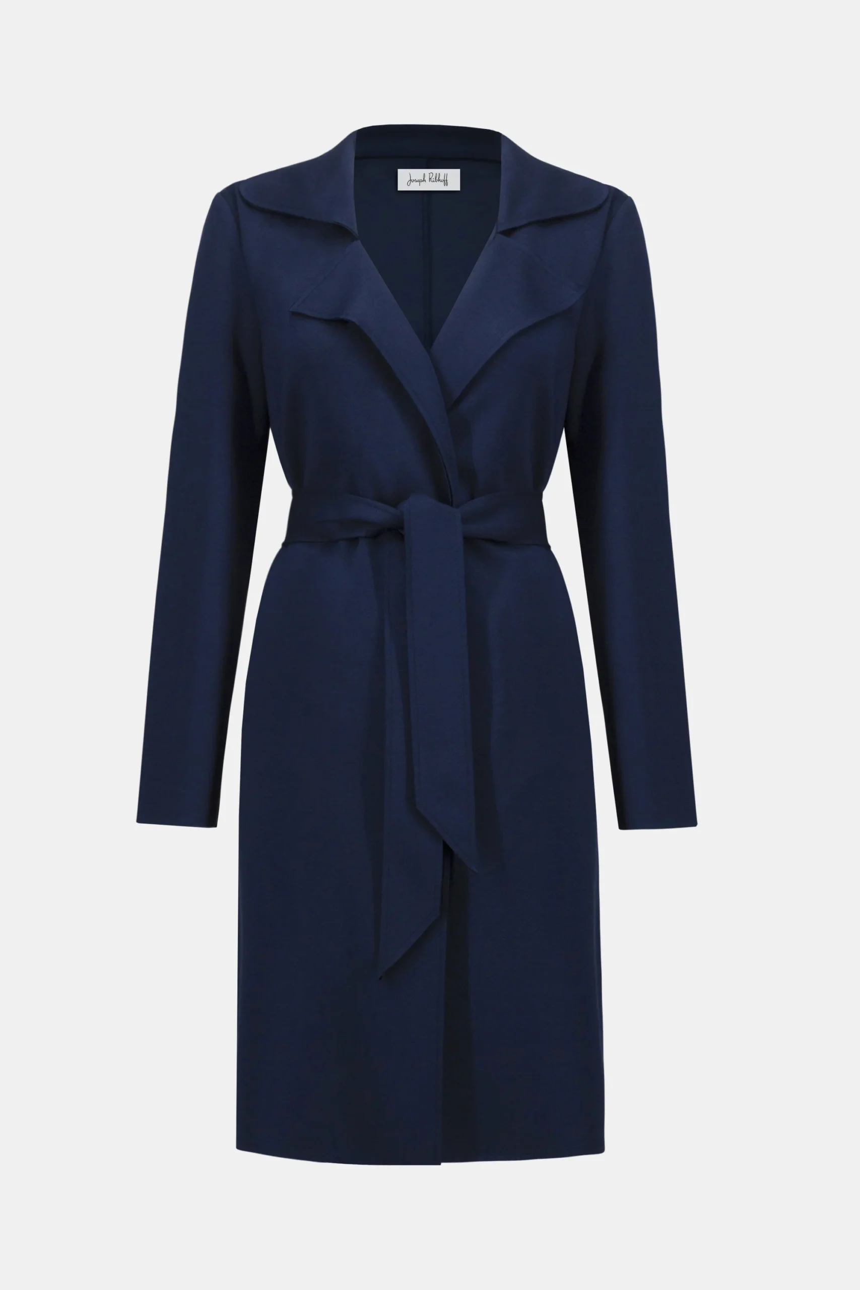 This streamlined coat blends soft scuba jersey with sharp tailoring. A notched collar and long sleeves frame the silhouette, while a waist sash, back vent, and functional pockets offer ease and structure.