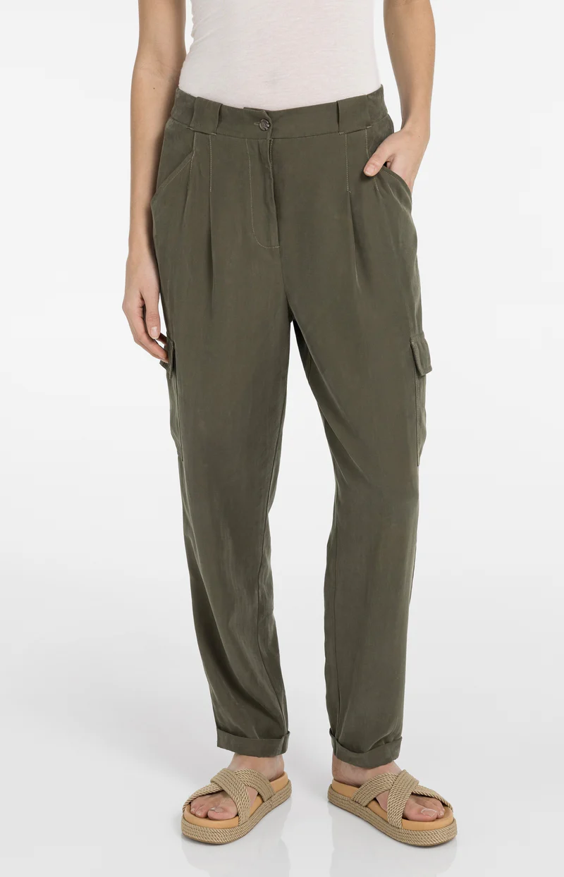 These comfortable cargo trousers are made from a soft, flowy woven fabric. Designed with straight legs and front pleats for a feminine touch, and finished with cargo pockets and turned-up hems for a casual edge. The elastic waistband at the back adds extra comfort. Features side pockets and welt pockets at the back. The model is 175 cm and wears size 36.