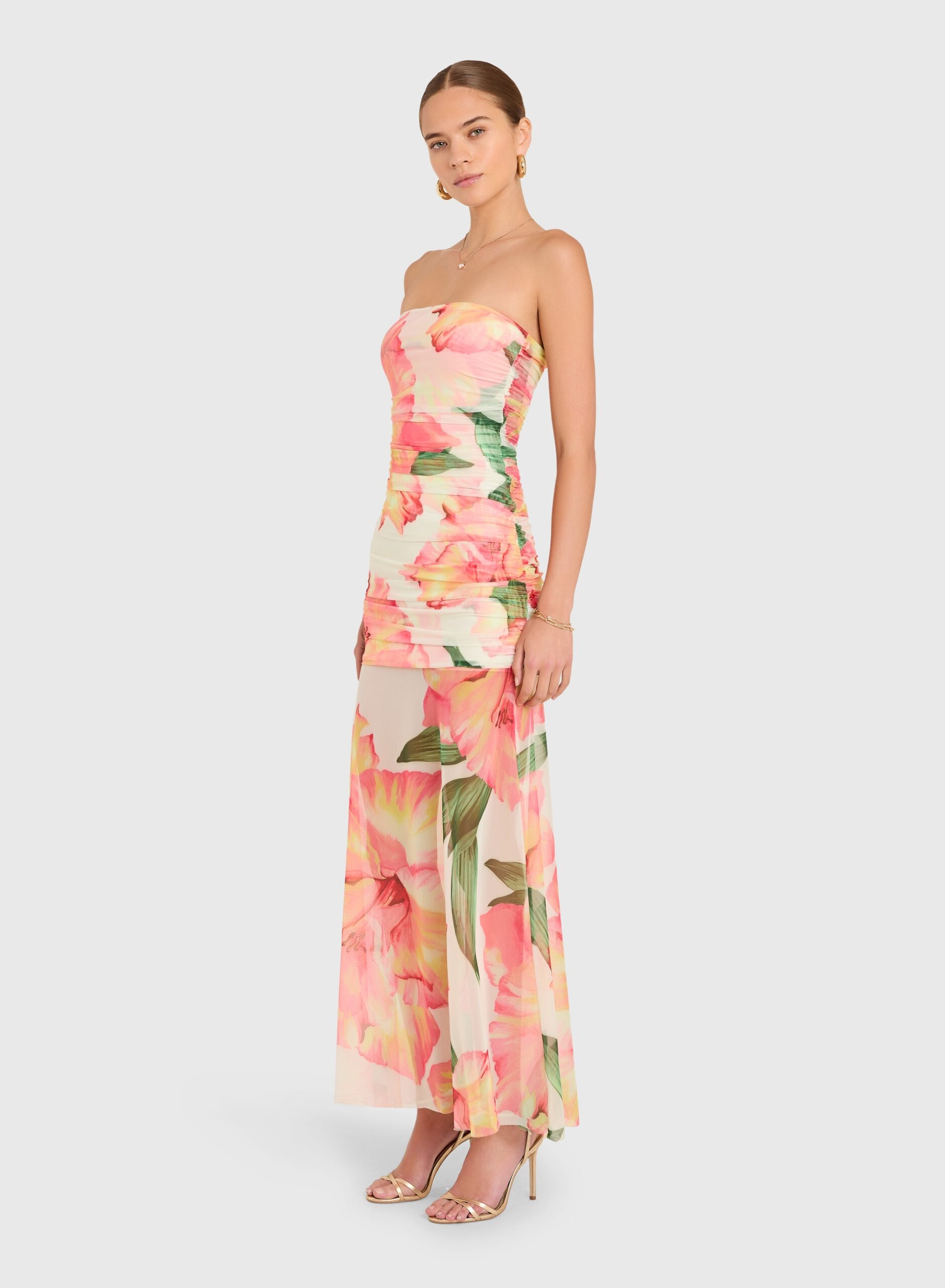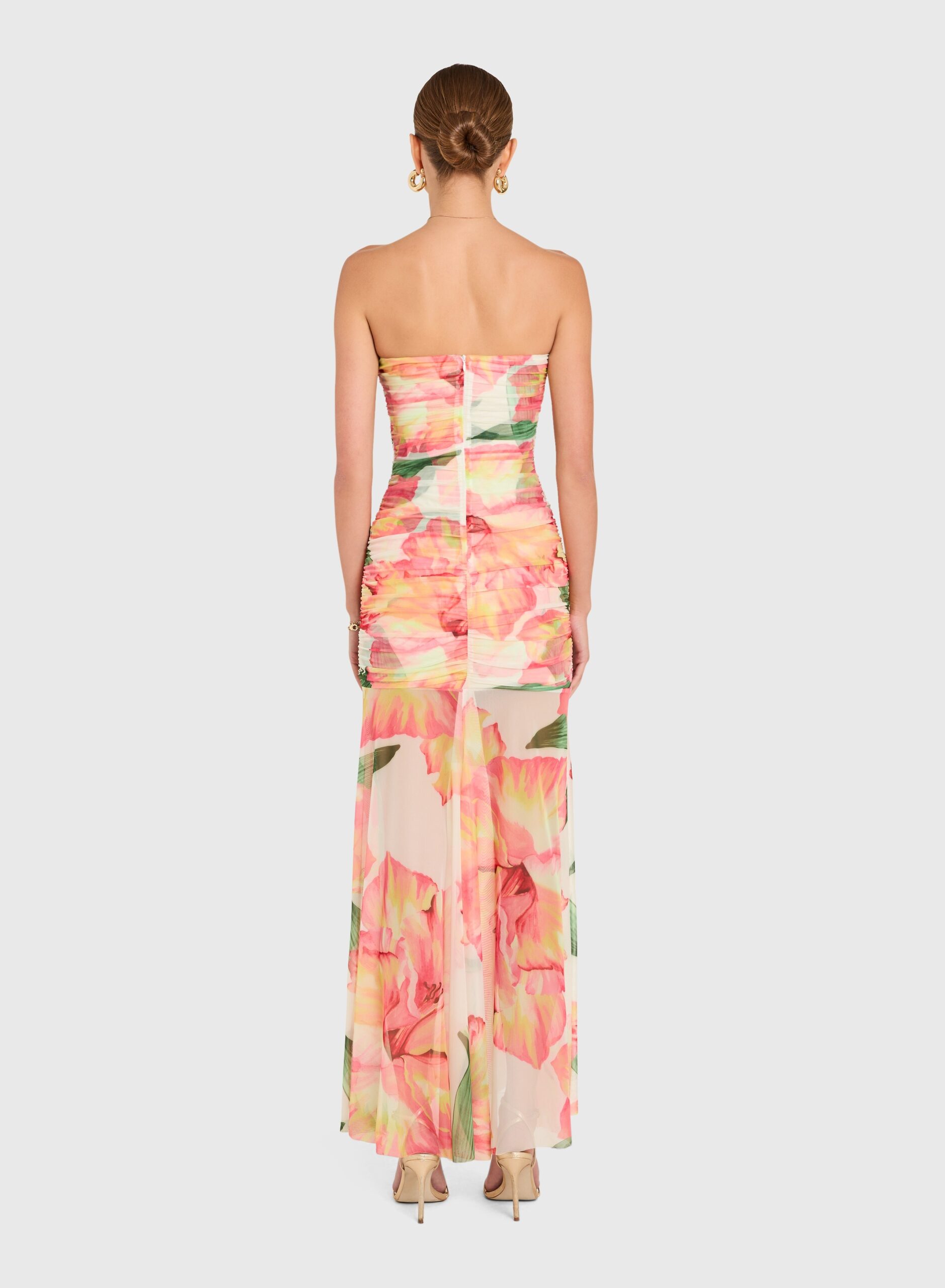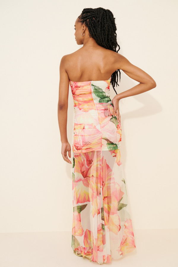 Featuring delicate ruching through the body, this piece enhances the figure while maintaining a soft, romantic feel. The contrast between the fitted base and the fluid, sheer skirt creates a modern, layered effect that moves beautifully with every step.