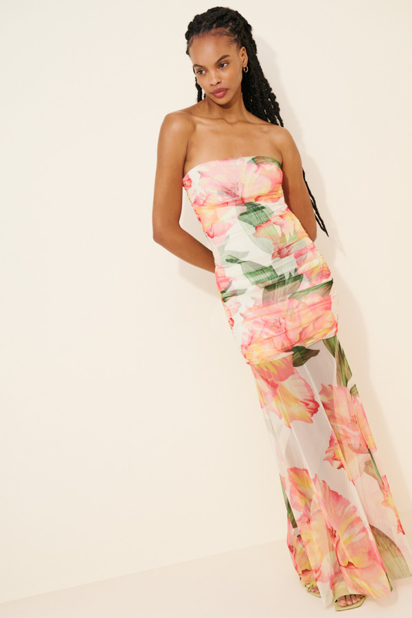 The Leo Maxi Dress is a striking, feminine silhouette that blends structure with soft, flowing movement. Designed with a strapless neckline, it highlights the shoulders and décolletage while offering a sleek, sculpted fit through the bodice. The mini-length underlayer creates a flattering, contoured shape, while the sheer maxi overlay adds dimension and graceful movement.