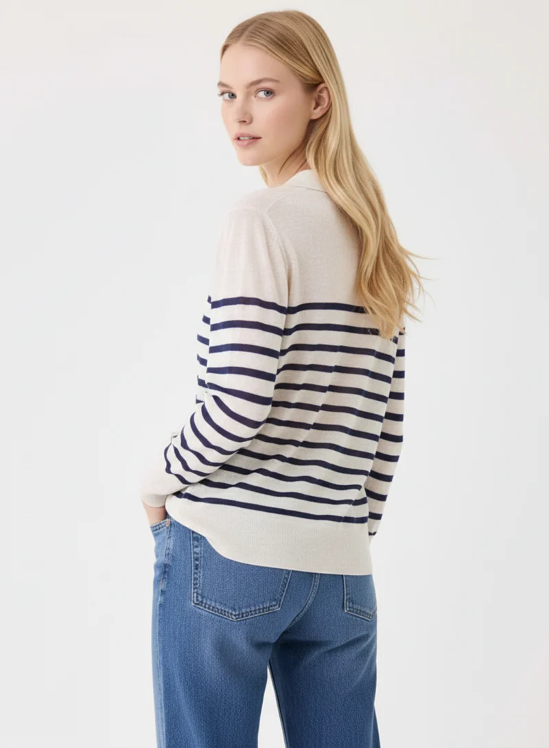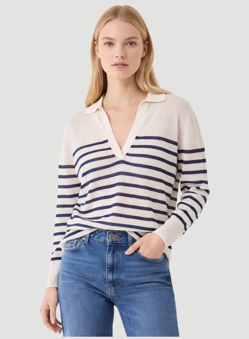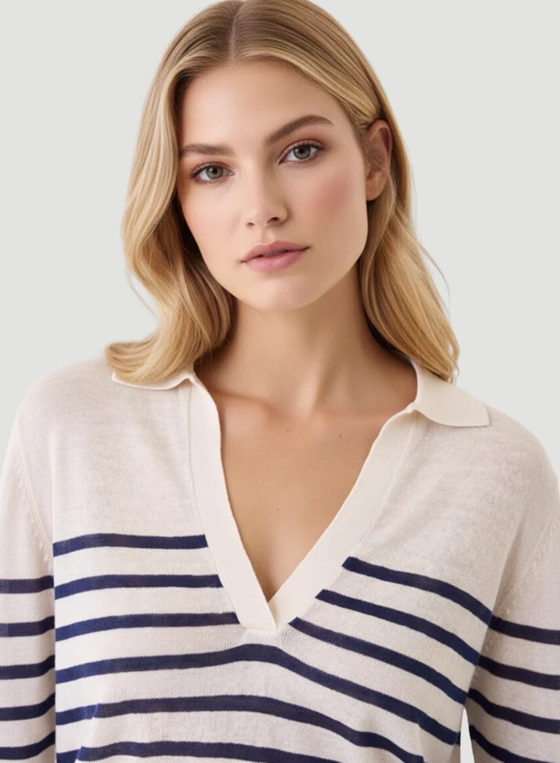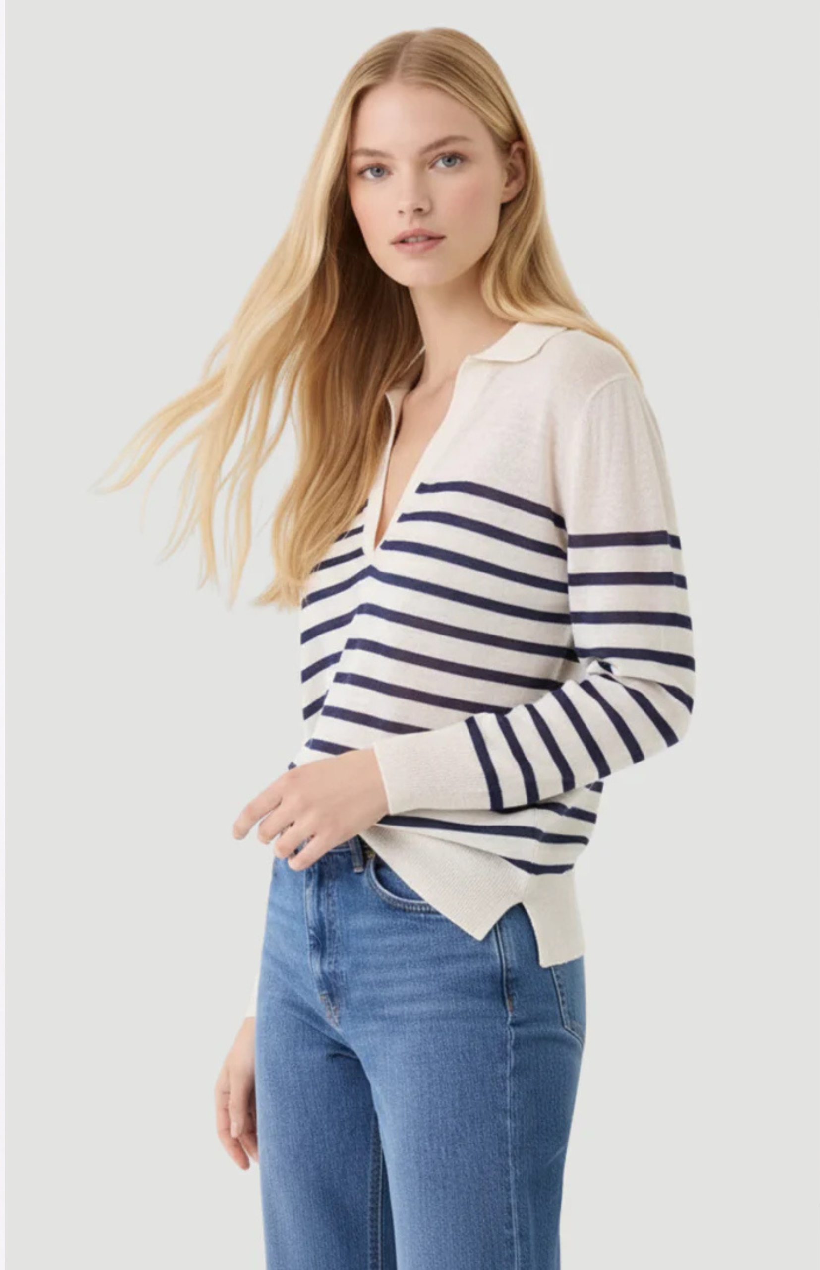 This stretch linen stripe long sleeve polo is a light weight knit that features a luxurious hand and a semi relaxed silhouette. Our linen knit is made from European long stem linen and complete with a unique finish that is cool to the touch and will never pill, stretch, or fade.
