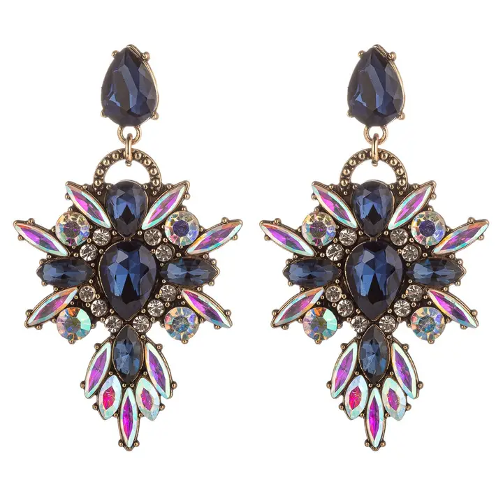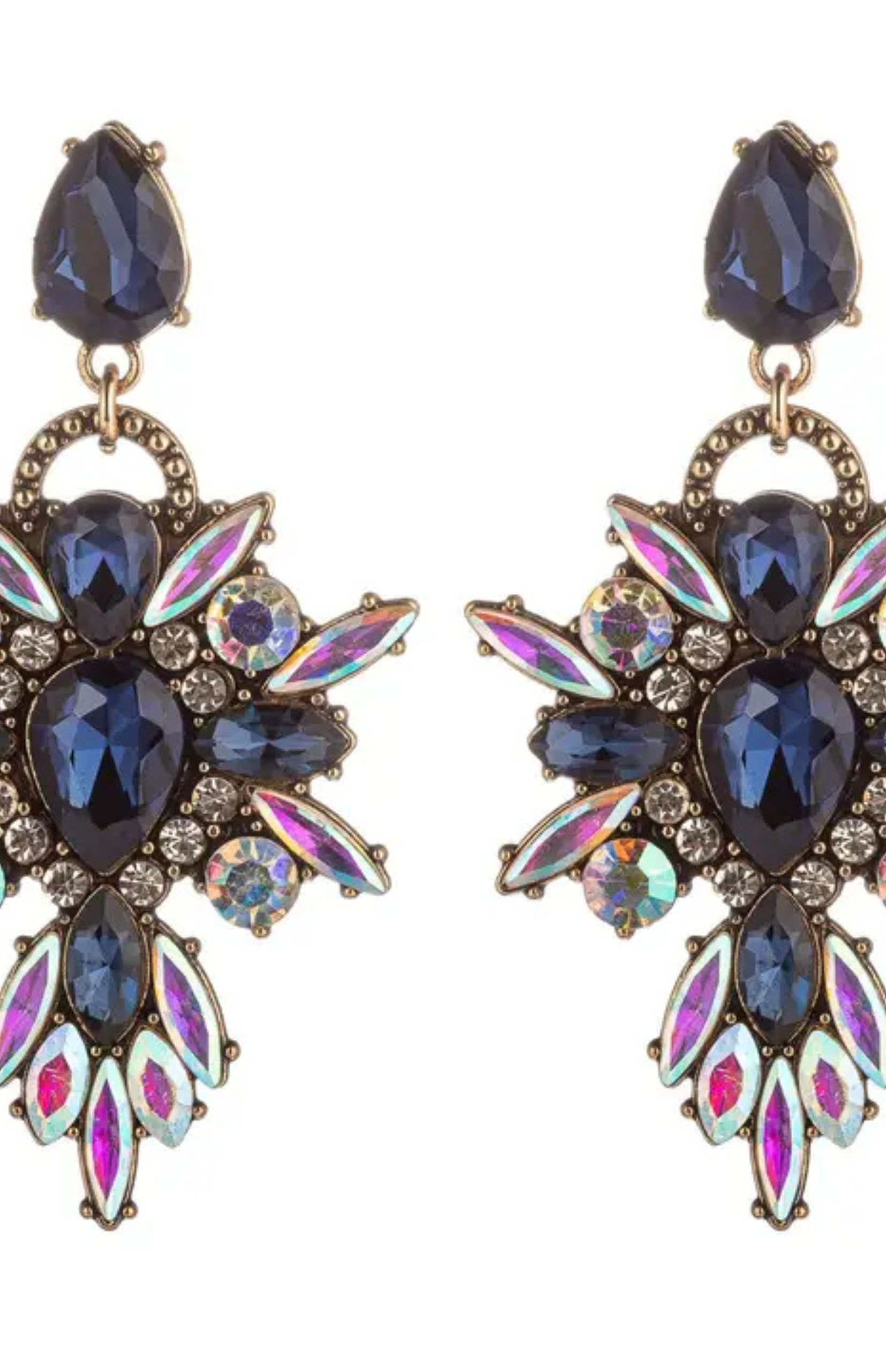 Be that talk of the night when you have our Lexy Statement earrings on! These beautiful statement earrings are home to an array of blue glass crystals that all come in unique hues, sizes and shapes. This combination of assorted glass crystals paired with a gold alloy base makes these dangling earrings a must have piece for your collection!