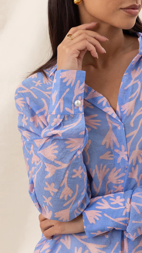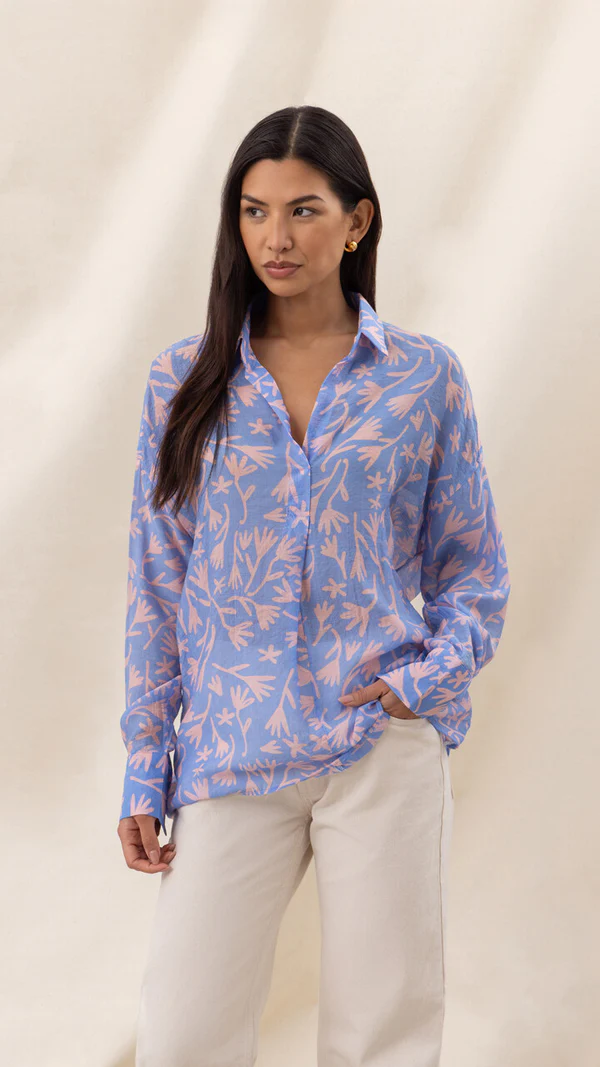 Contemporary pop-over shirt for an elevated take on a Summer styling staple. Pearl detail double cuffs for a polished casual look. Team with soft tailoring, denim or wear as a cover-up for endless wardrobe versatility