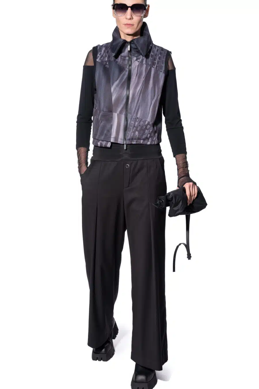 A contemporary utility style vest with strict turtleneck and pocket for smartphone. Always equipped with a practical garment that allows you to leave the handbag at home.