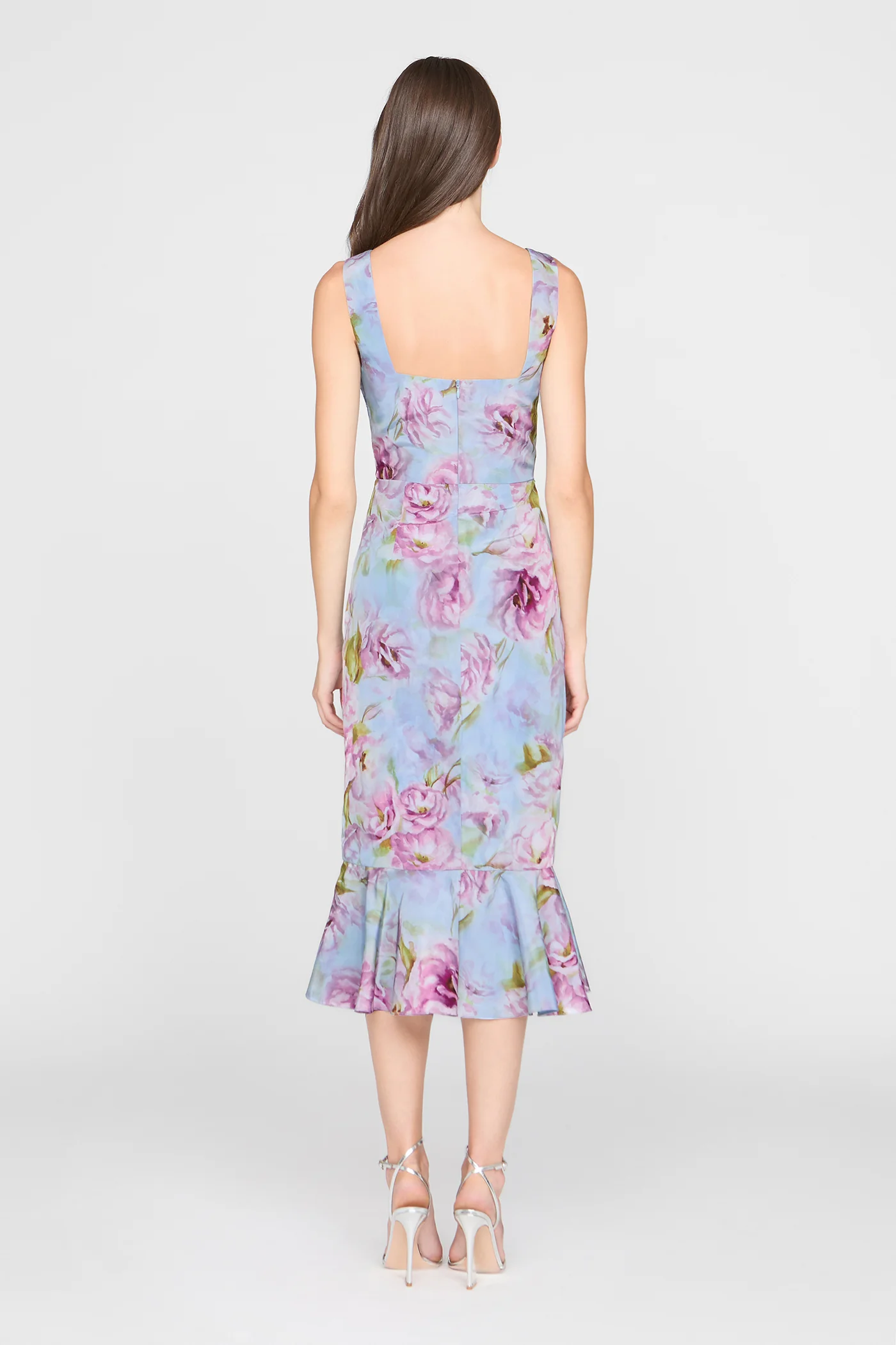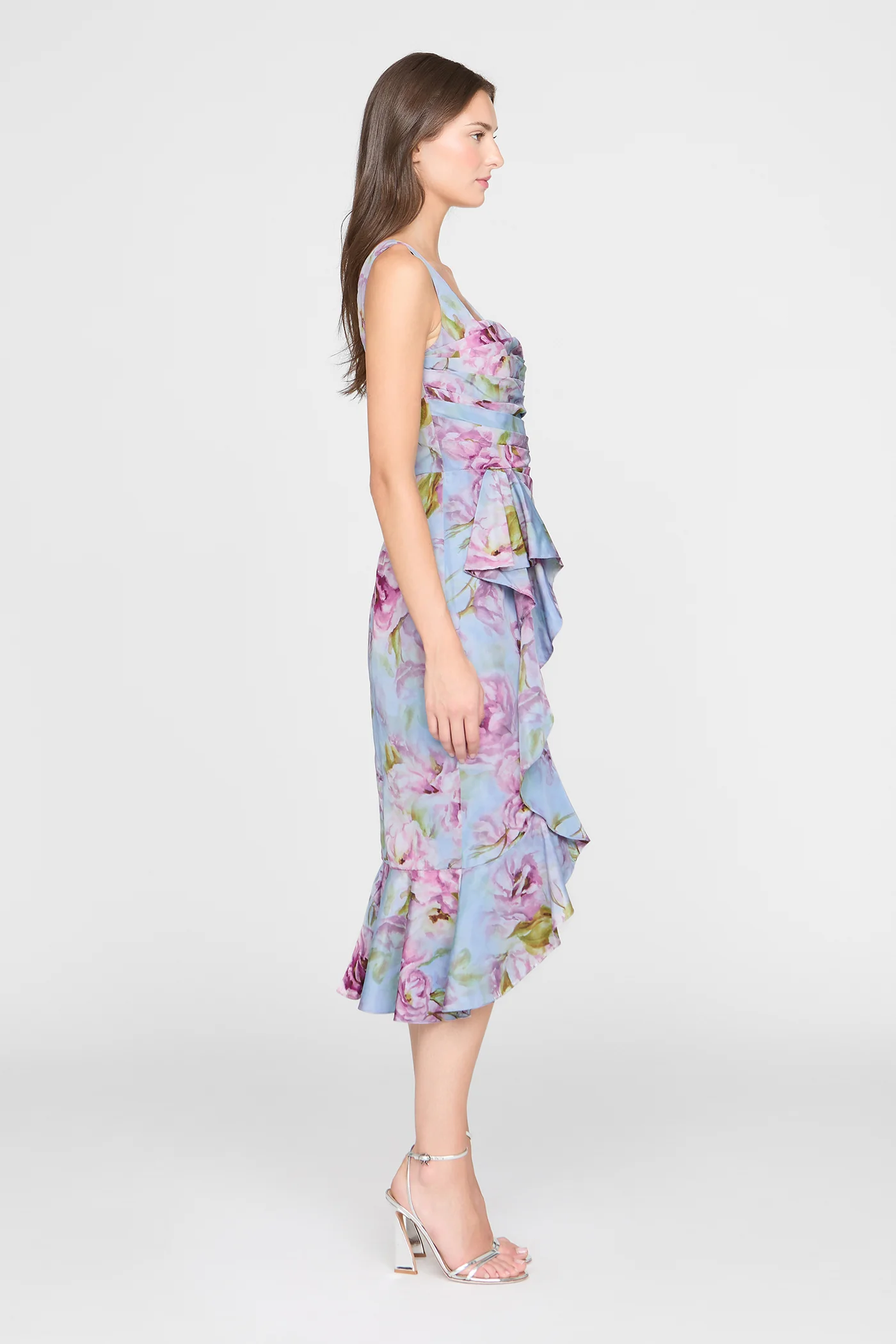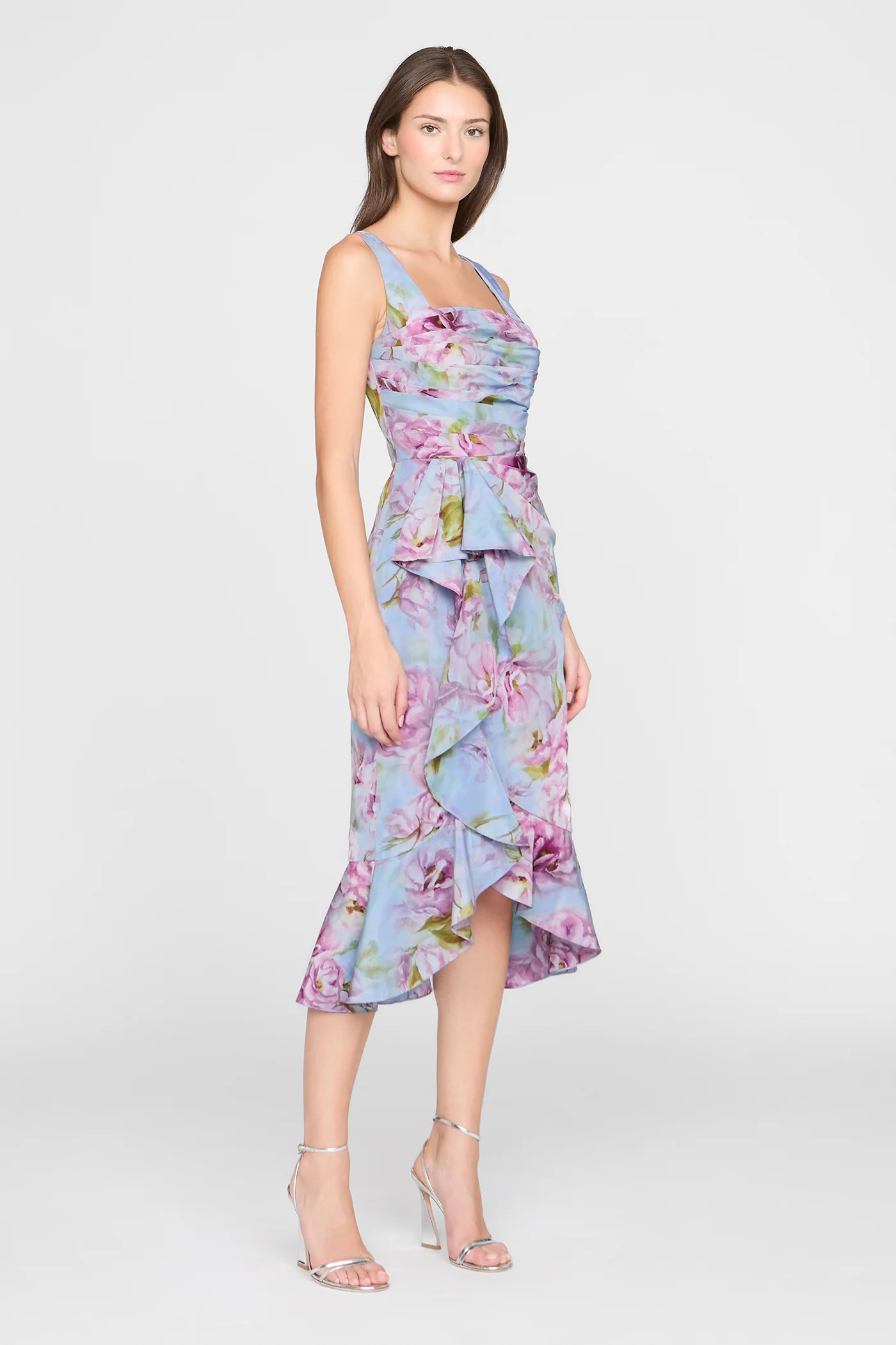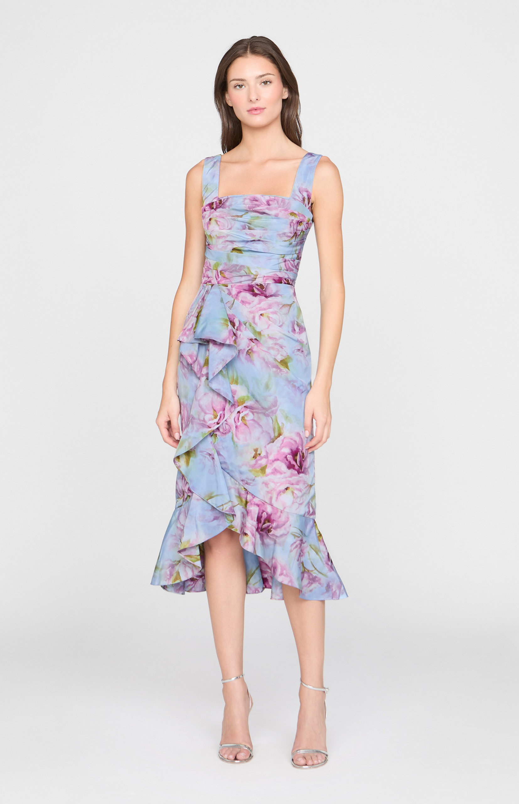 Printed taffeta dress with a vivid floral motif and soft, fluid drape. Finished with subtle bodice tucks and a cascading skirt for easy movement. A fresh pick for luncheons, cocktails, and bridal showers.