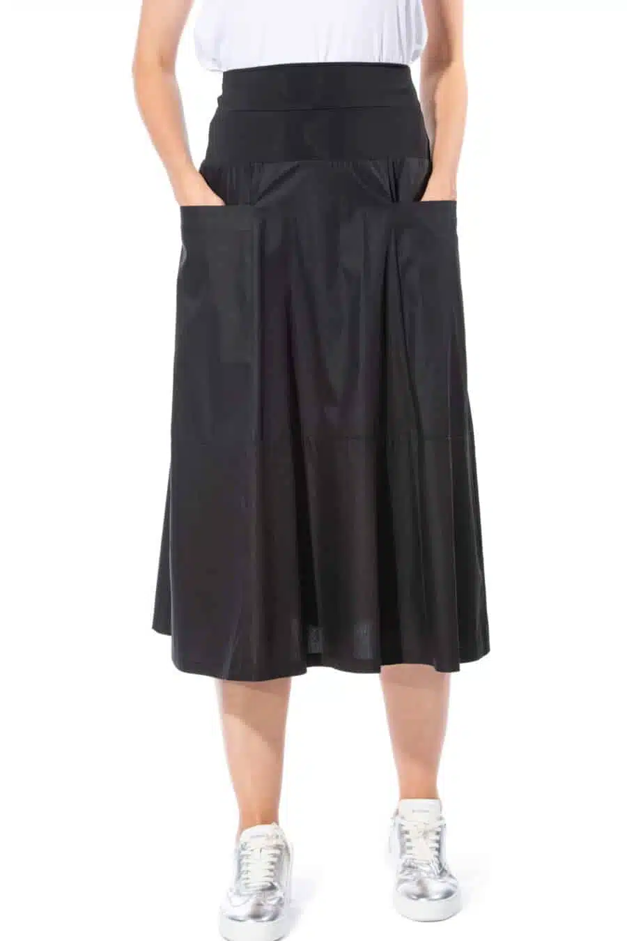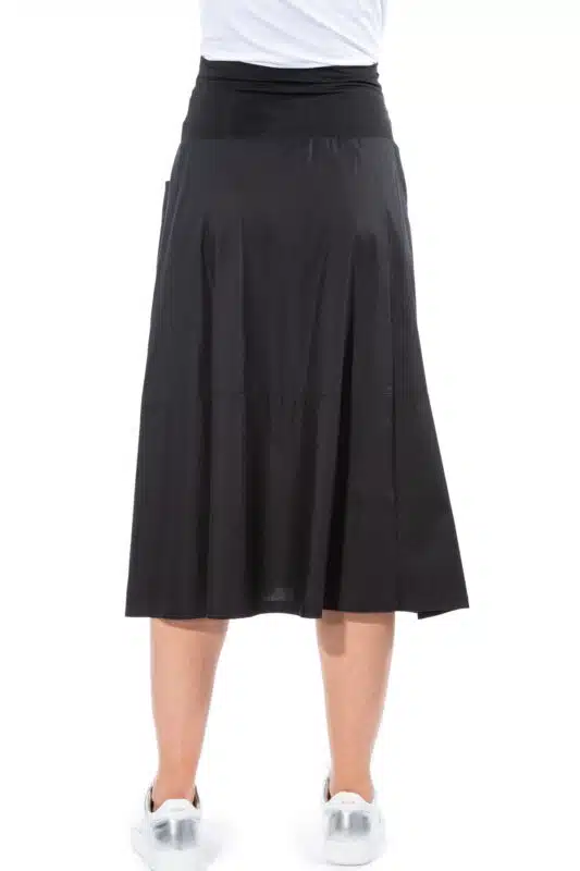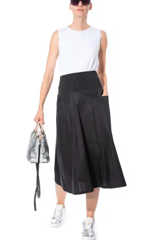 This gently flared A-line skirt offers a clean silhouette with functional structure. The elastic jersey waistband ensures comfort, while symmetrical vertical panel seams add definition and visual length. Horizontally placed pockets are subtly integrated into the design, maintaining the minimalist look while adding practicality. A thoughtfully designed piece – versatile, balanced, and easy to style.