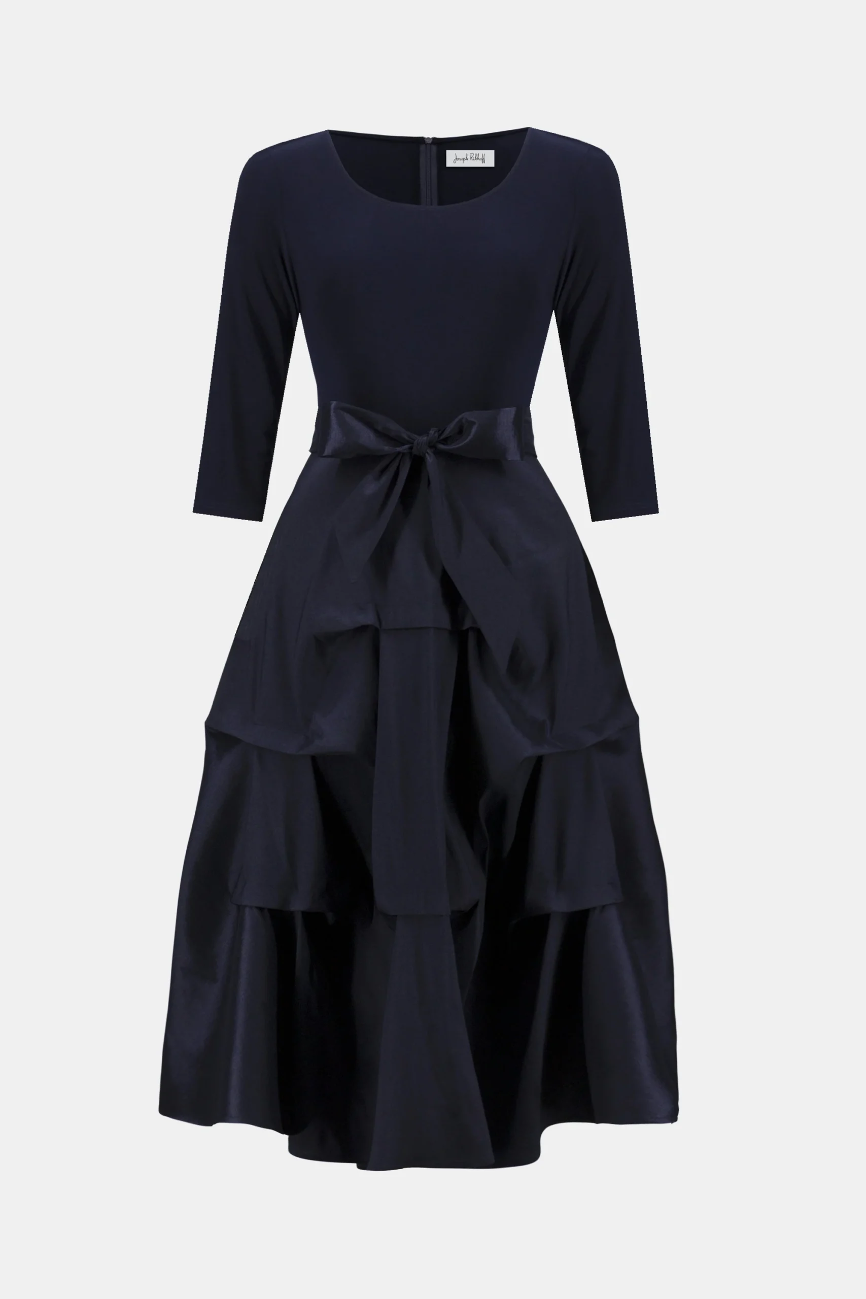 A fluid silky knit bodice meets the sculptural volume of a taffeta skirt in this striking fit and flare silhouette. Pick-up pleats and a self-tie sash bring dramatic texture and shape to the waist. Part of the Signature collection.