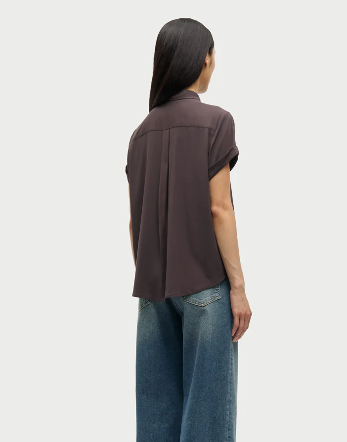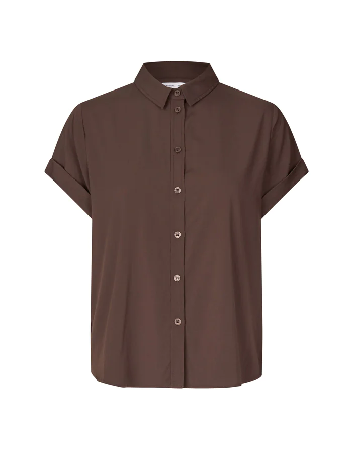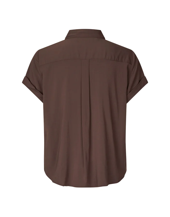 Majan Ss shirt Black Coffee is a classic womens short-sleeved shirt with a regular fit and button closure on the front. It features a neck yoke seam with pleated detailing. The main material is made from an elastic LENZING™ ECOVERO™ Viscose, certified with the EU Ecolabel for meeting high environmental standards.