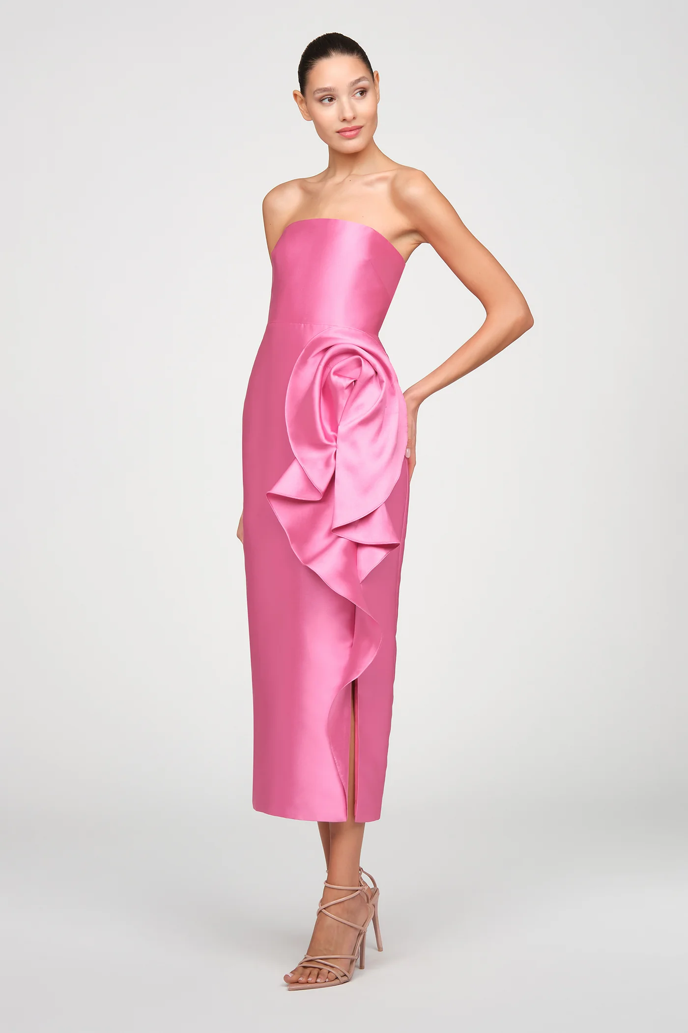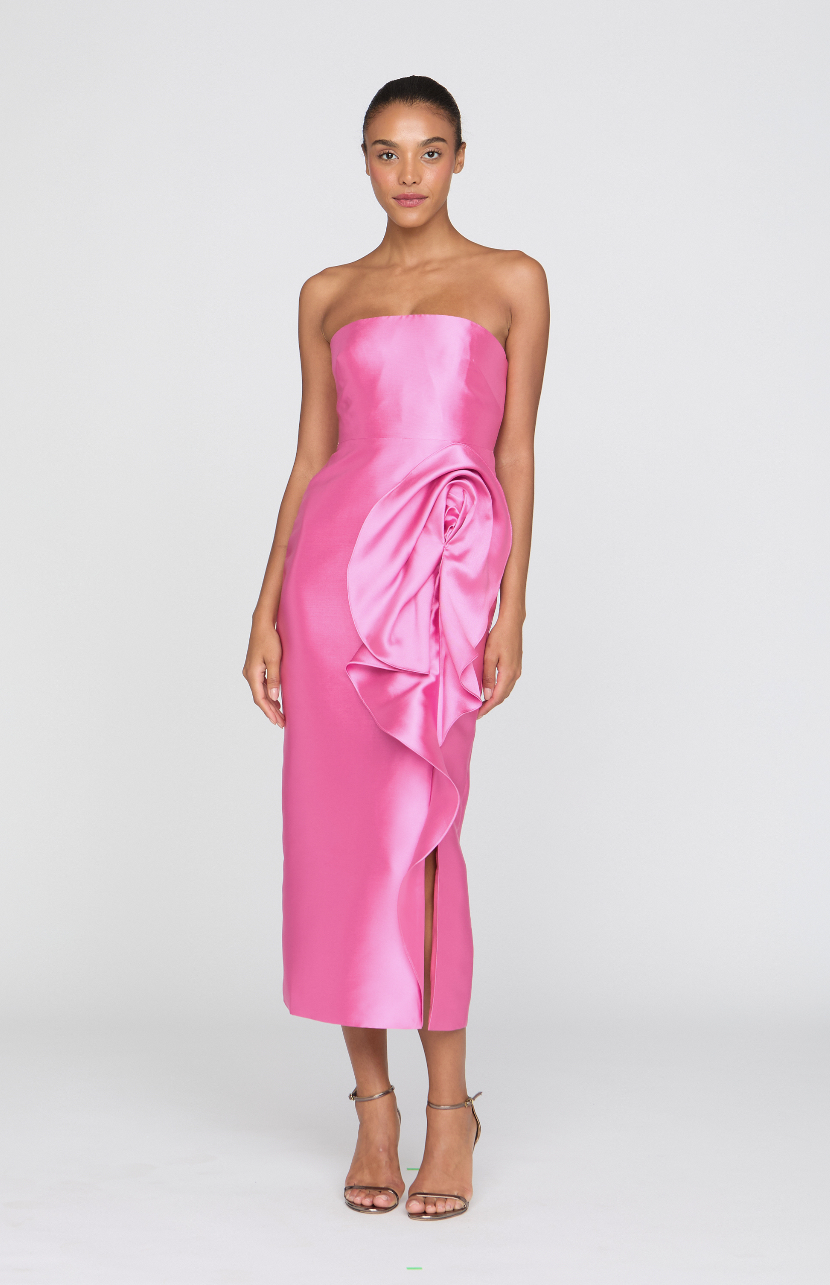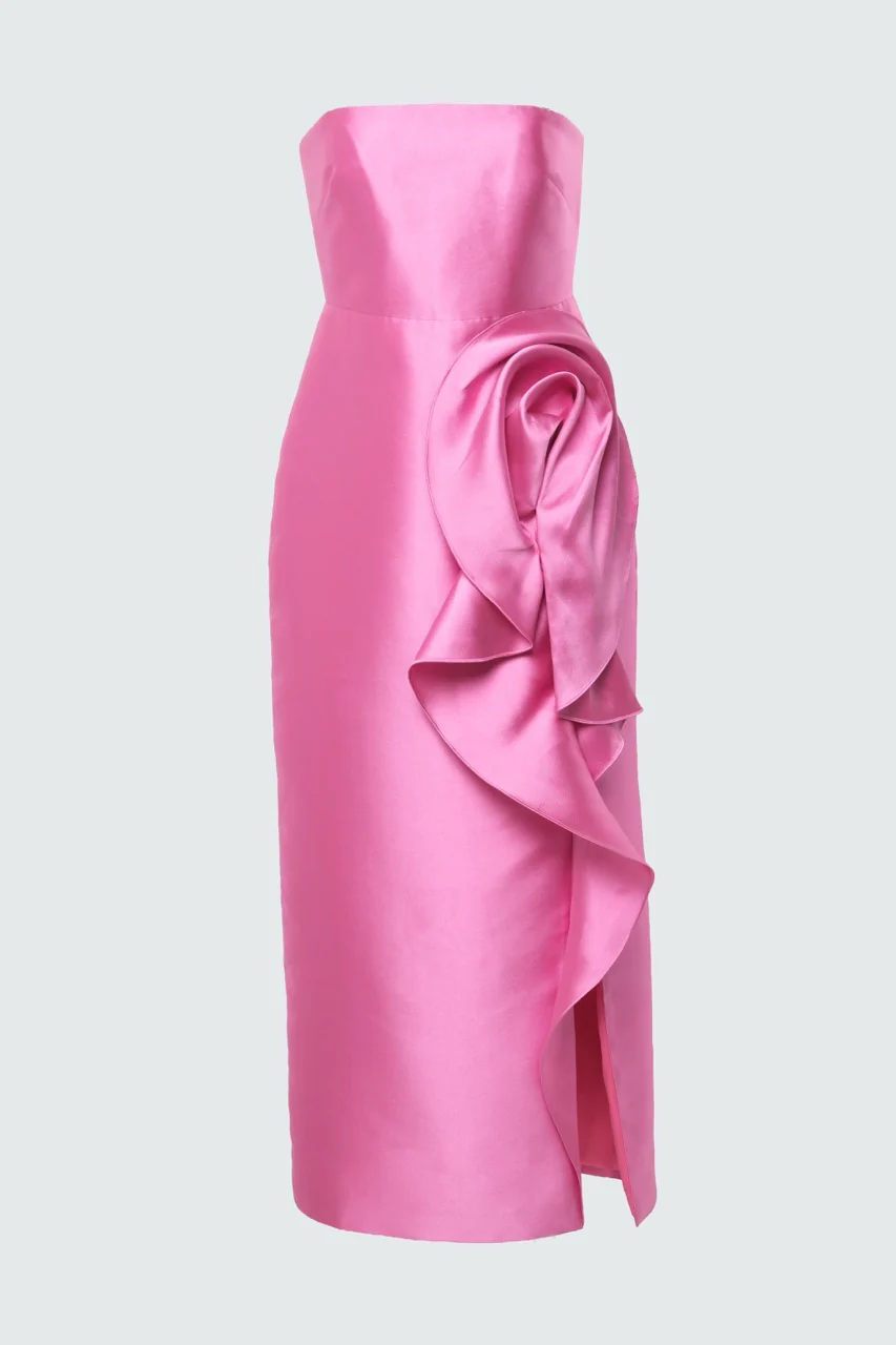 Strapless mikado midi dress in vibrant sunlit pink, the luminous fabric holding its shape with quiet structure as an abstract floral drape unfolds along the skirt. A bold yet refined choice for cocktail receptions, rehearsal dinners, and spring celebrations.