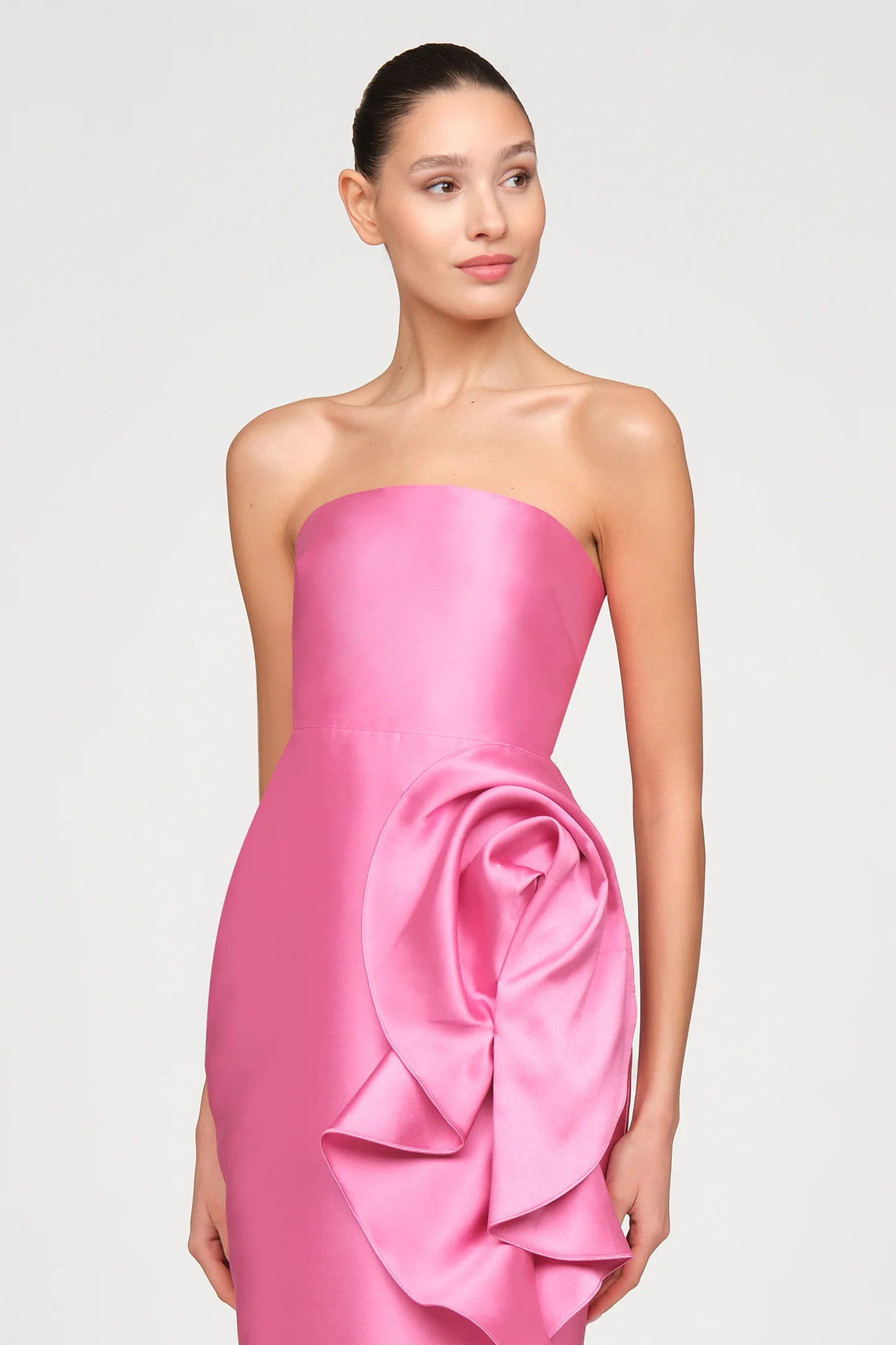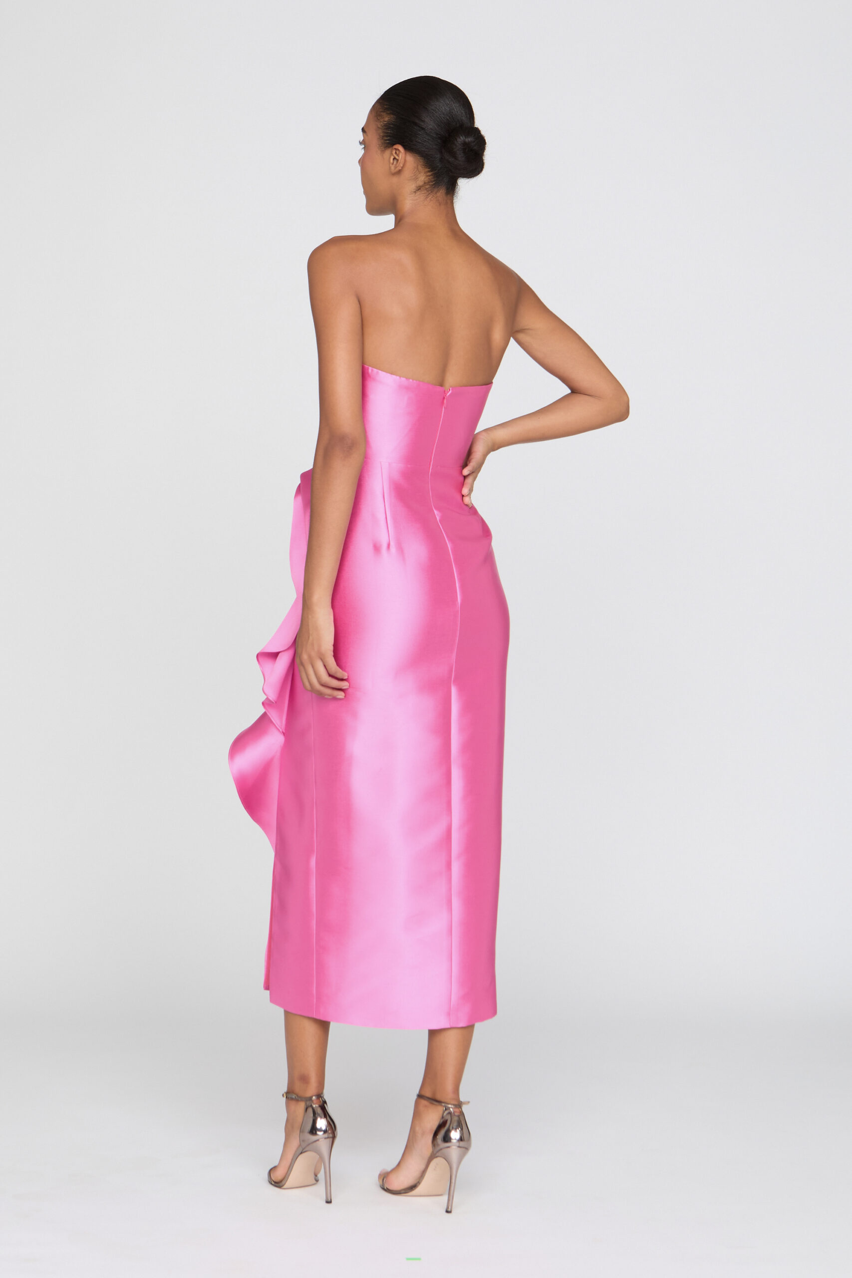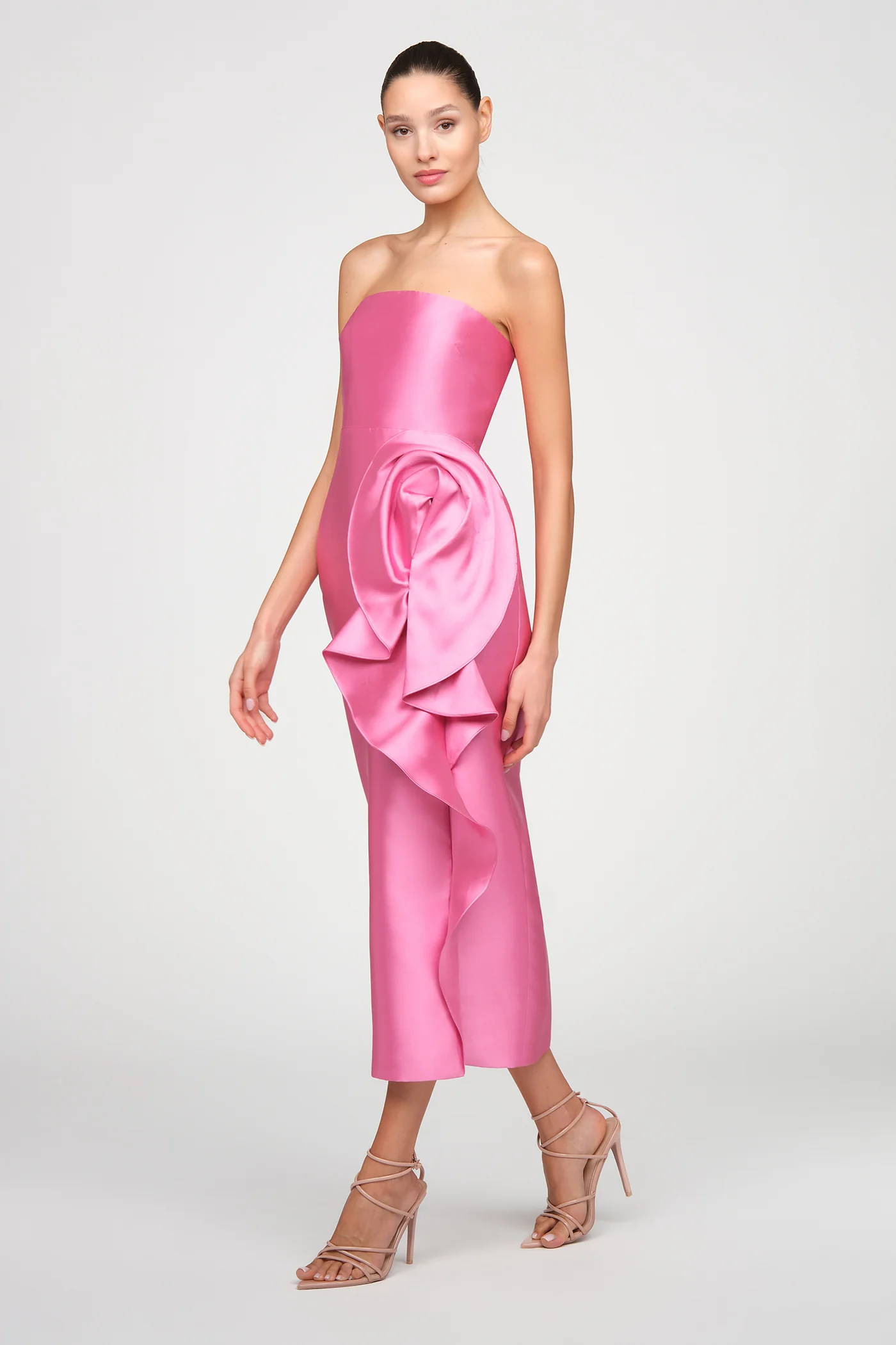 Strapless mikado midi dress in vibrant sunlit pink, the luminous fabric holding its shape with quiet structure as an abstract floral drape unfolds along the skirt. A bold yet refined choice for cocktail receptions, rehearsal dinners, and spring celebrations.