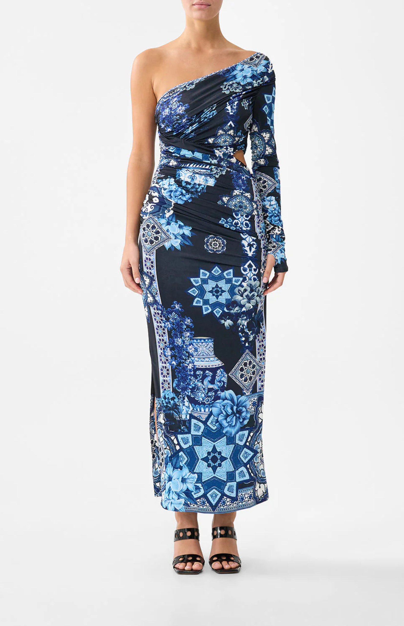 The Meli One Shoulder Jersey Cut Out Dress is a handcrafted silhouette designed by our in-house artisans. Created in an exclusive limited edition print, our knitted jersey dress features a cut out at one shoulder that extends to an asymmetrical long sleeve. Ruching flatters the form. Finished with an elongated, full length hemline.