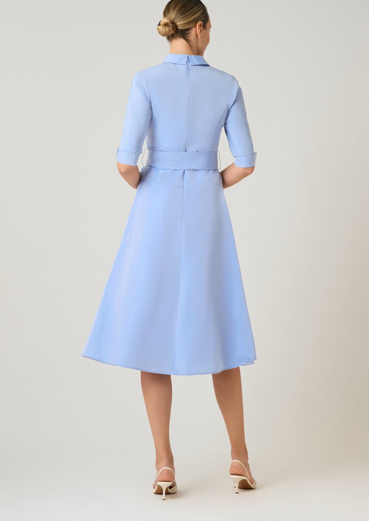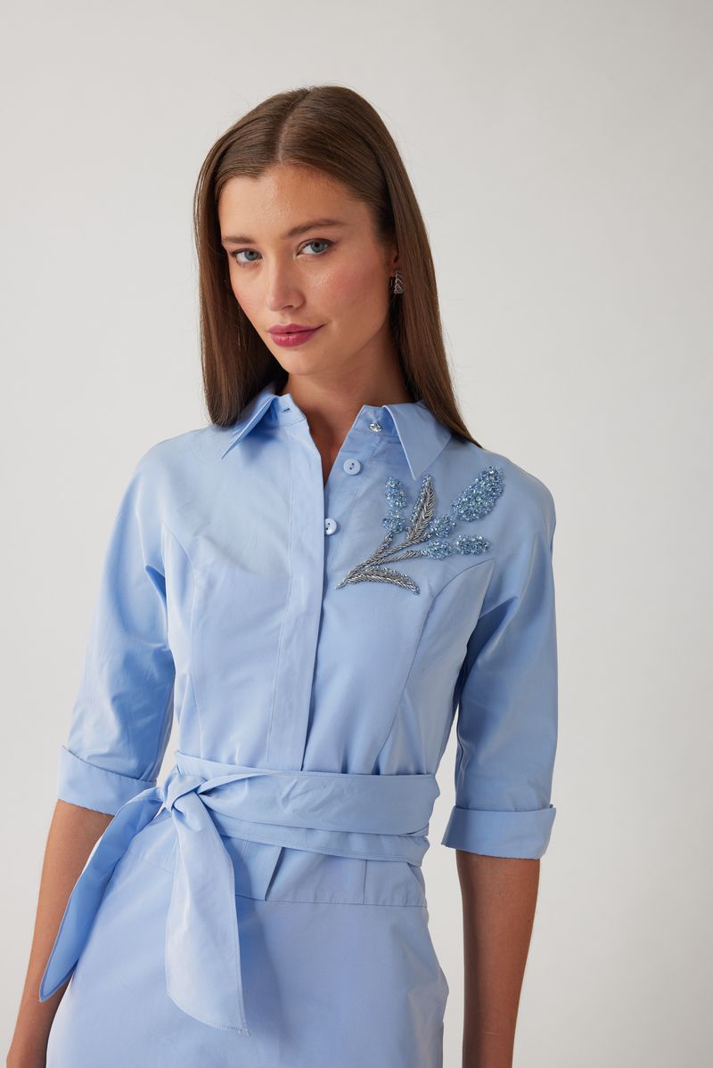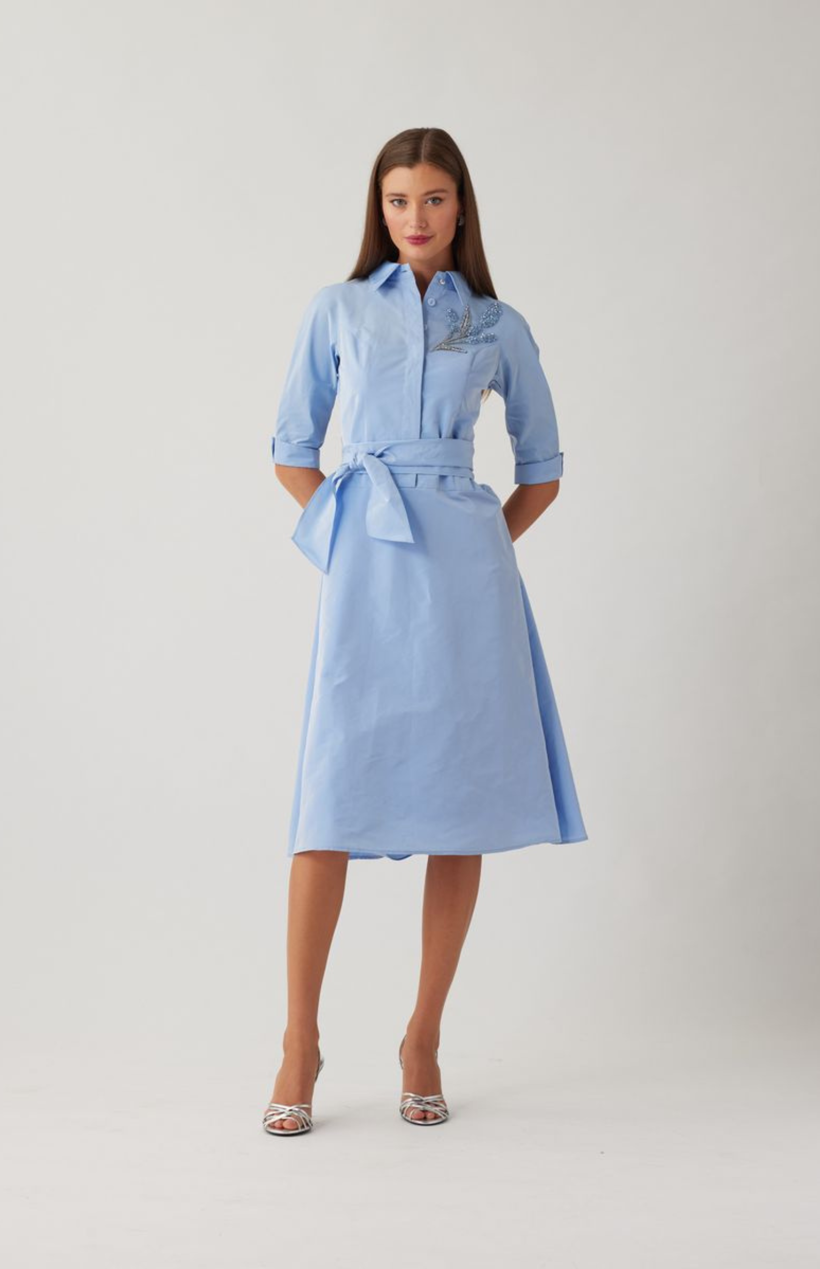 Elevate your daytime dressing with this refined taffeta shirt dress, crafted in a smooth fabric with subtle sheen and crisp structure. The tailored collared neckline and button front bodice create a polished, classic look. Finished with delicate beaded detailing at the bodice for a touch of sparkle, this midi length style moves gracefully with every step. Perfect for daytime weddings, luncheons, showers, and sophisticated daytime events that call for timeless polish.