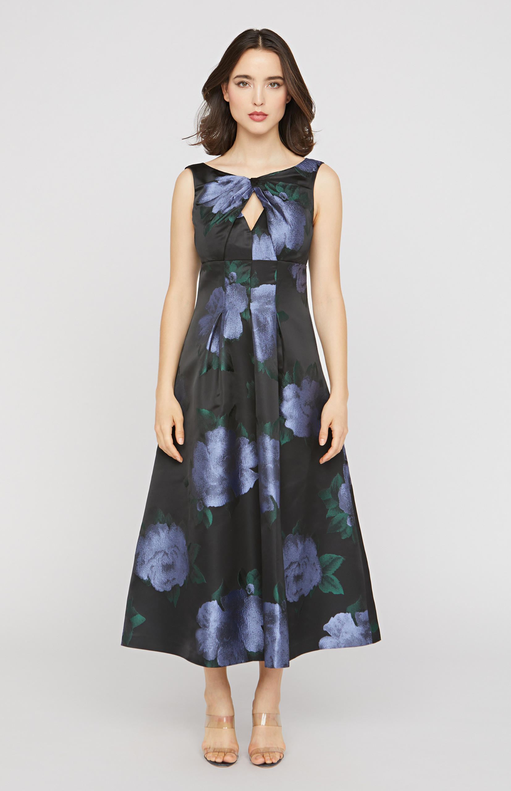 Floriana jacquard, sleeveless, bateau neckline with pleat twist detail neckline with keyhole, empire seam, stitch and release pleat flared skirt, tea length dress with pockets.