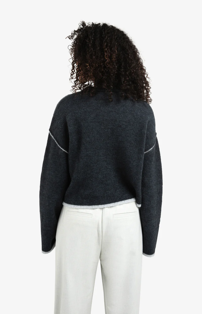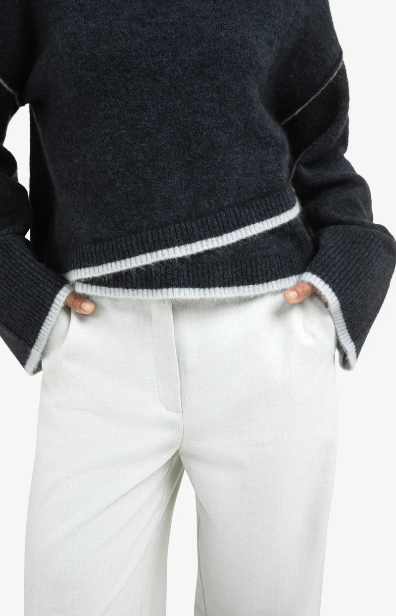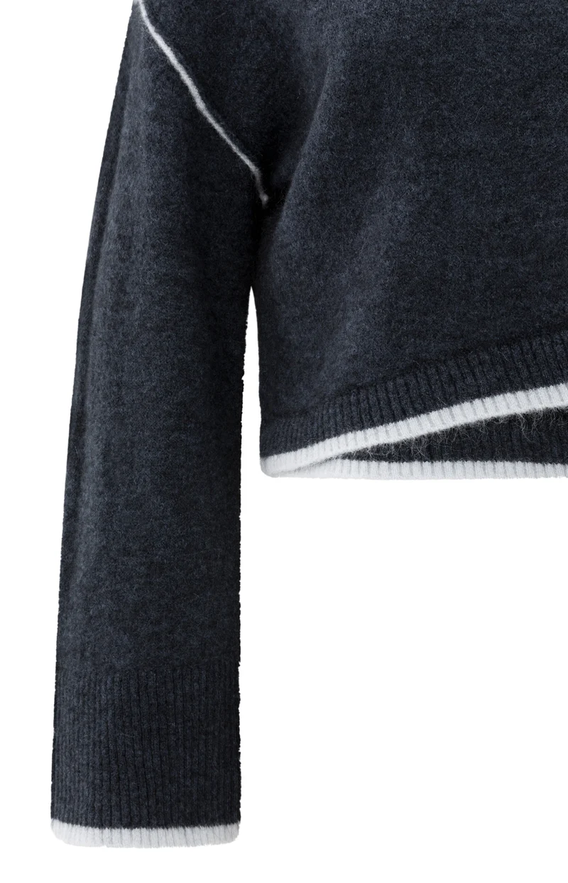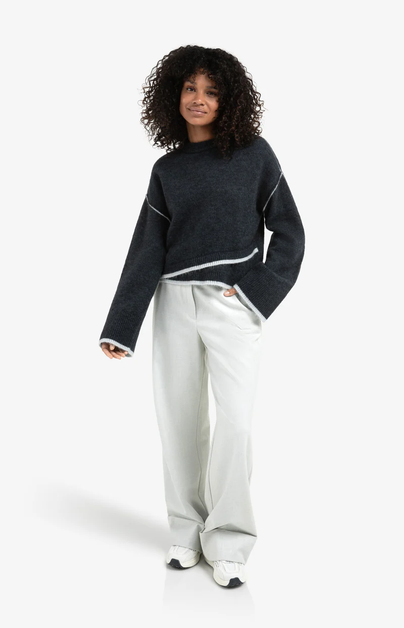 This soft knitted sweater features a short, straight fit and subtle contrasting lines along the hem, cuffs, and shoulder seams. Designed with a round neckline and dropped shoulders, it has a relaxed feel, while the diagonal finish adds a playful touch. A modern piece that blends comfort with style. The model is 173 cm and wears size S.