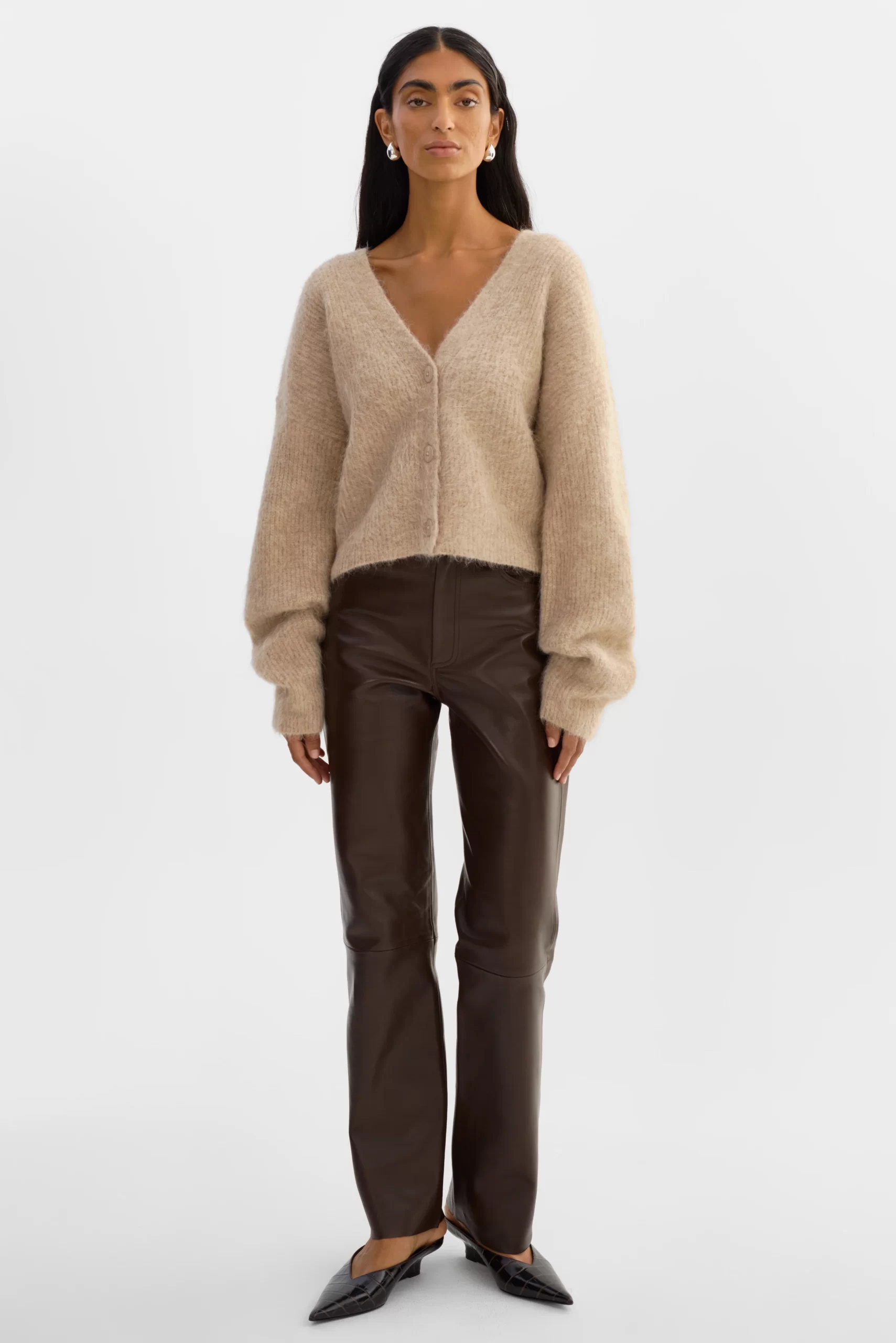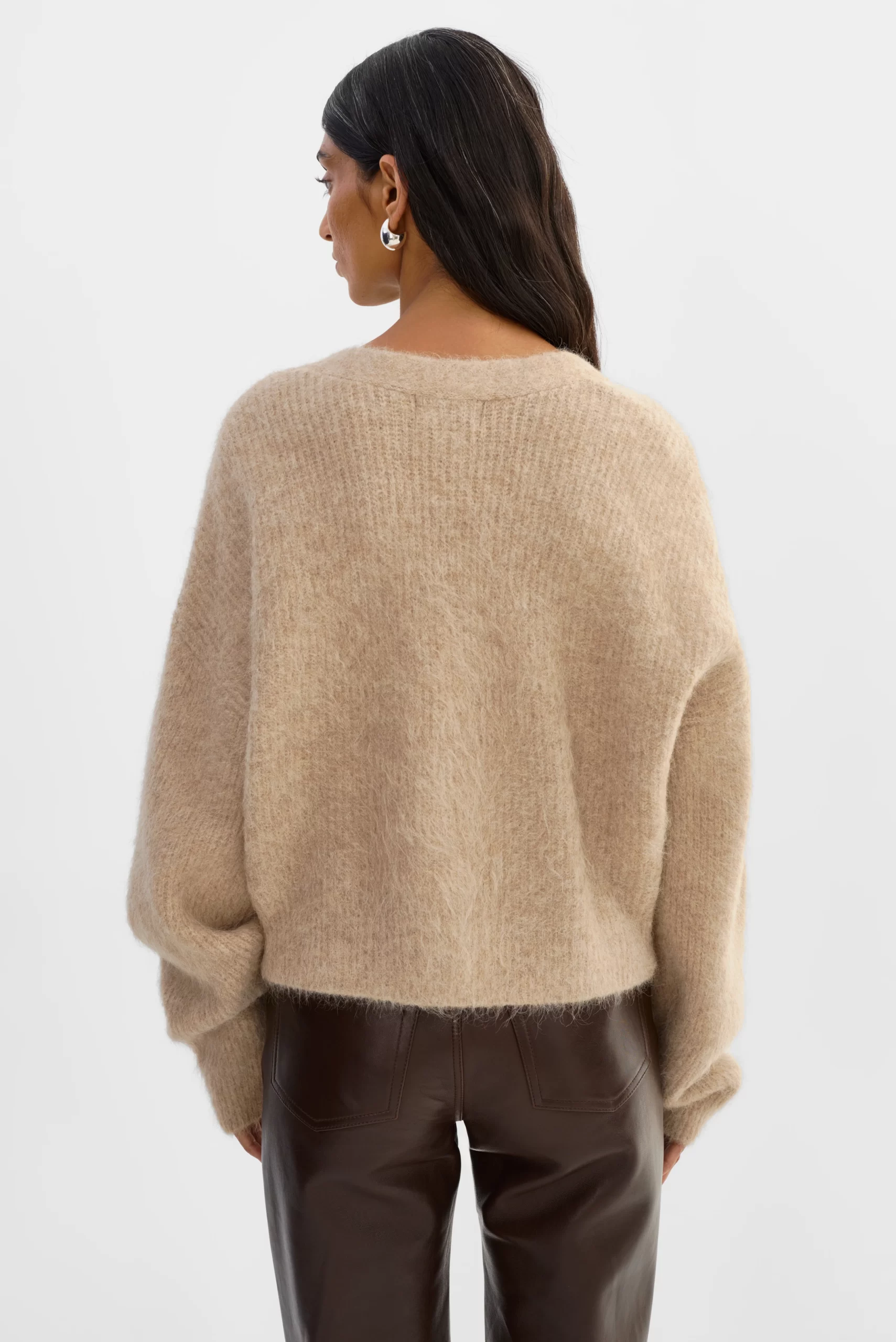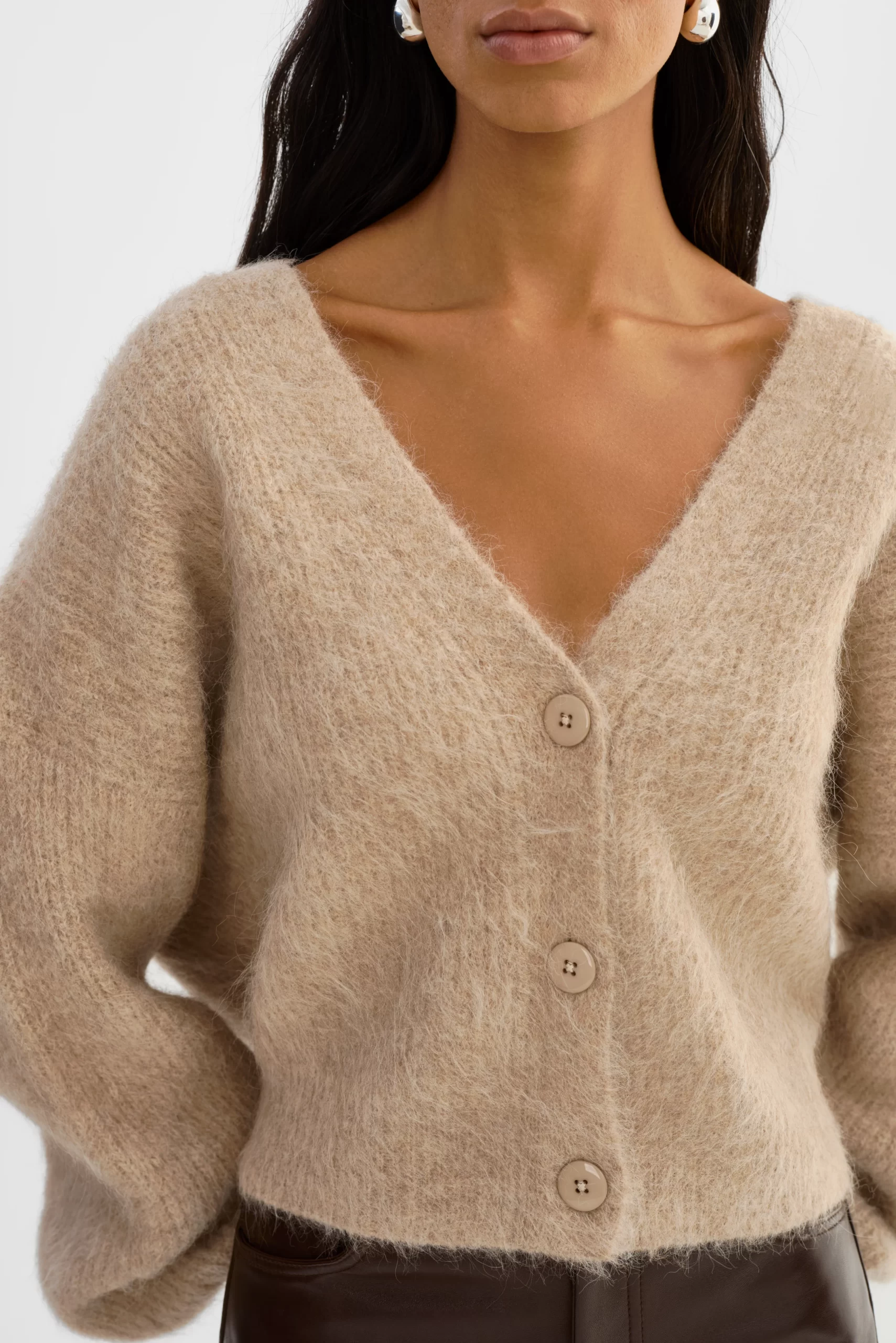 The MINNIE Knit Cardigan blends softness and structure in the most effortless way. Made from a cozy brushed alpaca knit, it features a deep V neckline, dropped shoulders, and a slightly cropped silhouette. Finished with tonal buttons and wide sleeves, it’s your new go-to for layering with ease and texture.
