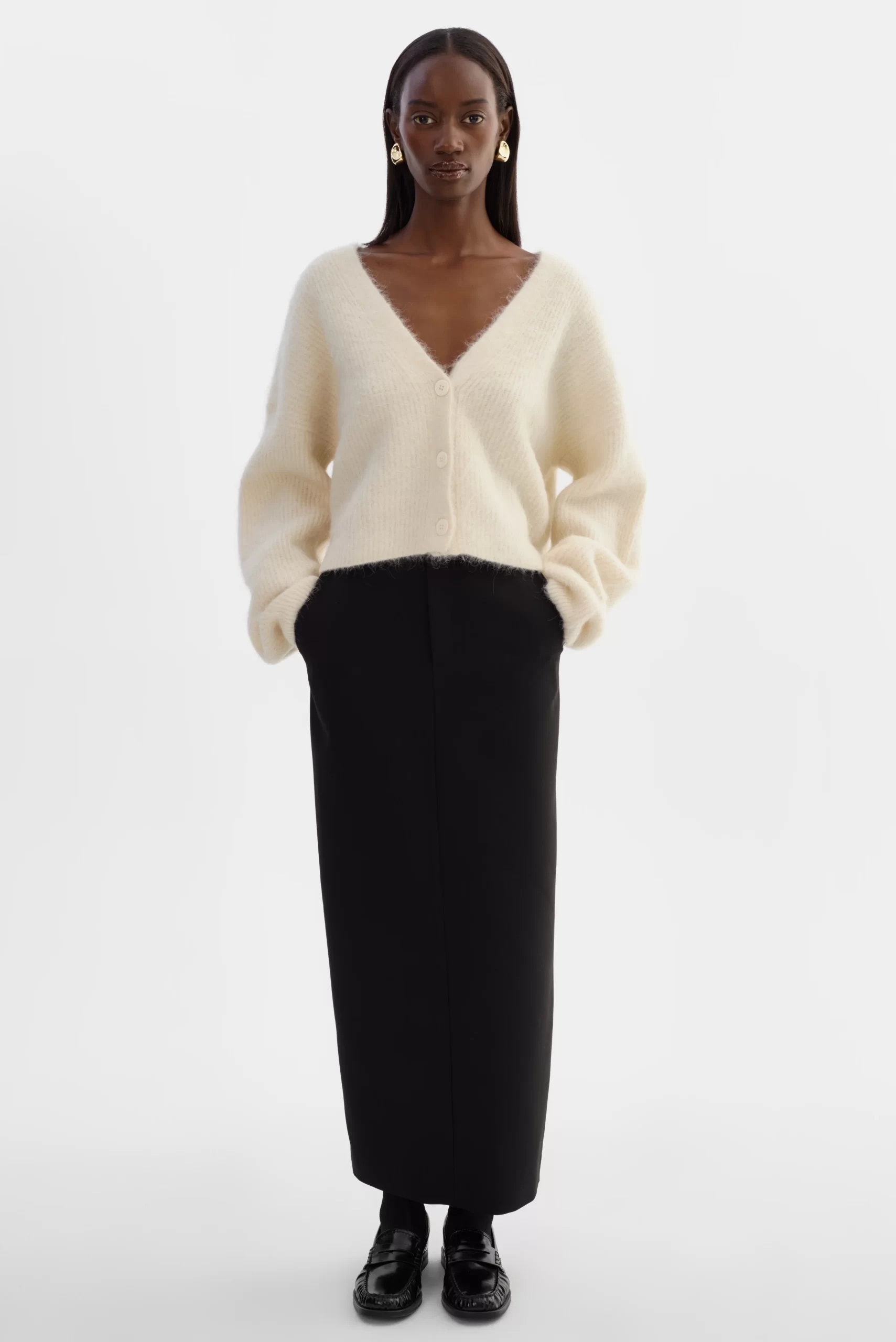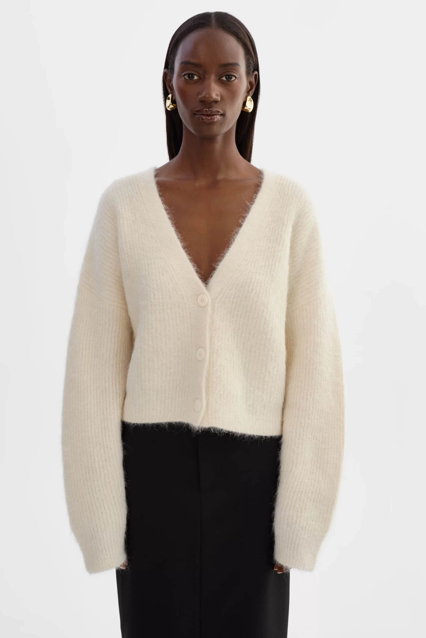The MINNIE Knit Cardigan blends softness and structure in the most effortless way. Made from a cozy brushed alpaca knit, it features a deep V neckline, dropped shoulders, and a slightly cropped silhouette. Finished with tonal buttons and wide sleeves, it’s your new go-to for layering with ease and texture.