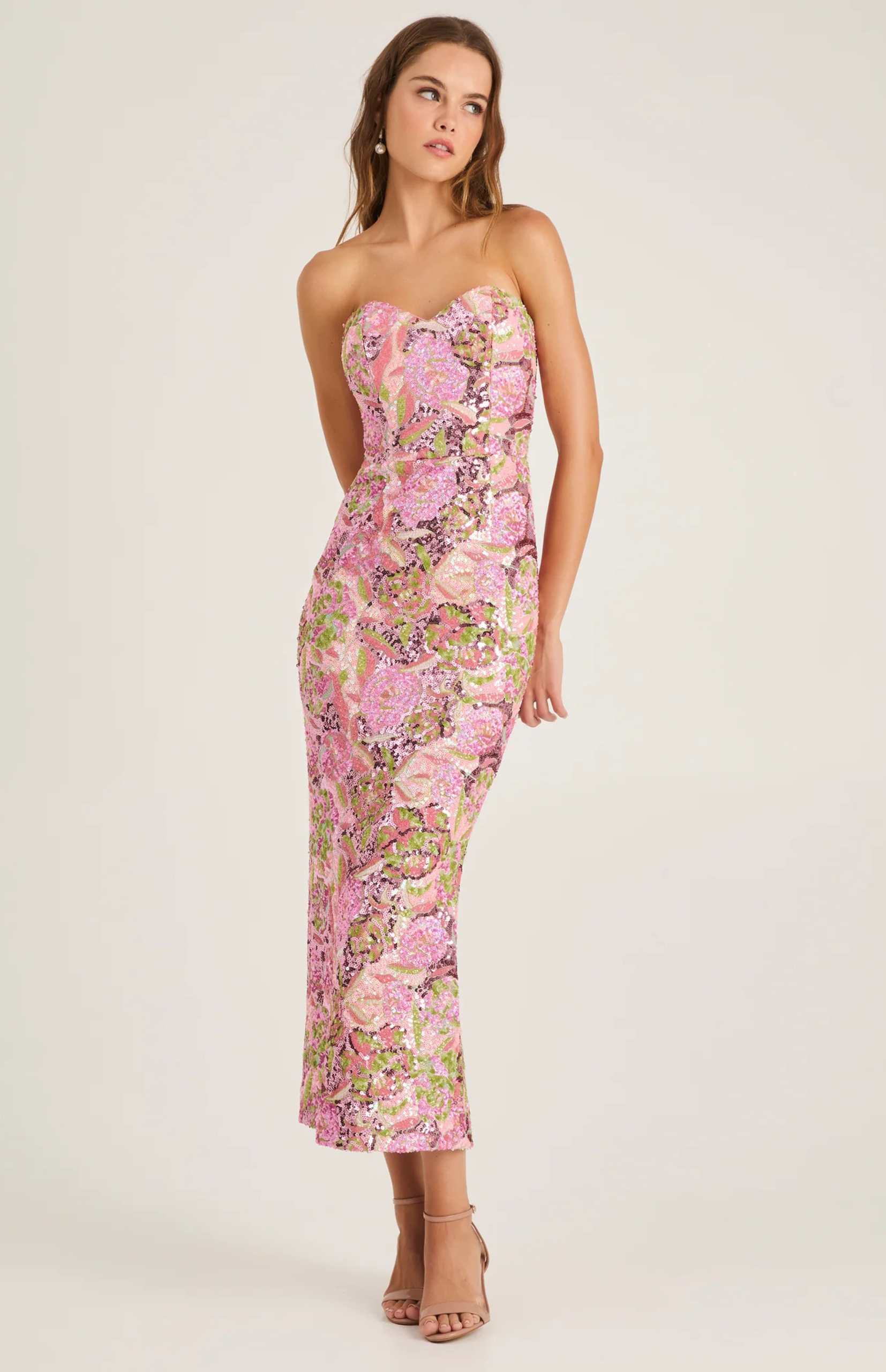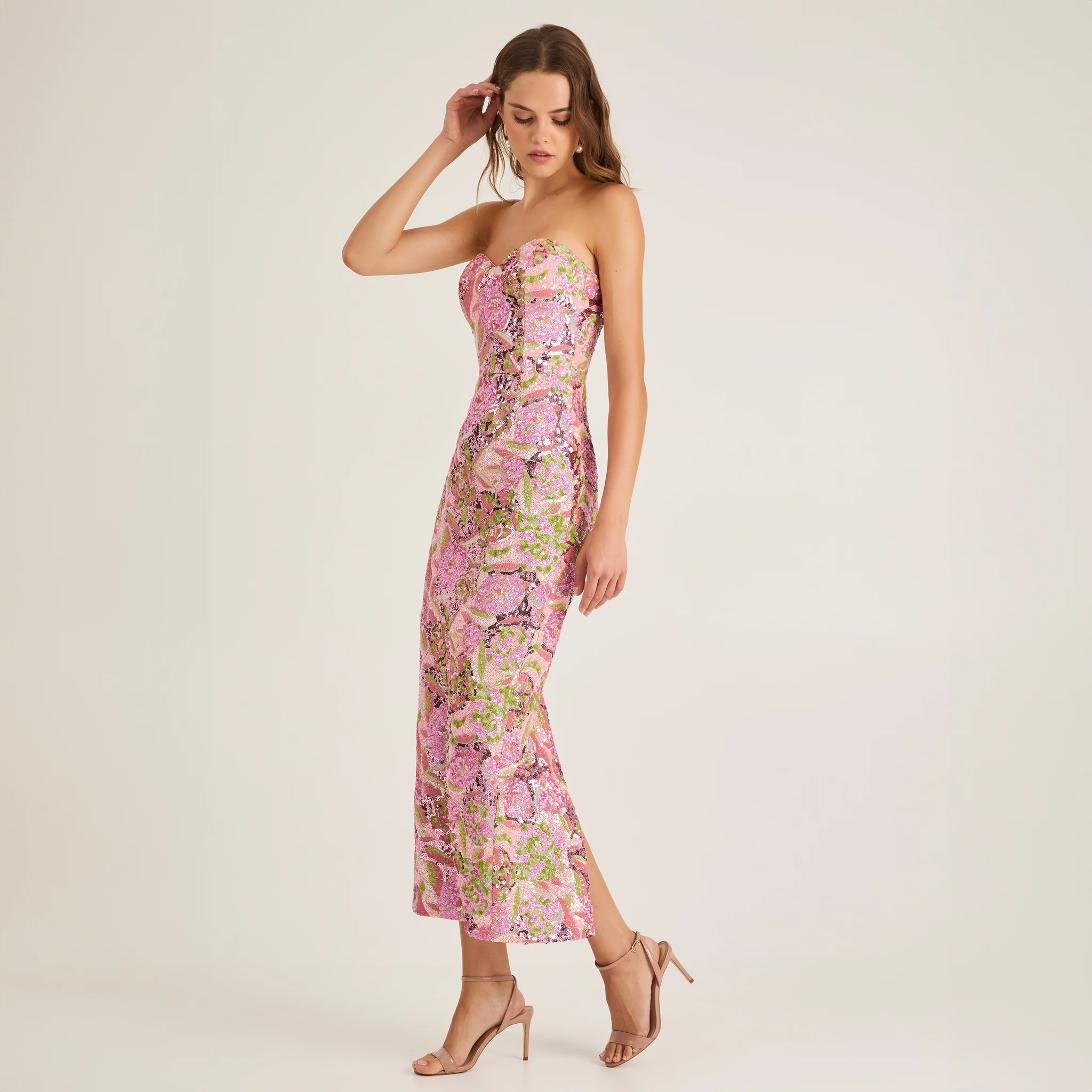 STRAPLESS SWEETHEART FLORAL SEQUIN GOWN