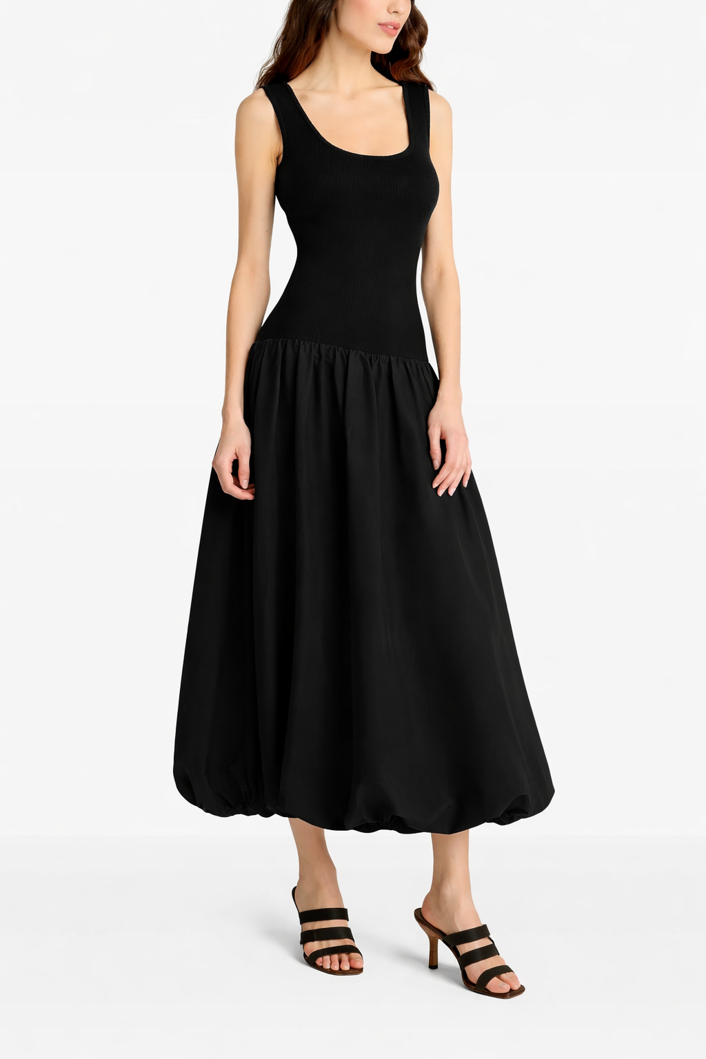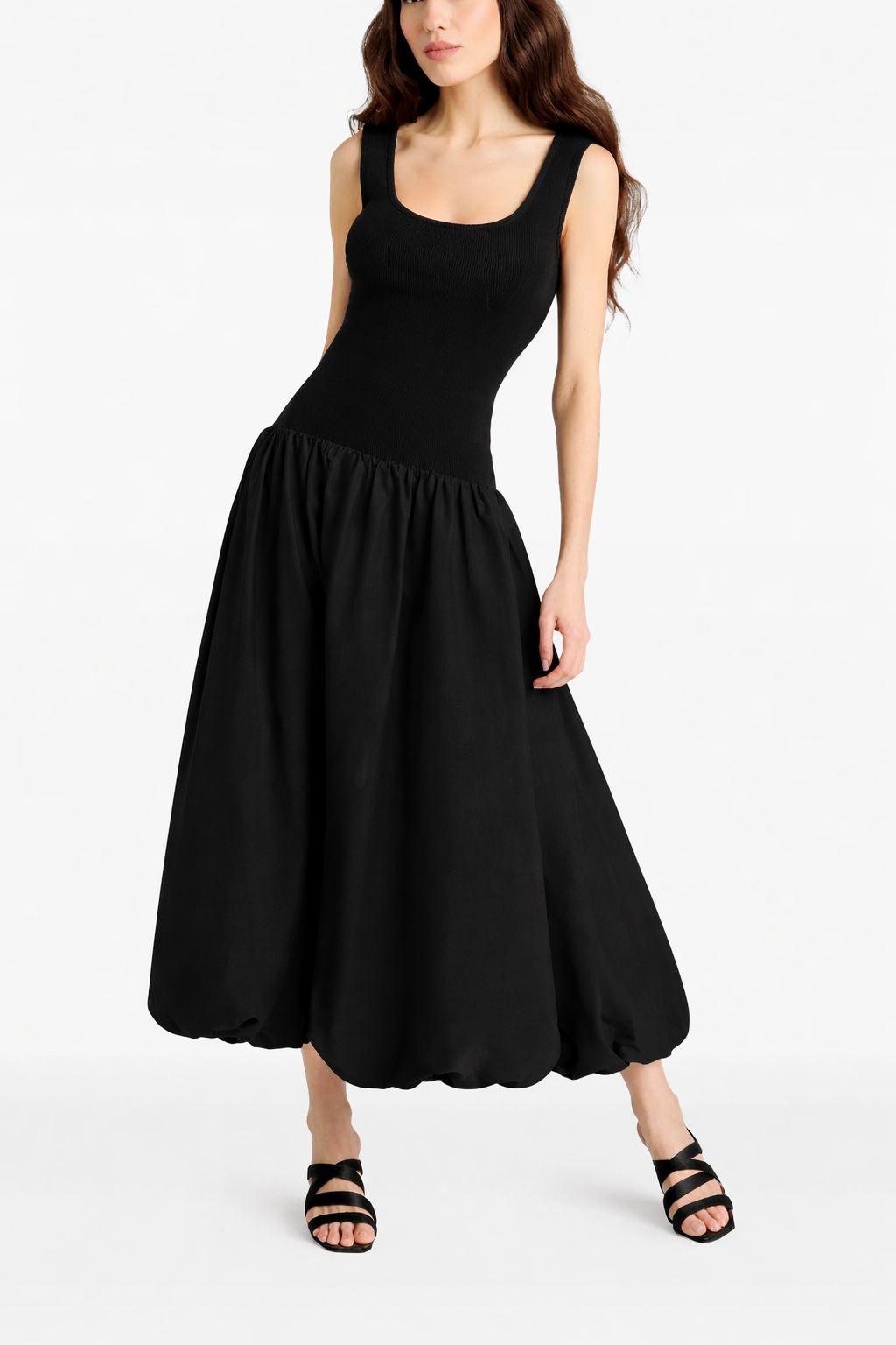 The Nera Dress combines a chic scoop neck and elegant midi length, making it ideal for seasonal transitions. Its silhouette offers versatility and comfort, effortlessly adapting to warmer and cooler days.