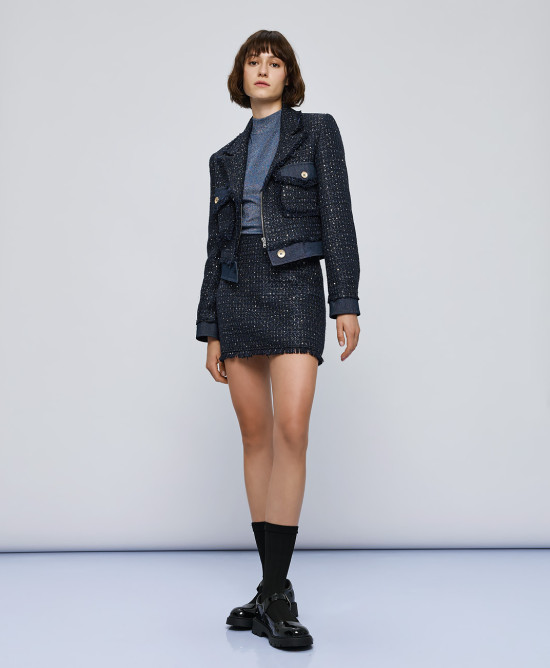Cropped tweed blazer with lurex details, sequins and denim-effect elements. It features a notched lapel collar, front flap pockets and padded shoulders. Pair it with the matching skirt from our collection for stylish and impressive looks.