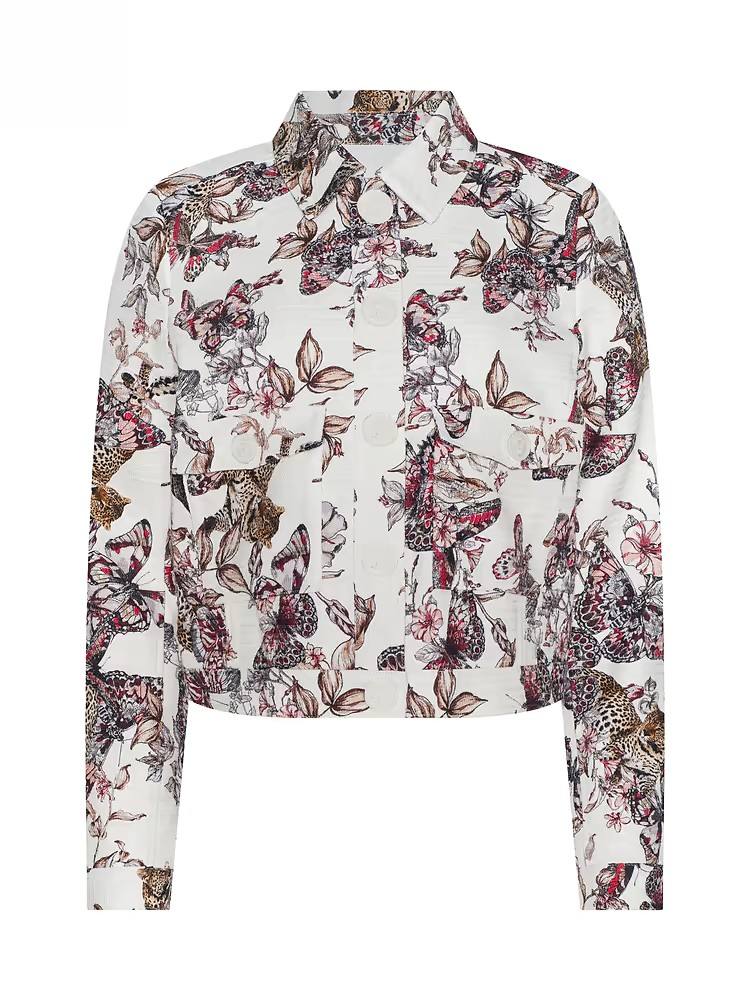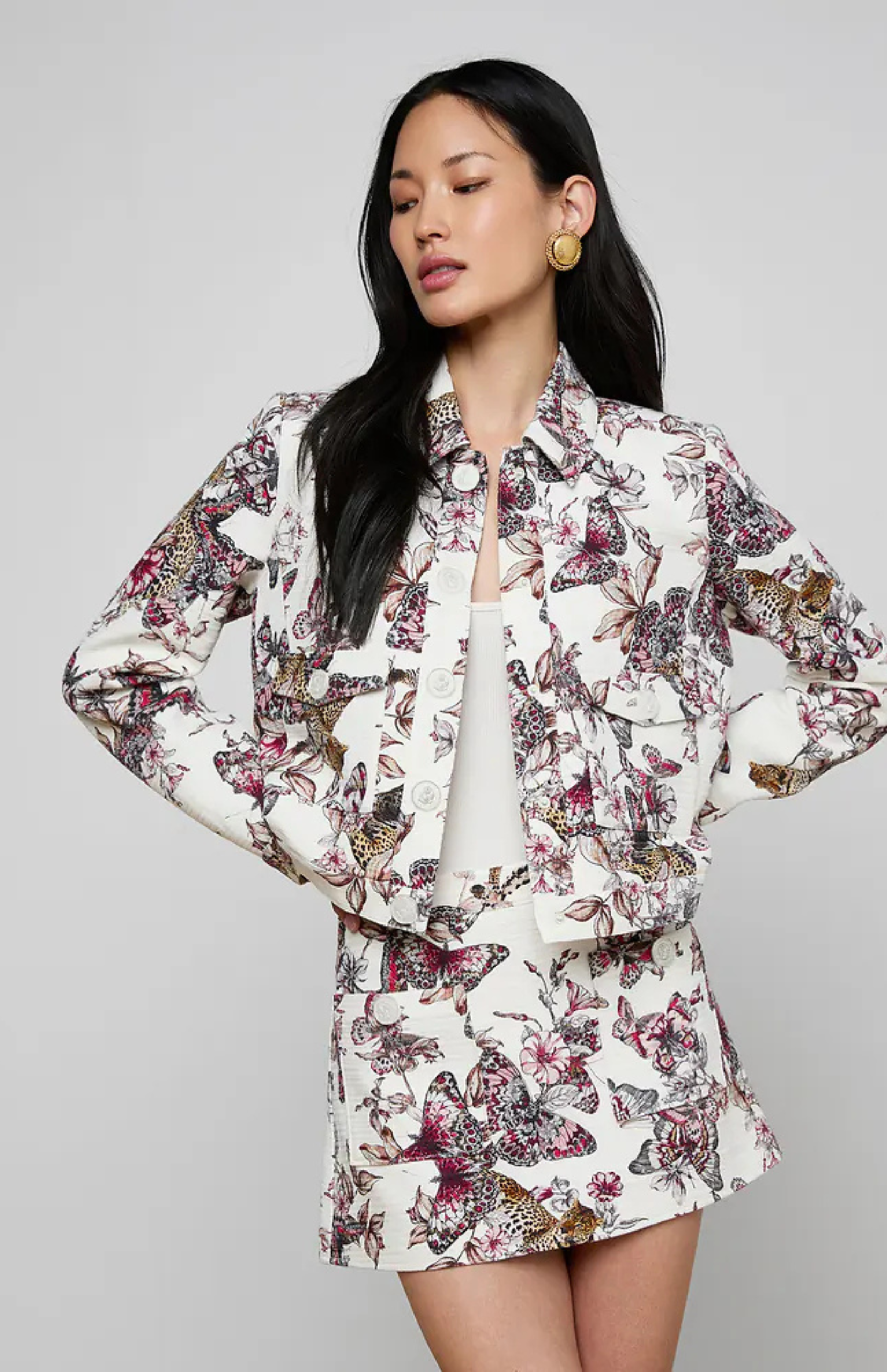 An essential layer in a bold butterfly jungle print. A cool, relaxed fit makes the Nyx jacket an easy essential with personality. Wear it with your favorite jeans and tee or pair it with the matching mini skirt for maximum impact.