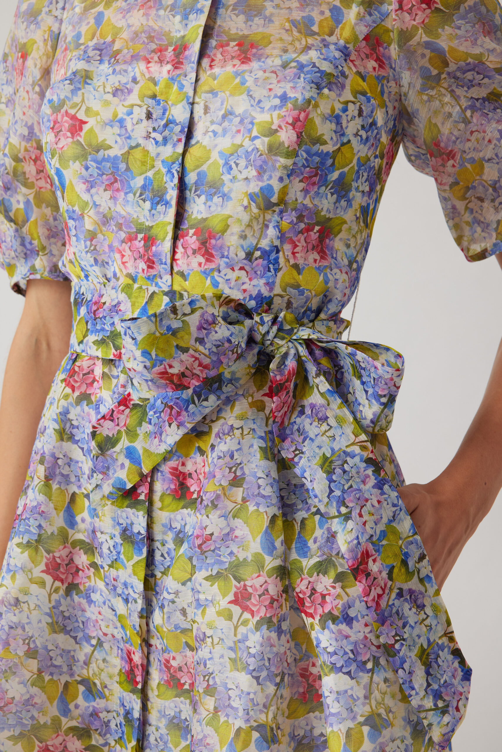 Gracefully tailored with a romantic sensibility, this silk linen shirtwaist dress features a soft floral print that brings dimension and movement to the design. The collared neckline and short puff sleeves offer a polished balance of structure and femininity, while the removable sash defines the waist for a flattering fit. Finished with a tea length A line skirt, this style transitions effortlessly from daytime celebrations to elegant afternoon events. Ideal for garden parties, weddings, and special occasions that call for timeless charm.