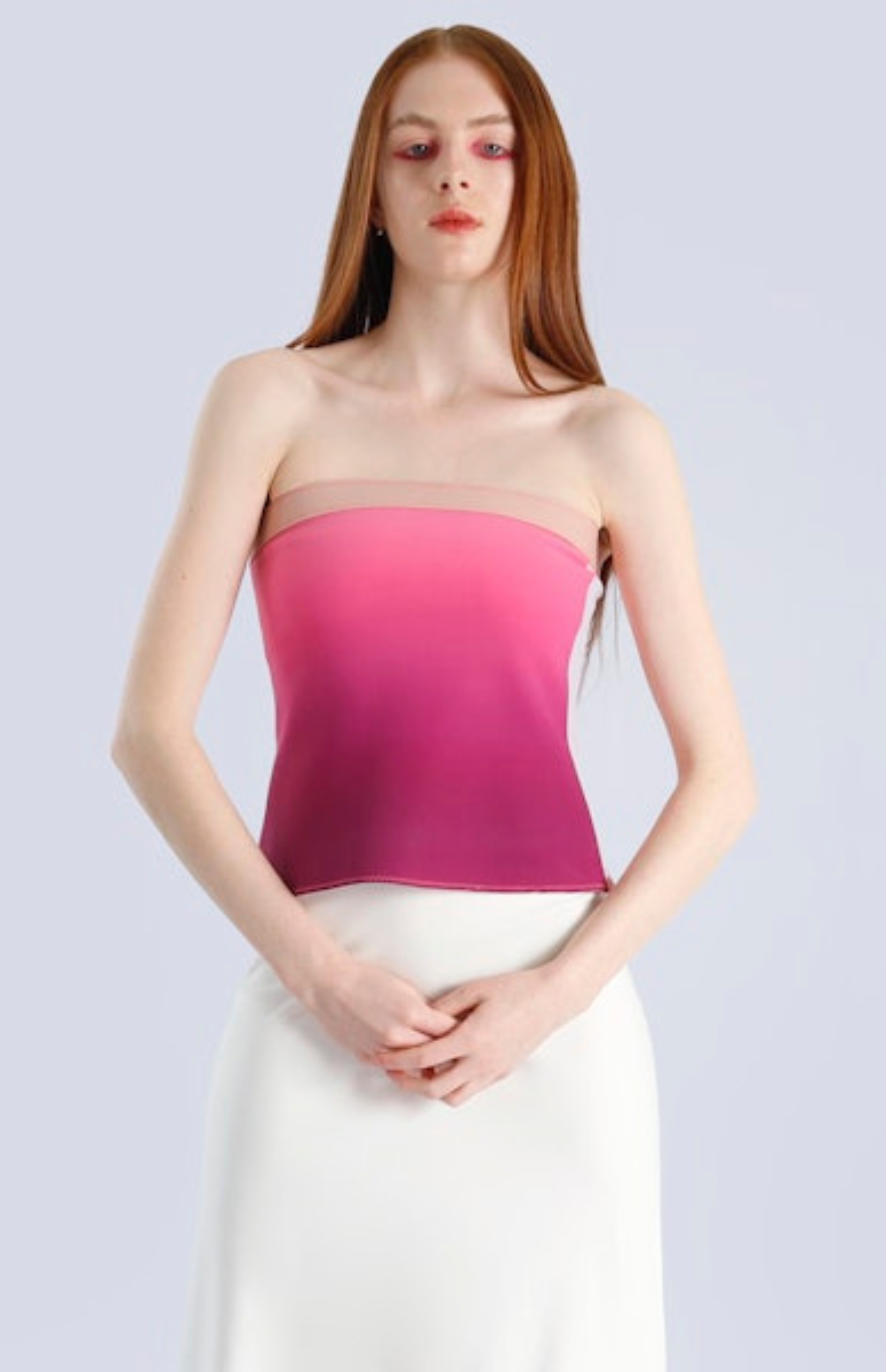 The Osmara Top is a sleek, strapless silhouette that embodies modern elegance. Crafted in Canada from luxurious stretch fabrics, it features a smooth gradient effect that transitions beautifully from soft rose to rich magenta. The structured yet flexible fit sculpts the body while offering comfort and ease of movement. Perfect for evening looks or layered under tailored pieces, the Osmara Top adds a bold, sophisticated statement to any outfit.