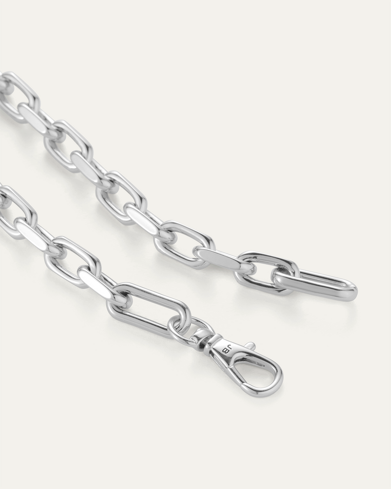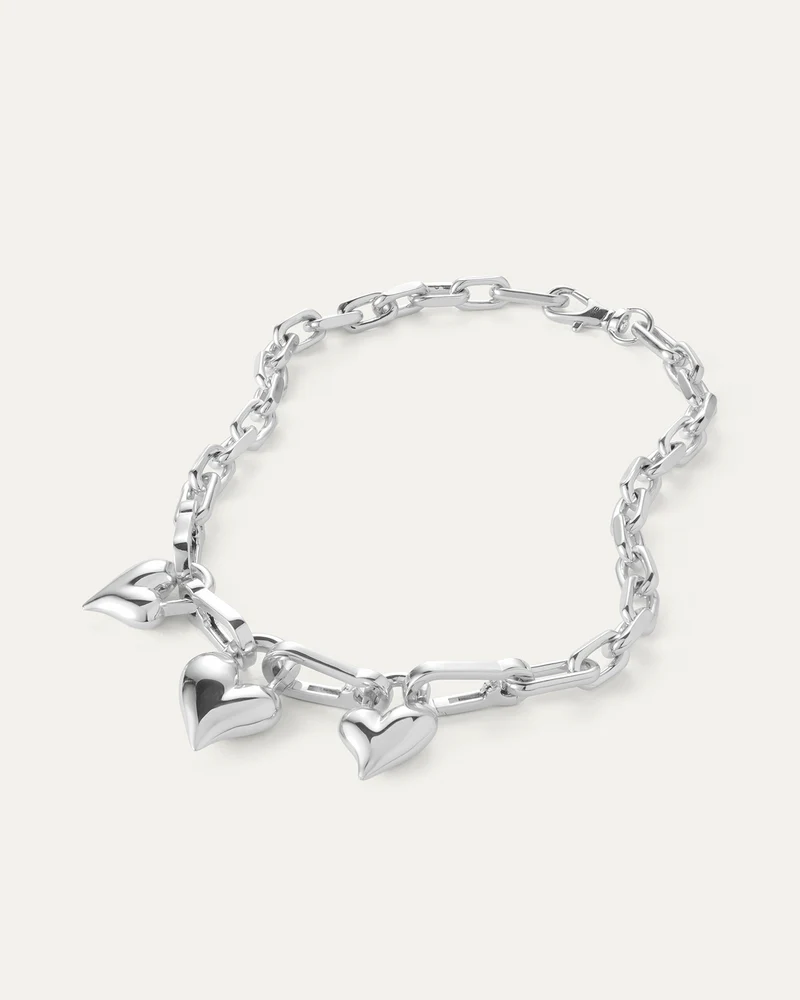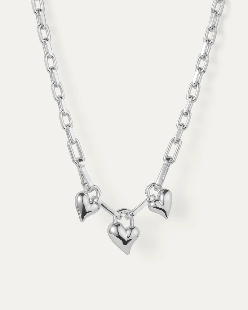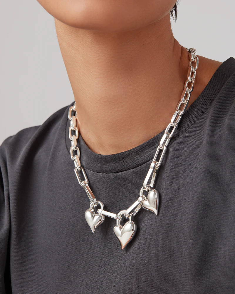 Three removable hearts are hooked onto crisp, faceted links. Play around with this chain to achieve different looks: remove one, two or all three hearts using the mini carabiner clasps, or split the chain in half to use it as a bag charm or keychain. Finished in high-polish silver.