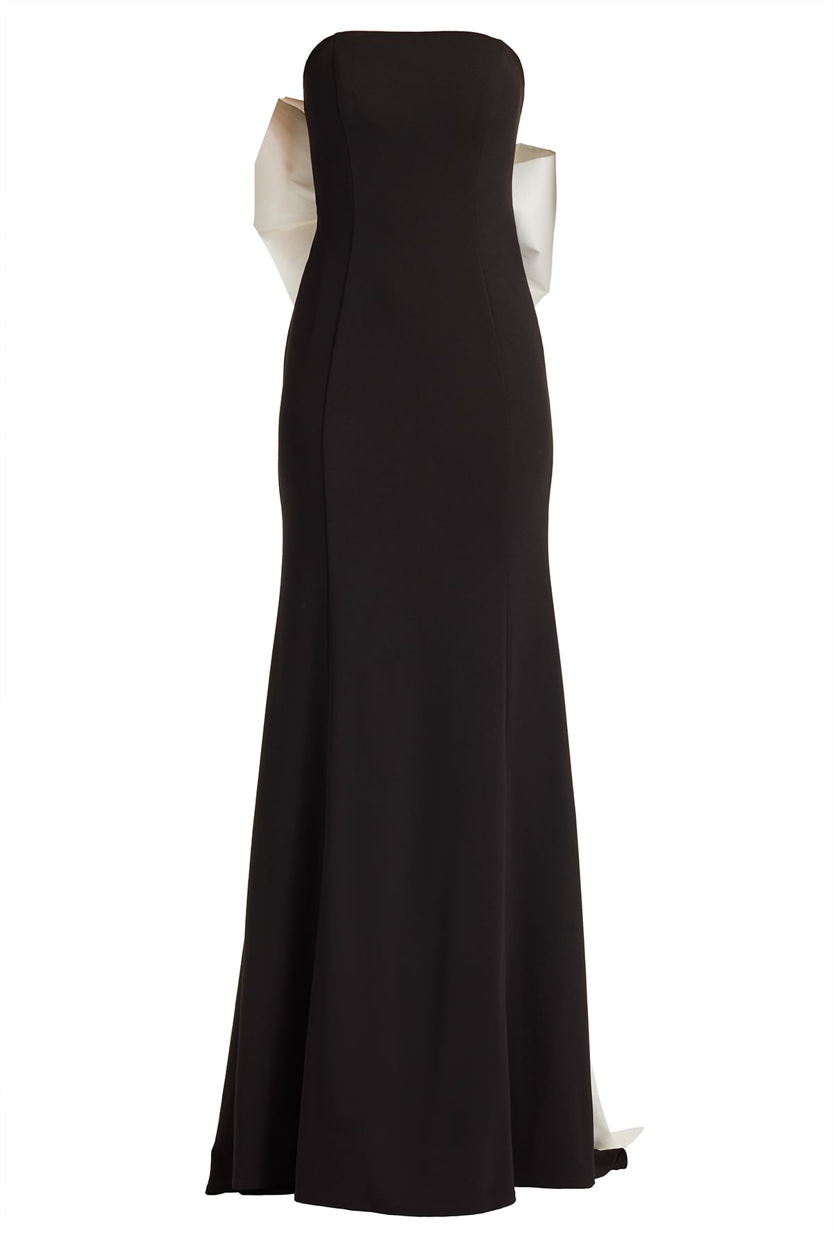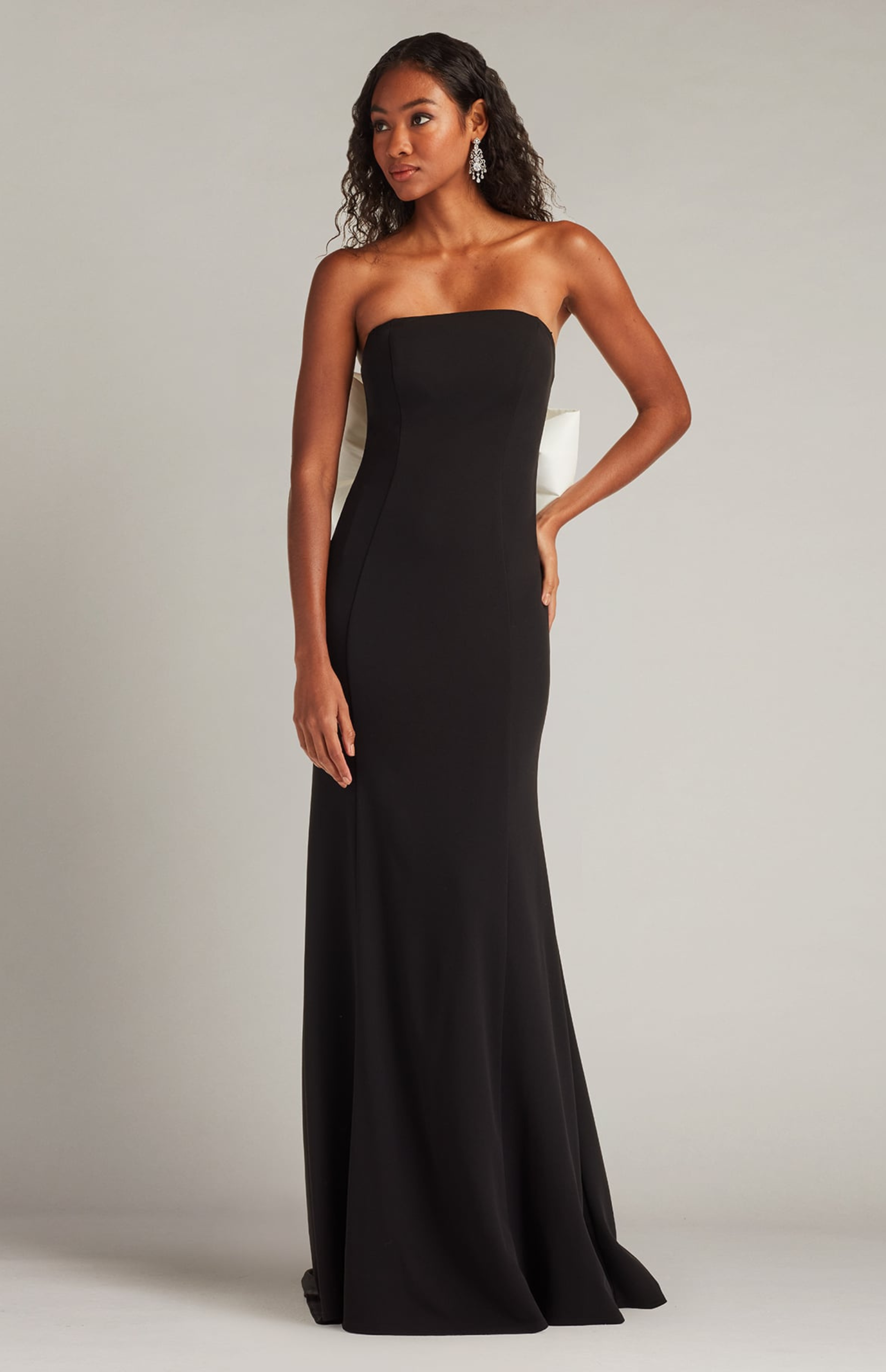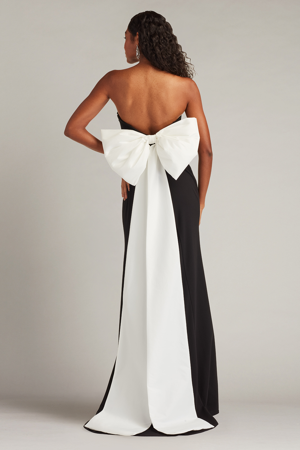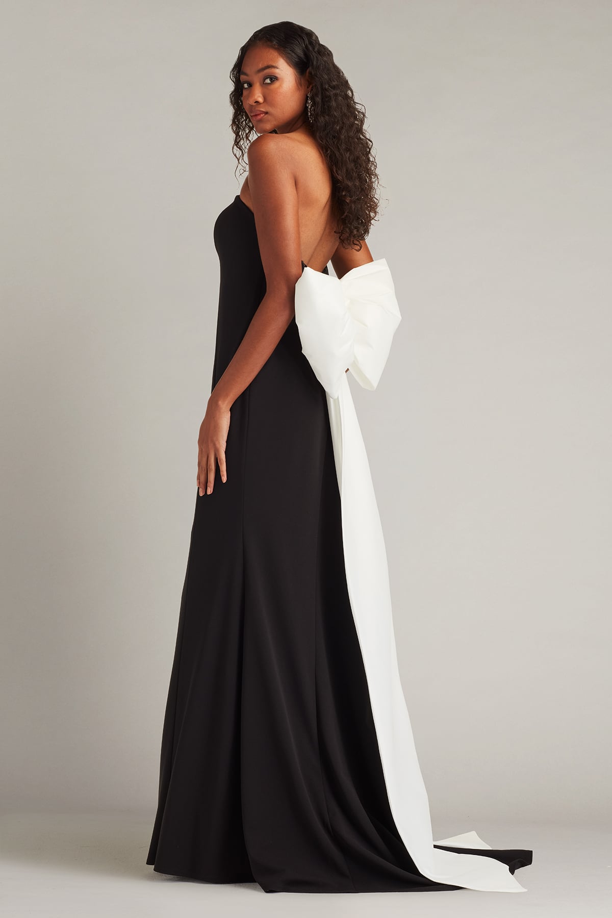 This strapless gown is designed with timeless elegance and modern restraint. Crafted from textured crepe, it features clean, sculpting seams that define the silhouette and a floor-length skirt that falls with graceful ease. A statement bow at the back adds a refined focal point, bringing softness and drama to an otherwise streamlined design. Sophisticated and confident, this gown is made for moments that call for quiet impact.