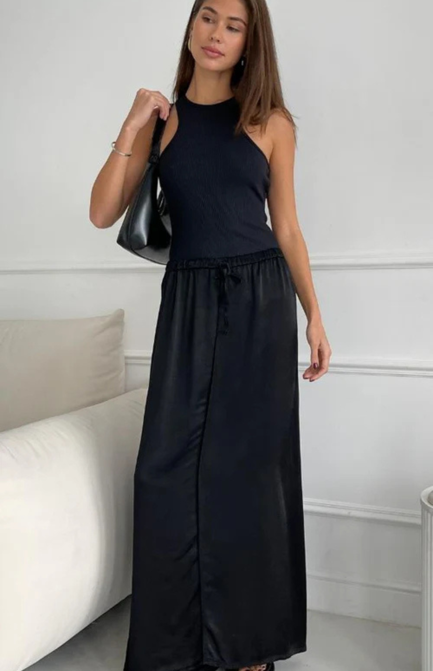 Phoebe is an on trend elasticated maxi skirt in a soft satin fabric. Flowy with a luxe drape making it a perfect elevated essential this season. Versatile to team with any flat this season for a comfortable polished look