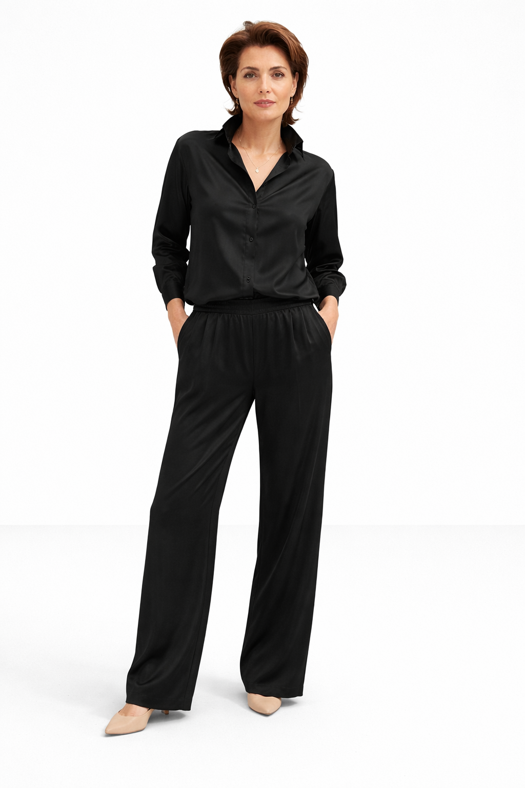 A modern essential, these wide-leg silk pants are crafted from 100% silk for an elevated take on everyday ease. Designed with a clean, streamlined silhouette, they feature a soft elastic waistband for comfort and ease of wear, along with functional side pockets. The fluid drape and subtle sheen create a flattering, elongated look, making them perfect for both casual styling and refined ensembles.