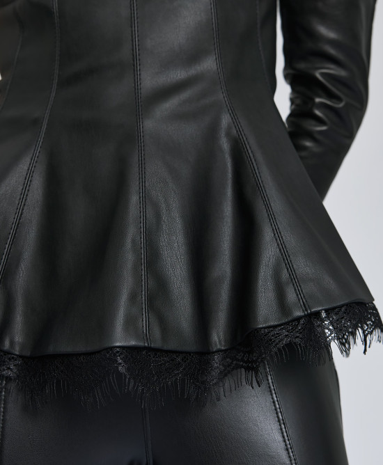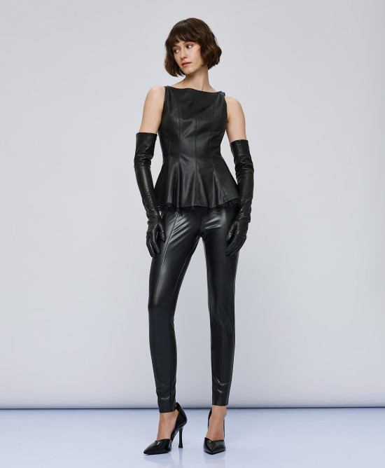 Sleeveless faux leather top with boat neckline and peplum hem. It features lace detail at the hem and back closure with a hidden zip. Pair it with the matching pants from our collection for impressive evening looks.